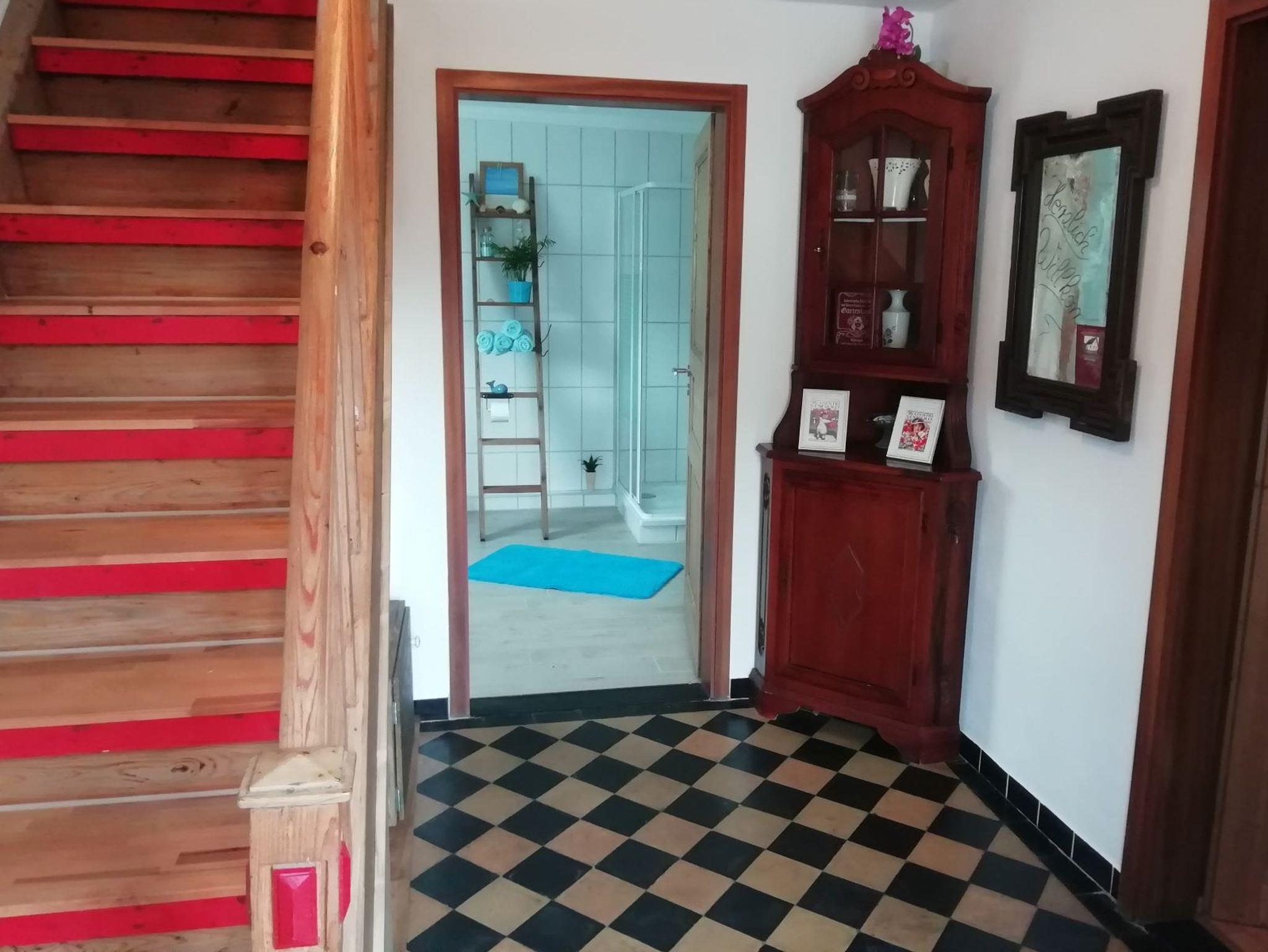 Im geräumigen Bad mit WC befindet sich eine Dusche mit niedrigem Einstieg und eine Waschmaschine. Pro Person finden Sie ein Duschtuch und ein Handtuch zu Ihrer Verfügung.