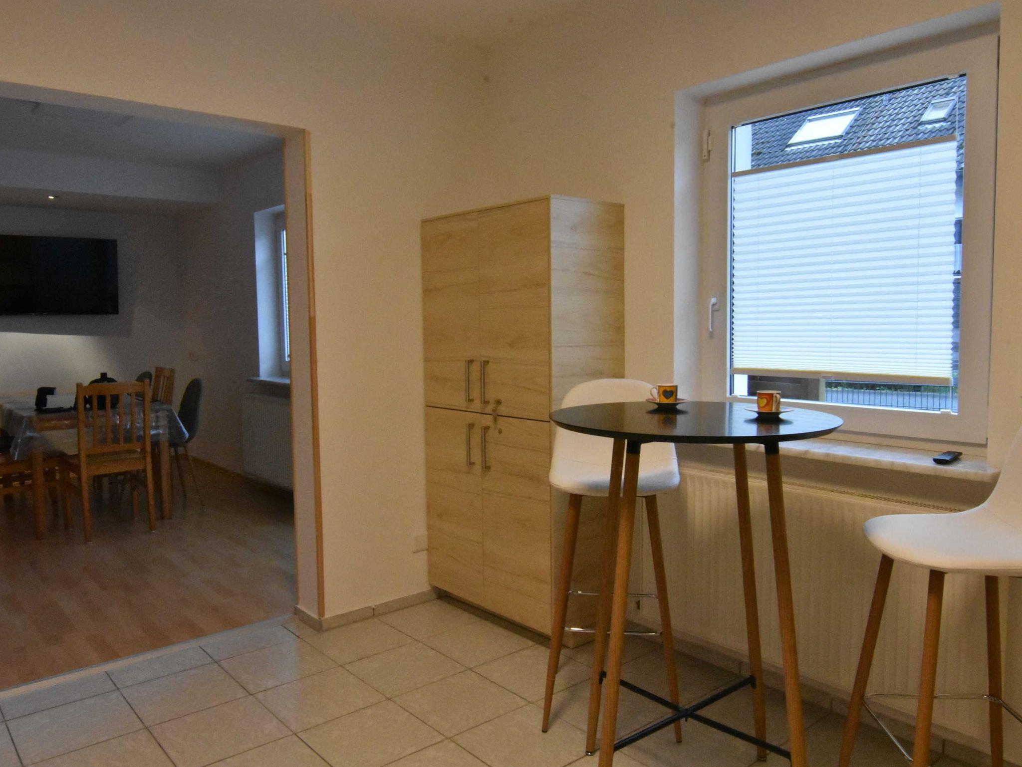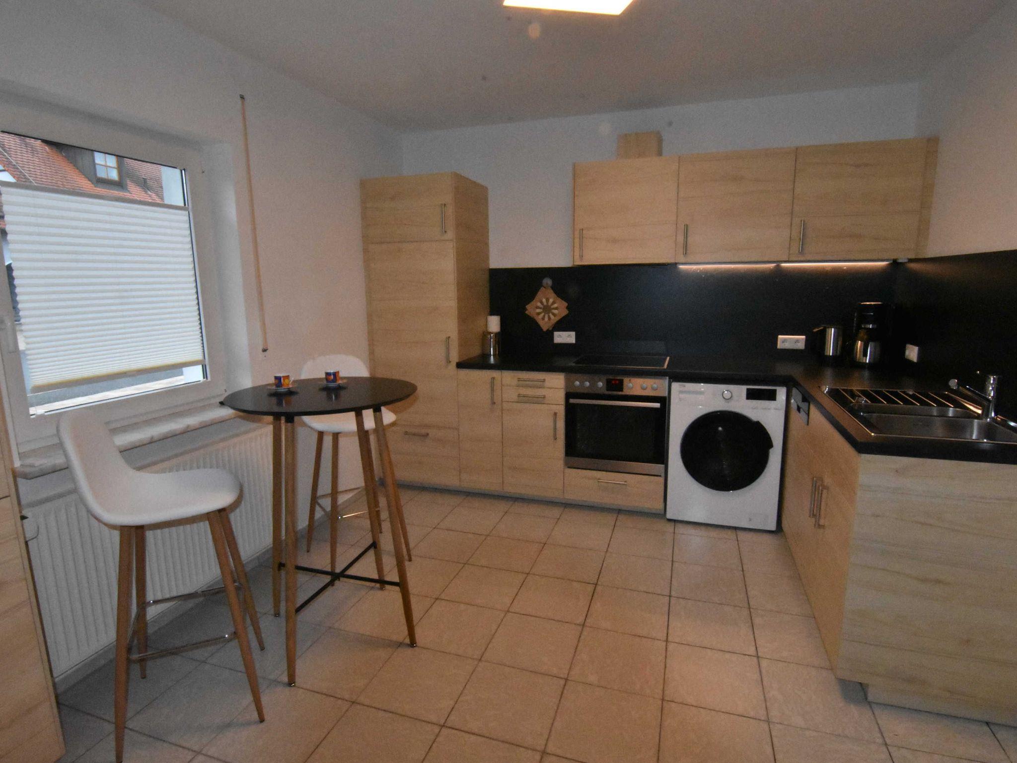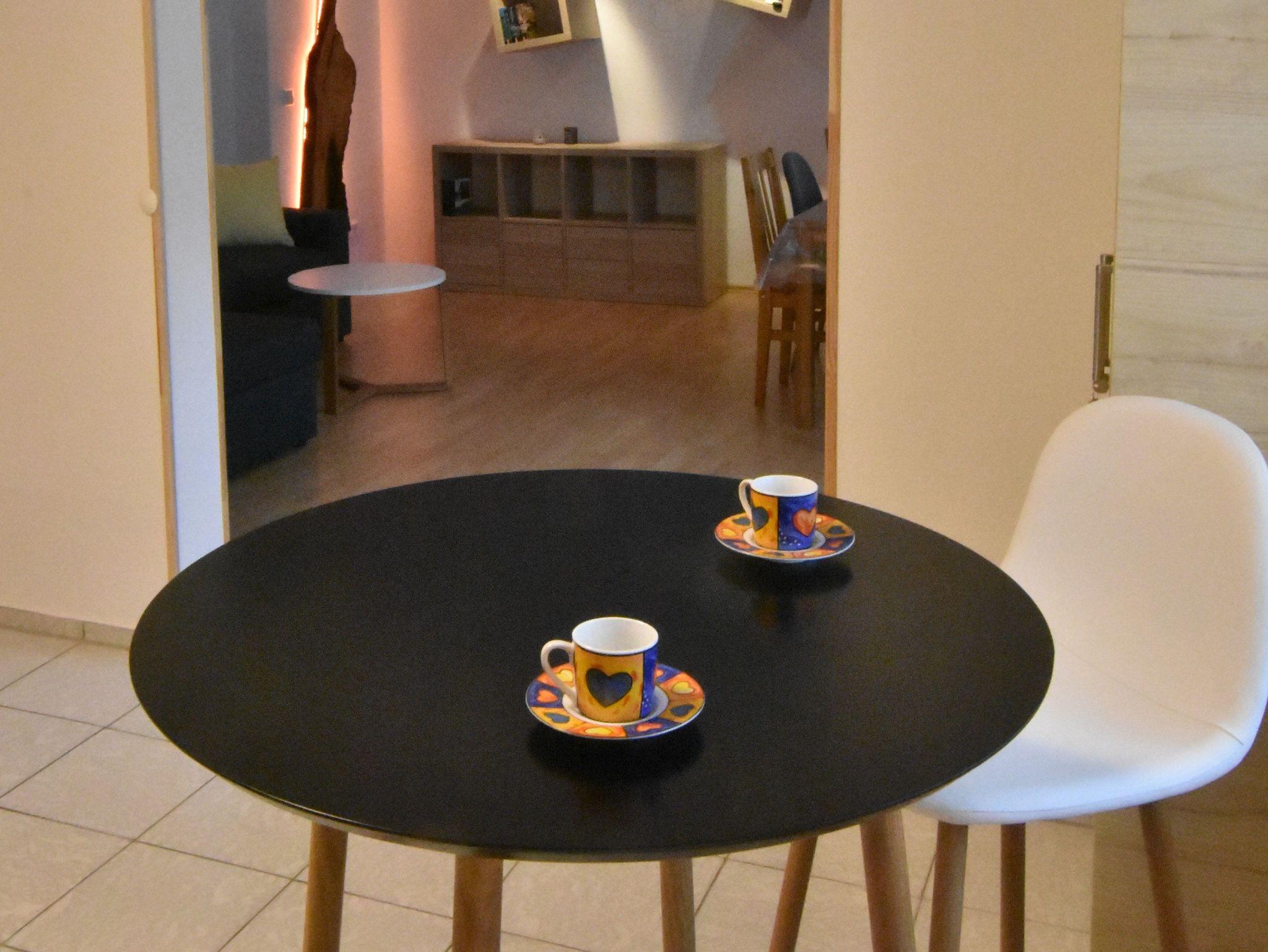 Die modern eingerichtete Küche beinhaltet einen Kühlschrank mit Gefrierfach, einen Herd mit Backofen, einen Geschirrspüler und eine Waschmaschine mit Trocknerfunktion. Die eingerichtete Terrasse erreicht man direkt über den Wohnraum. Verschiedene Lichteffekte sowie einige Holzelemente runden die neu renovierte Wohnung ab.