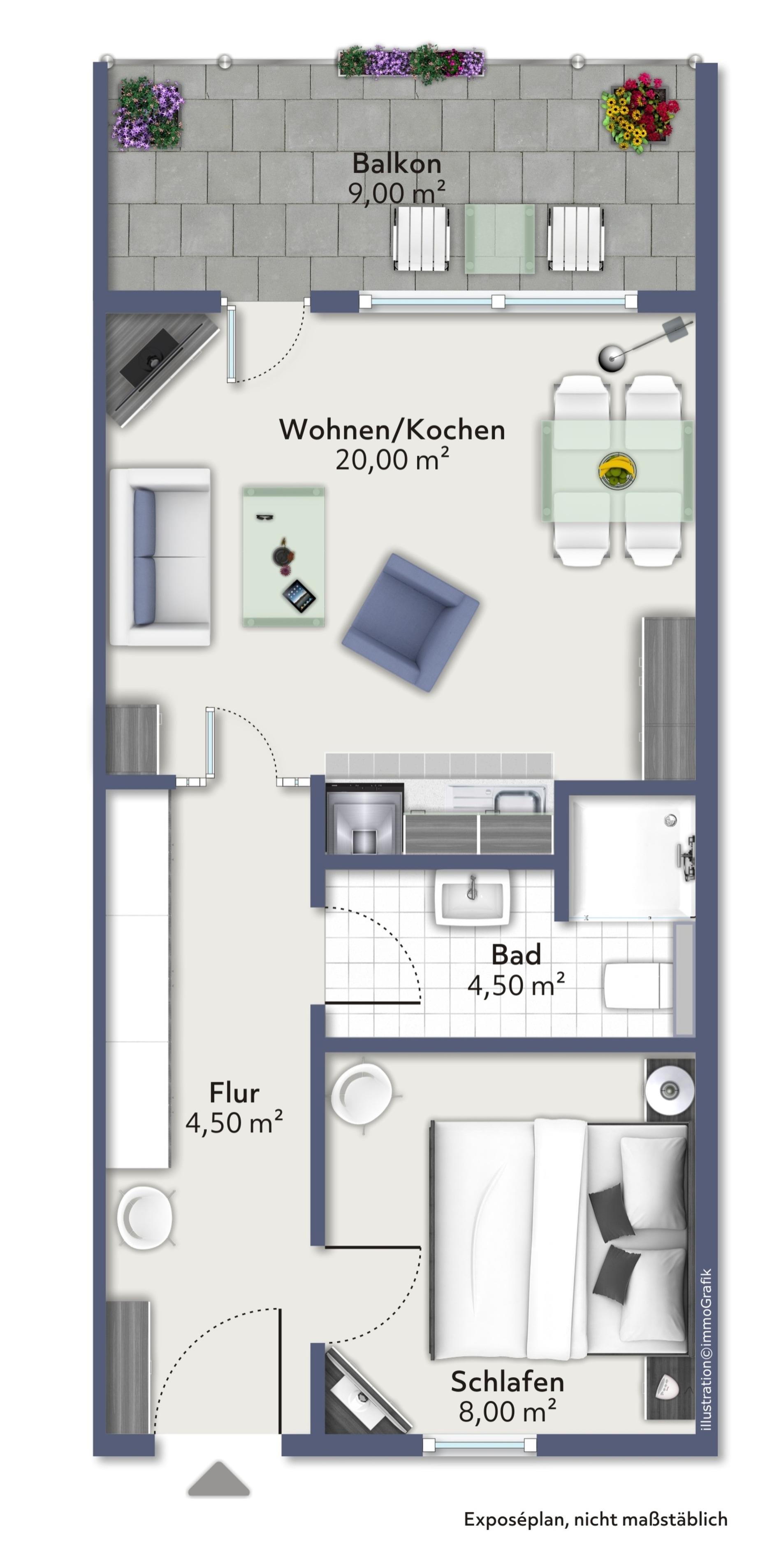 Die gemütliche und komfortable 43 qm Ferienapartment befindet sich in Hochparterre mit Balkon, mit einem entspannten Blick in den Garten und Weitblick auf die Ostsee. Beim Betreten der Wohnung empfängt Sie ein langer Flur, mit viel Staufläche und von dem alle Räume abgehen. Im Wohnzimmer lässt sich alles vereinbaren. Essen, Kochen, Relaxen, Entspannen. Die offen Küche verfügt über eine Einbauküche, in der Sie alle Dinge für den täglichen Gebrauch finden. Ein großer Esstisch bietet viel Platz zum Essen. Die Couch zum Relaxen, bietet auch als Schlafcouch Platz für getrenntes Schlafen. Im Schlafzimmer steht ein (Doppelbett je 90x200 Matratzen) Das innenliegende Badezimmer ist modern gefliest und verfügt über eine Dusche. Die Symbole vom Wohngrundriss können in der Darstellung von der tatsächlichen Innen- und Außengestaltung der Wohnung abweichen!