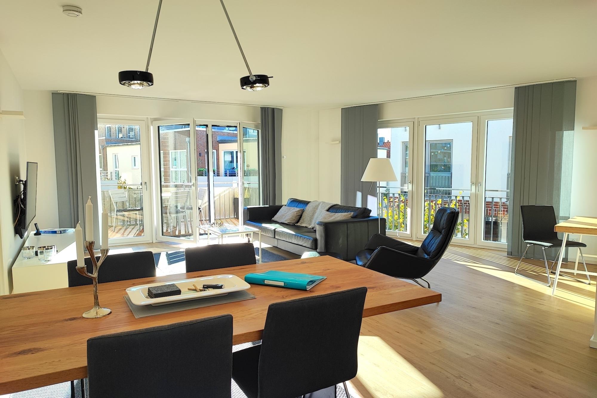 Der offene, mit bodentiefen Fenstern umgebene Wohn- und Essbereich, mit voll ausgestatteter Küche, la¨dt zum gemeinsamen Entspannen und Kochen ein! Die Ferienwohnung verfügt u¨ber einen Balkon mit Zugang vom Schlafzimmer und Wohnzimmer. Ein Schlafzimmer wurde mit einem modernen Doppelbett (180x200), einem Kleiderschrank und einem TV-Gerät ausgestattet. Im zweiten Schlafzimmer stehen sich zwei Einzelbetten (90x200) und zwei Kommoden. Mit Blick aus dem Fenster schauen Sie auf das Hafenwasserbecken Promenadeseite. Die Dusche im Badezimmer ist ebenerdig und eine Badewanne lädt zur Entspannung ein. Die komplette Wohnung ist mit Vinylboden und Fußbodenheizung ausgestattet. Zusätzliches: Gäste-WC. Die im 1. Stock des Appartementhauses gelegene Ferienwohnung kann ''barrierefrei'' über einen Aufzug, mit direktem Zugang aus der Tiefgarage erreicht werden. Die Symbole vom Wohngrundriss können in der Darstellung von der tatsächlichen Innen- und Außengestaltung der Wohnung abweichen!