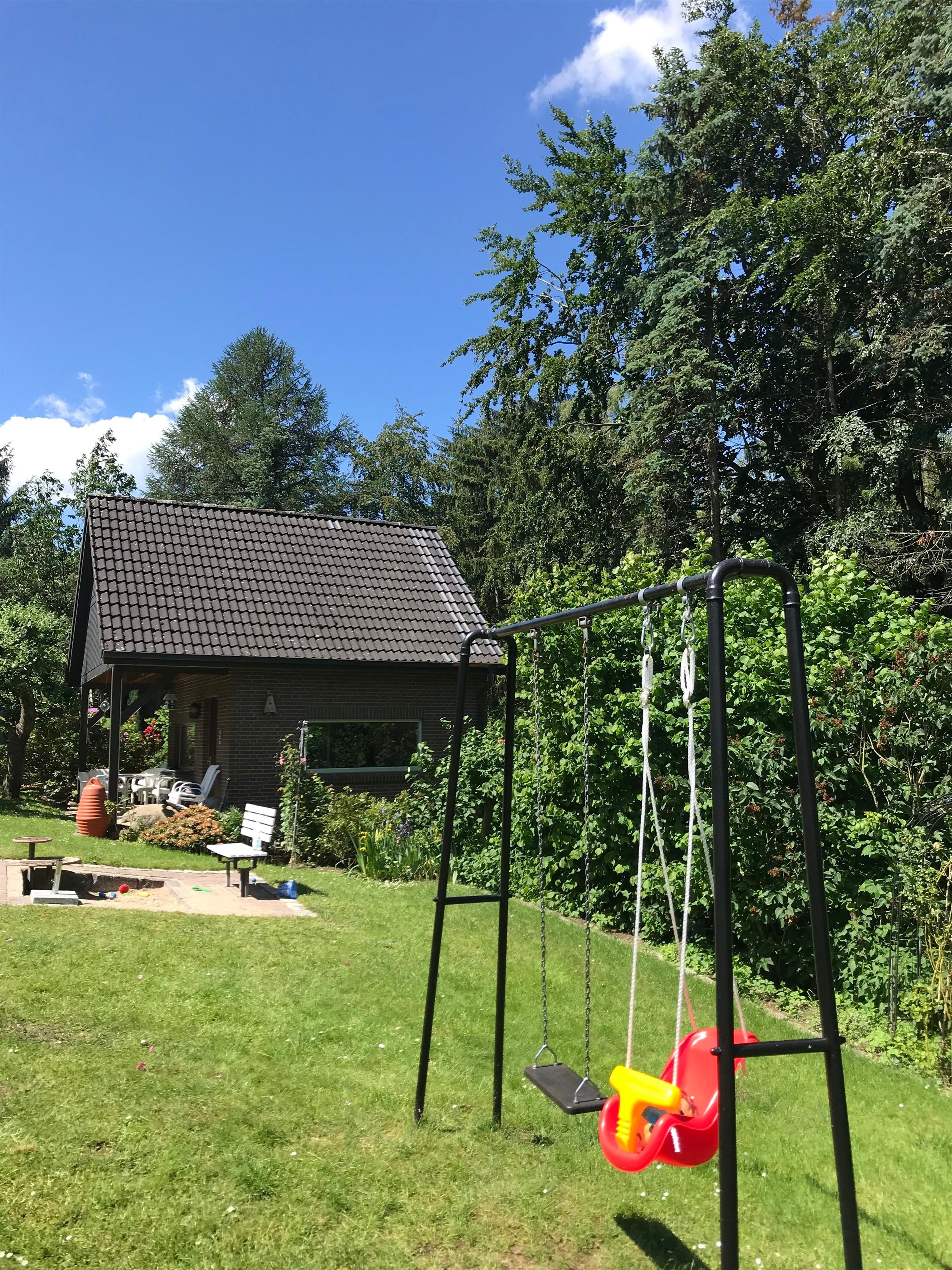 Für unsere kleinen Gäste haben wir eine Sandkiste, eine Schaukel und ein Wipptier - und reichlich Auslauf zum Toben und Spielen auf unserem großen Rasen – sicher eingezäunt und abseits der Strasse.