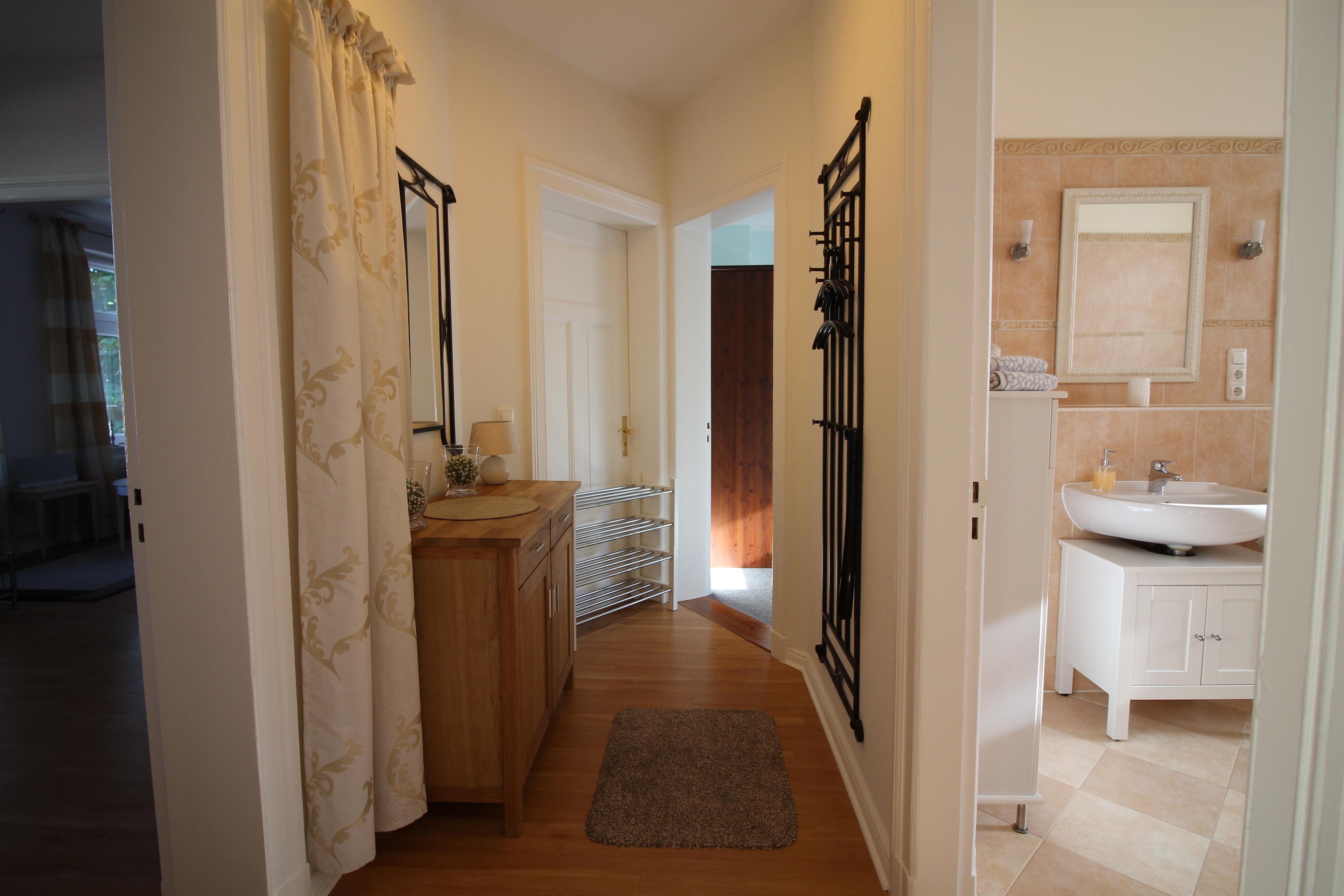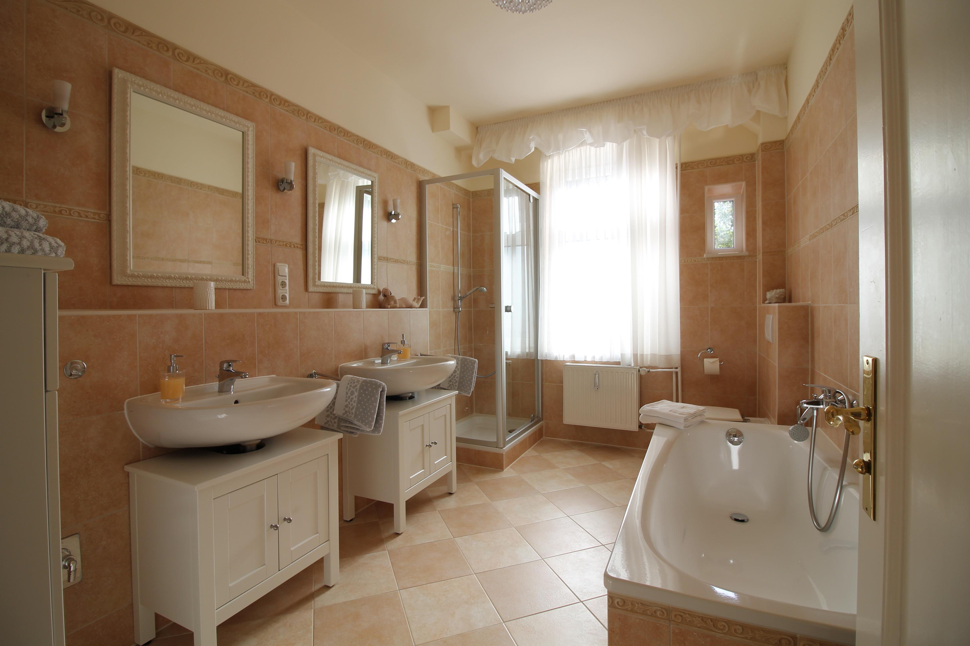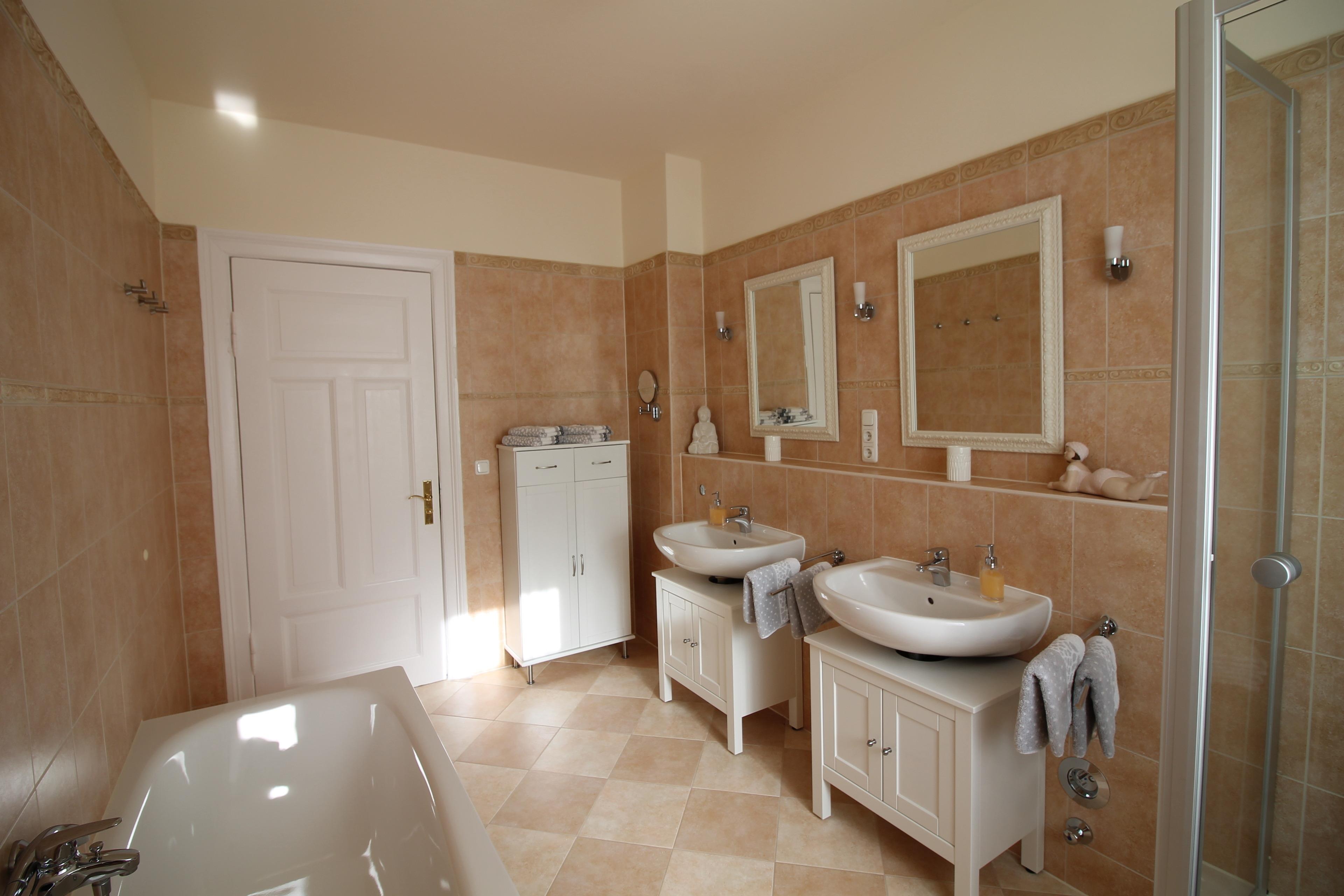 Vollbad mit Dusche, Badewanne, 2 Waschbecken, WC, Föhn