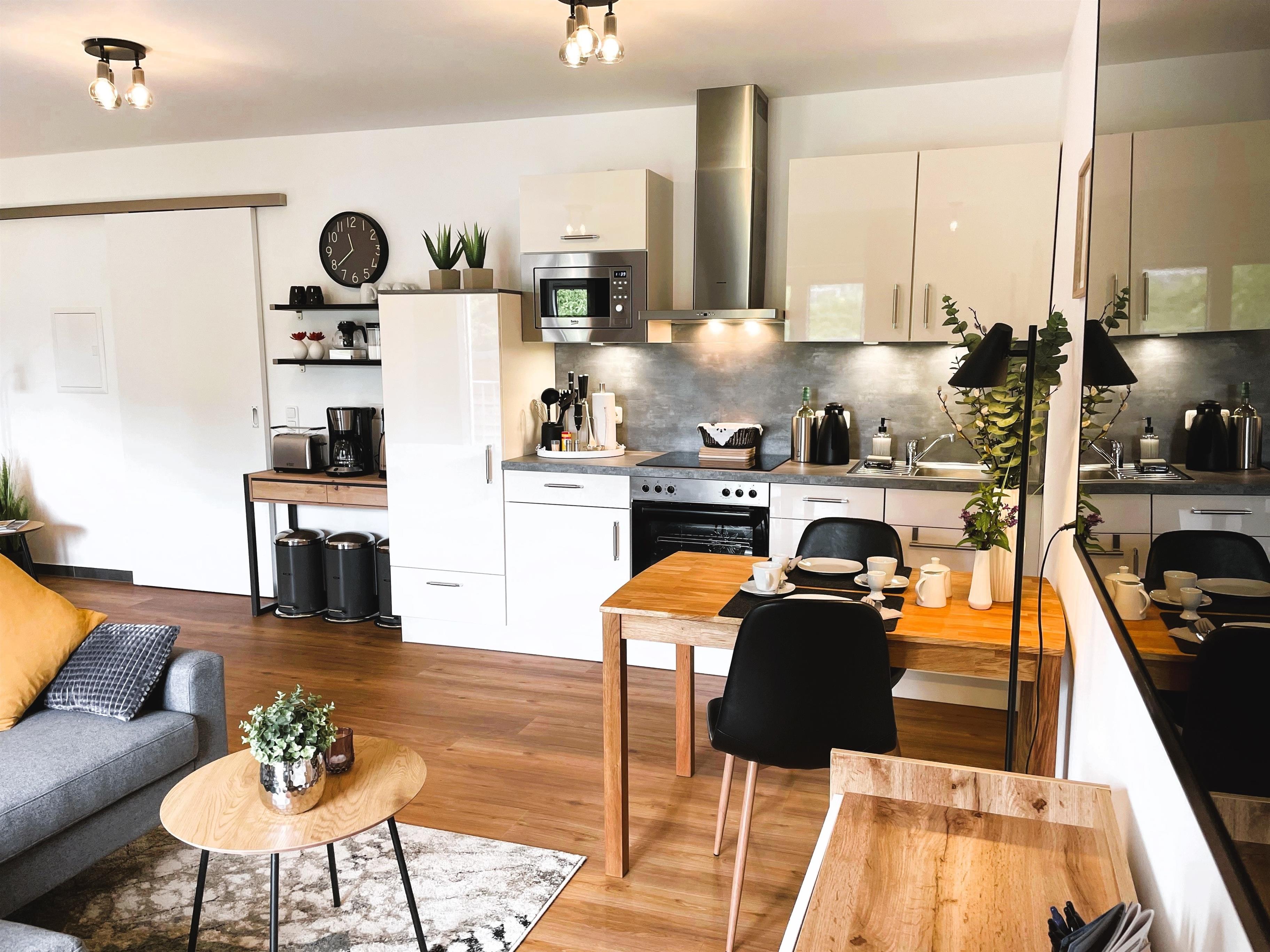 Eine geschützte , kleine Terrasse und eine neue , moderne Wohnung mit einem Blick auf einen schönen Garten.
