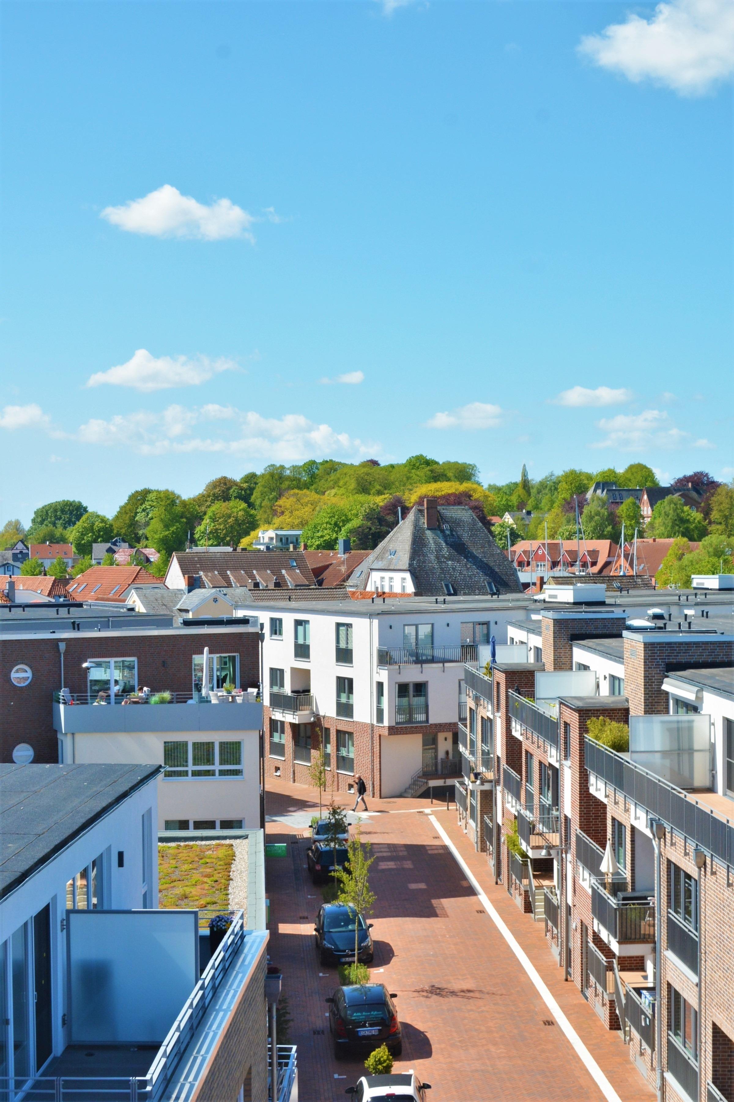 Genießen Sie das maritime Ambiente des Apartments 38 mit Blick über die Dächer der Hafenspitze.