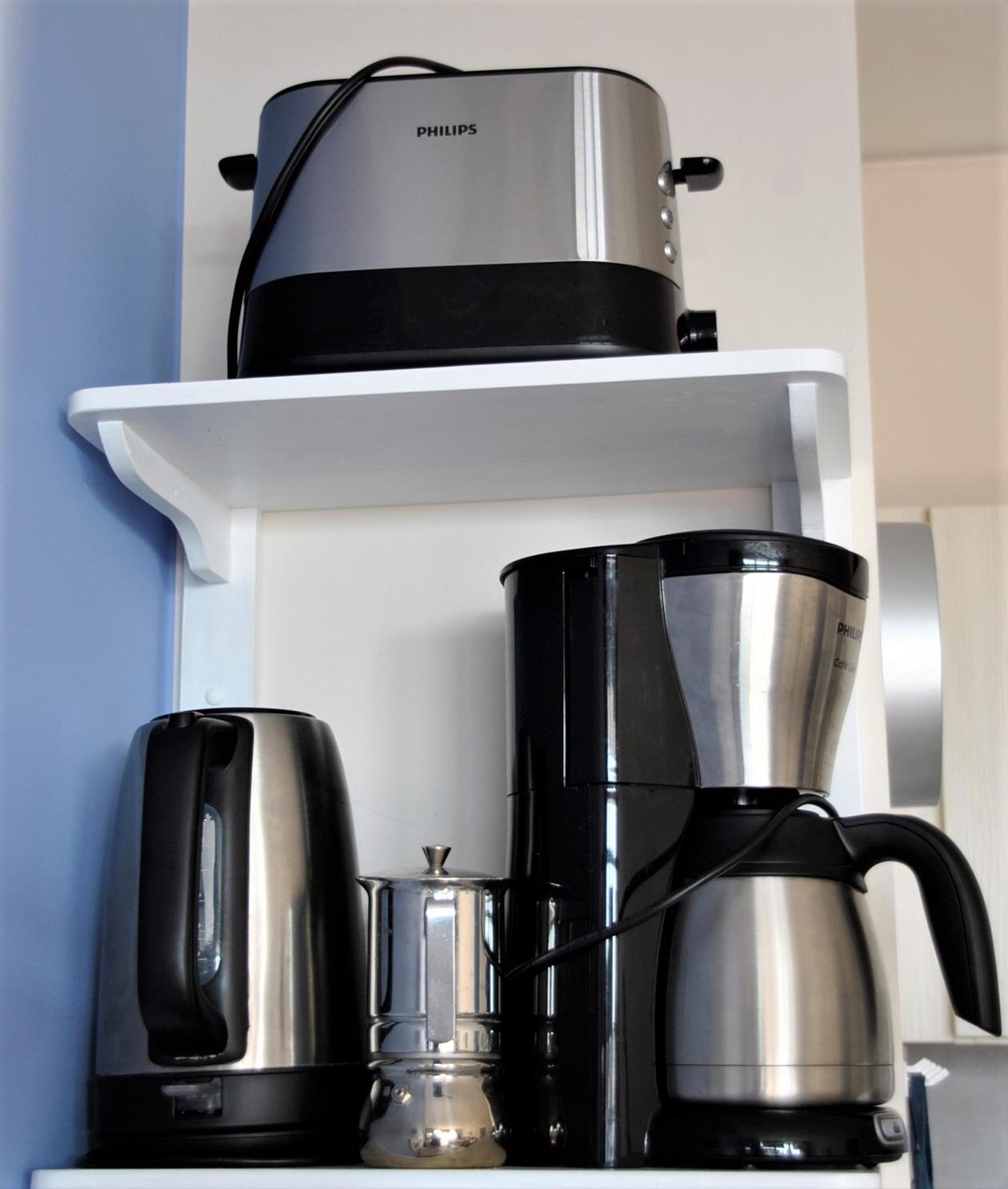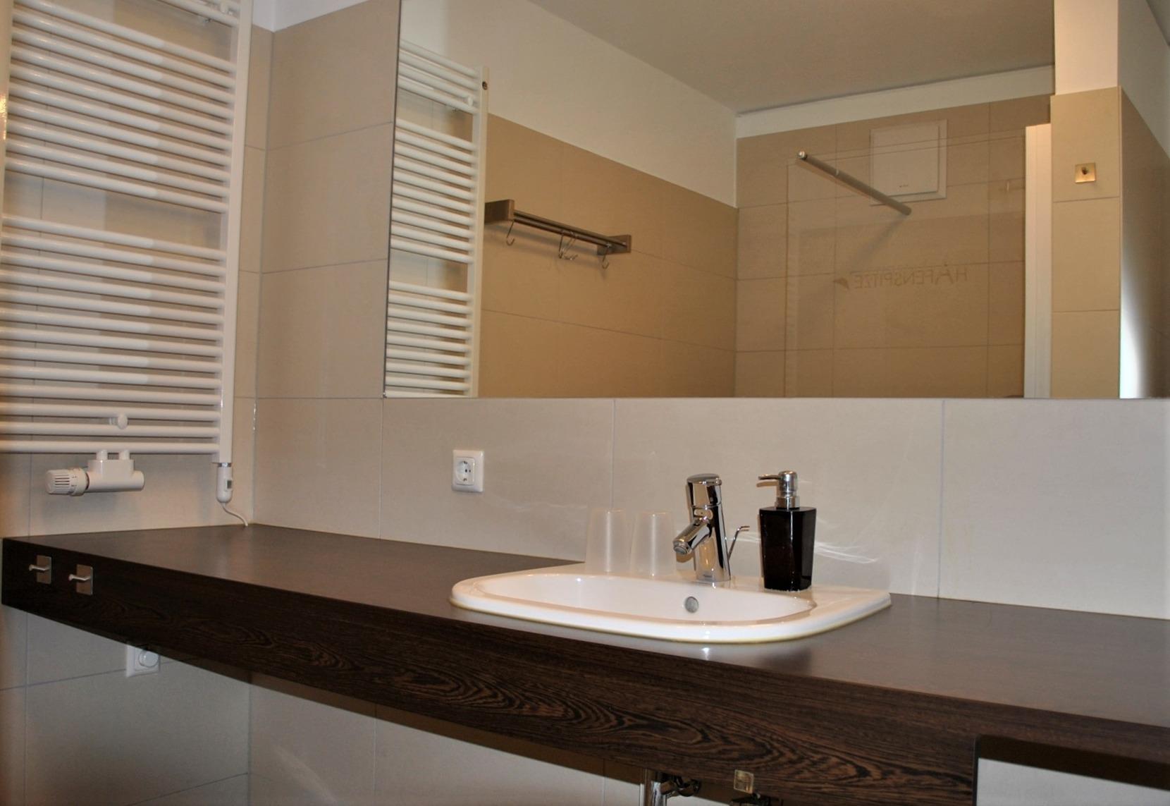 Die moderne und geschmackvolle Innenausstattung des Apartments wurde extra auf die maritime Lage der Hafenspitze abgestimmt. Die Küchenzeile ist ausgestattet mit Ceranfeld, Backofen, Geschirrspülmaschine und Kühlschrank mit Gefrierfach.