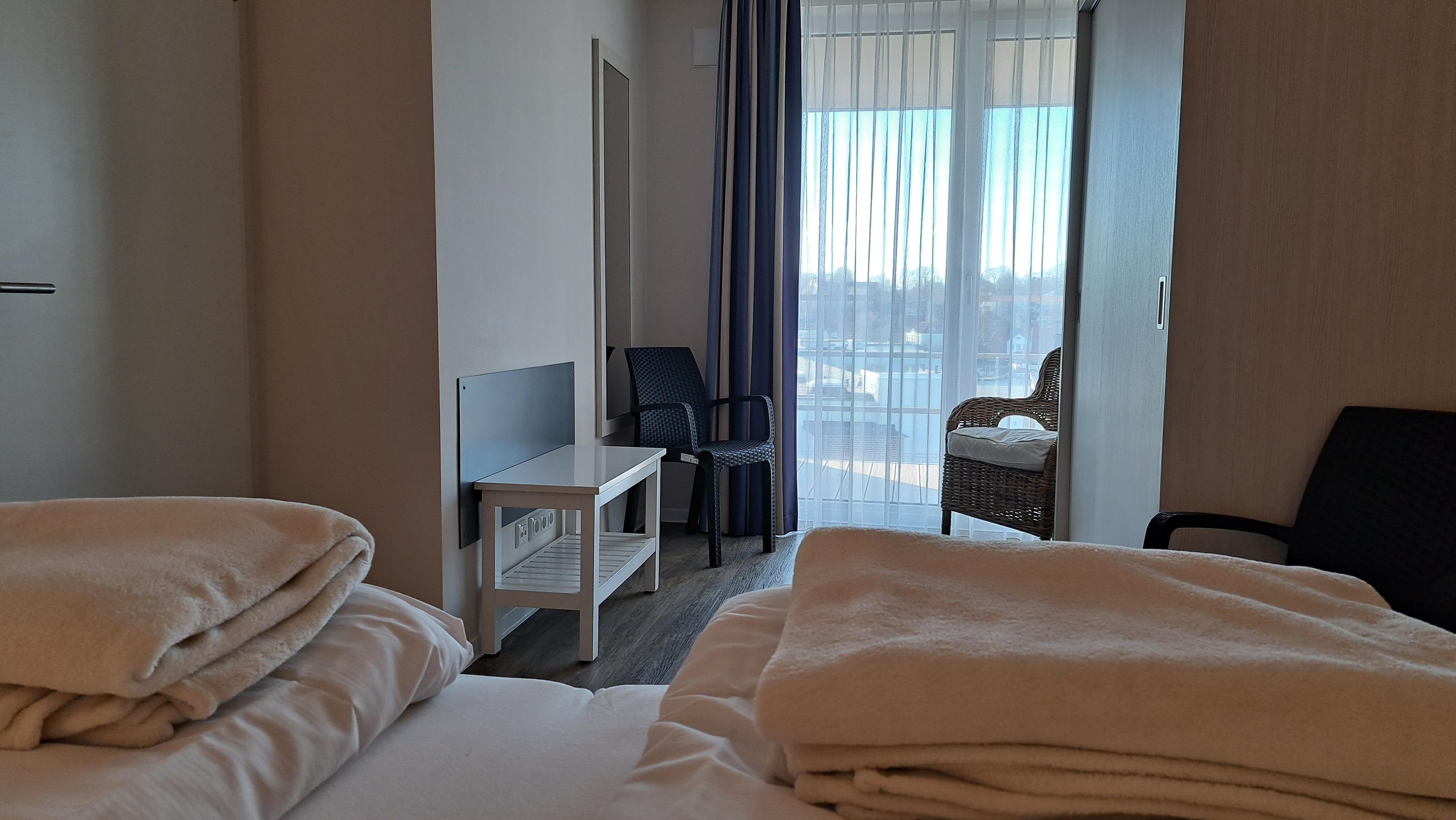 großen Fenster bietet es über die Dächer des Hafenspitze Quartiers einen wunderschönen Blick auf das maritime Treiben im