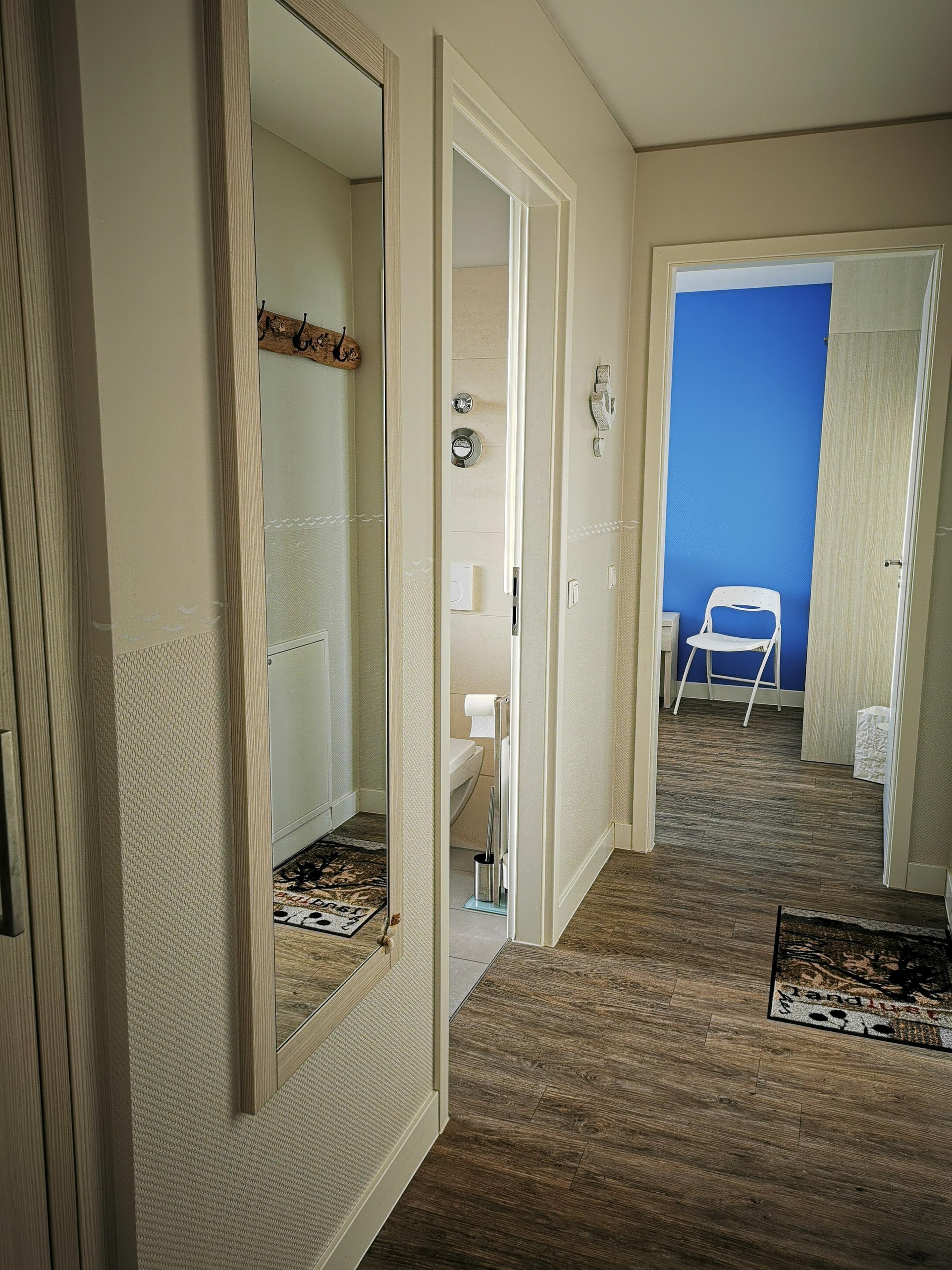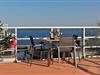 - alle Zimmer mit Raum hohen Fenstern und direktem Zugang zu der mit 2 Strandkörben, Sonnenliege, mobilen Sonnenschirmen und verschiedenen Sitzgelegenheiten ausgestatteten Südwest-Dachterrasse mit See- und Hafenblick (kein Seeblick aus dem Apartment)