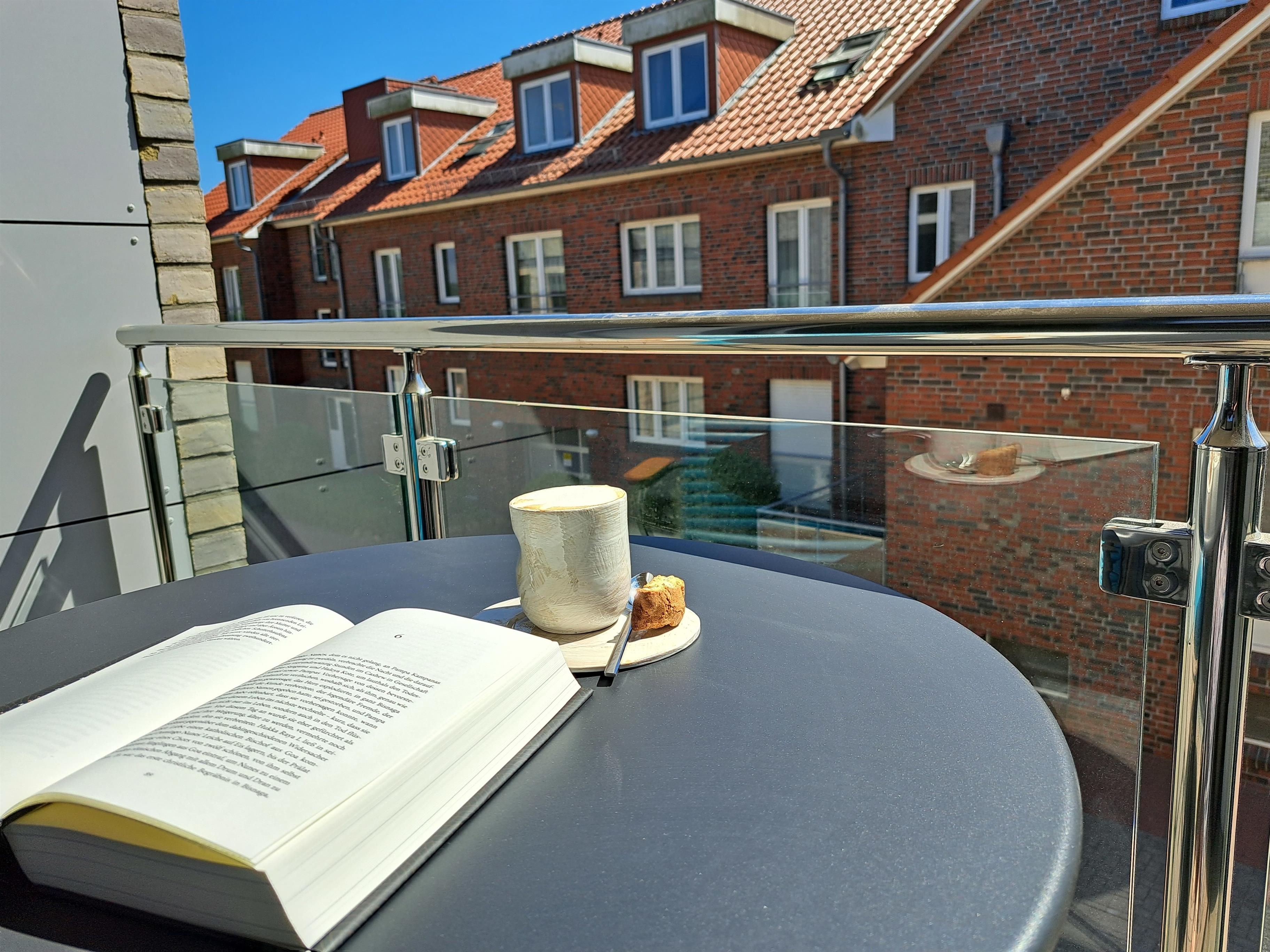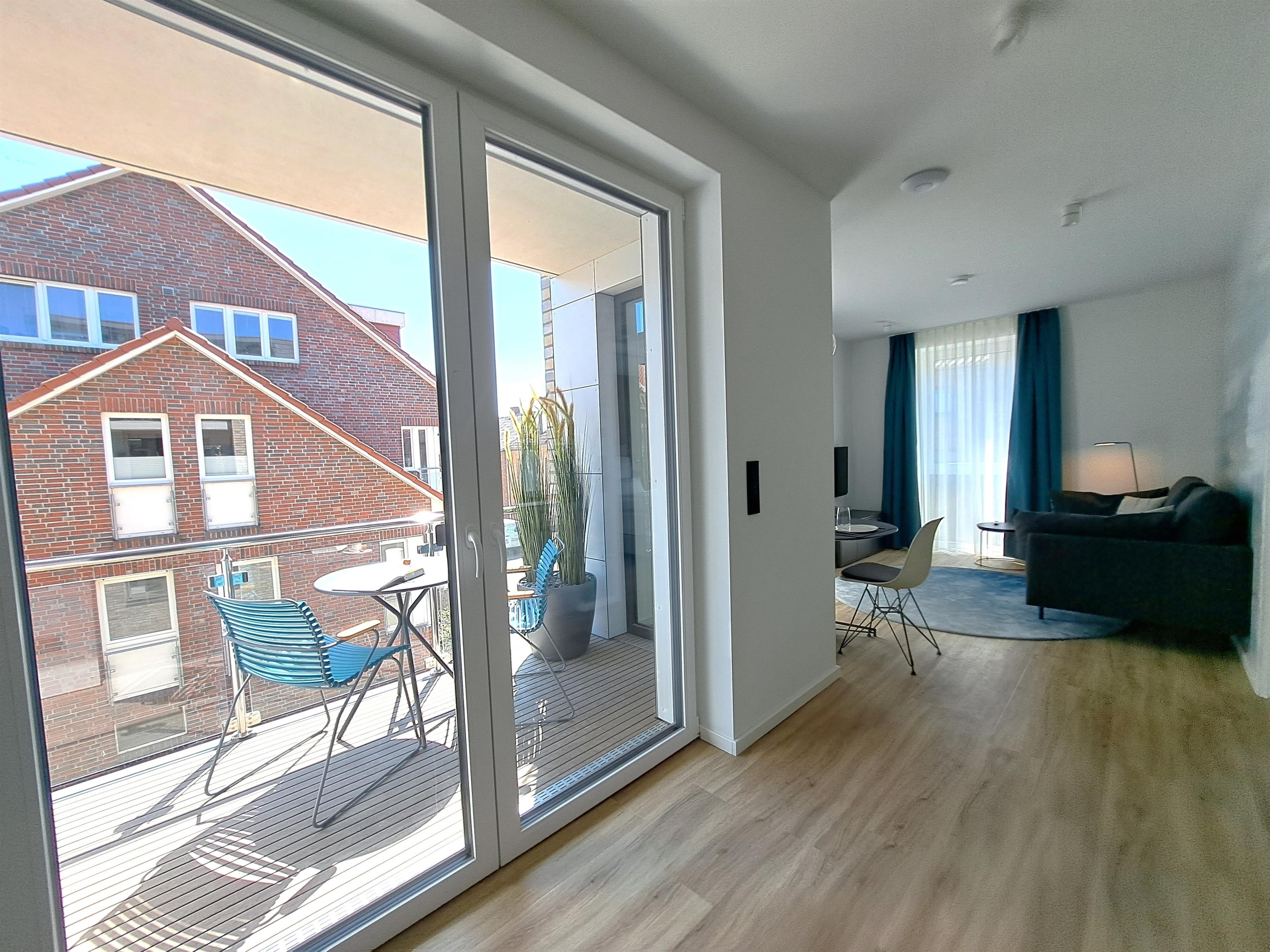 ECK AM MEER 4 verfügt über eine zum Meer und Strand hin seitliche Loggia von 4 qm mit südlicher Ausrichtung. Außenmöblierung ist selbstverständlich vorhanden.