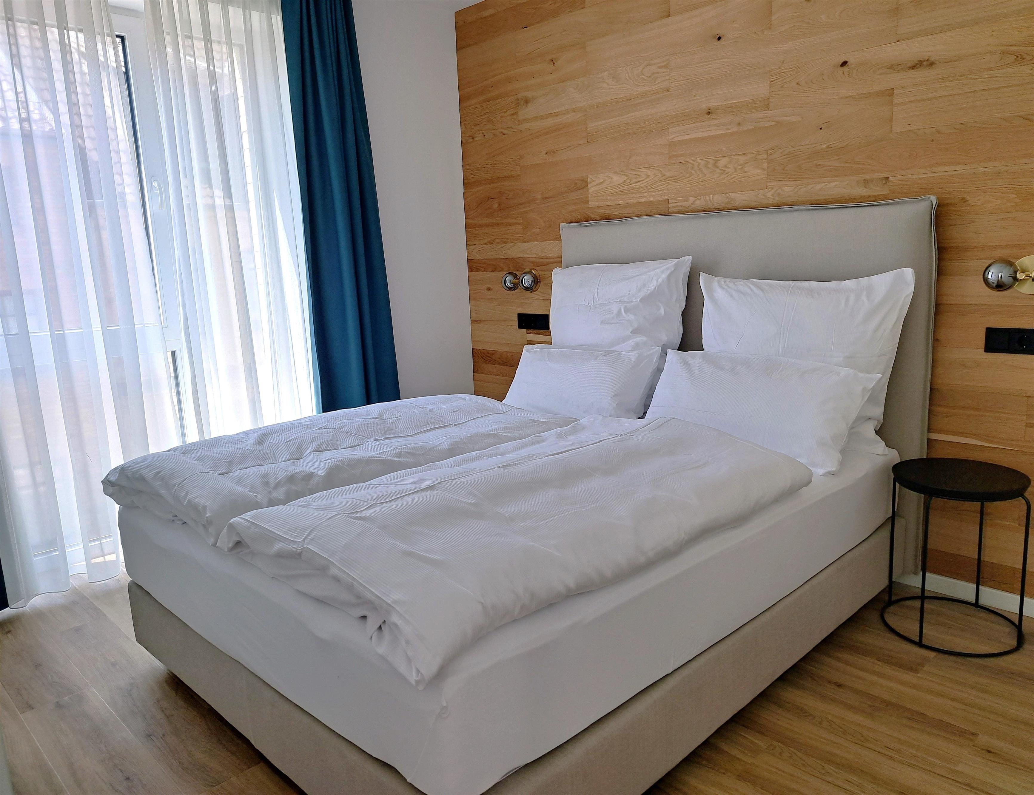 Der Schlafbereiche ist mit einem hochwertigen Boxspringbett und Kleiderschrank mit Zimmersafe eingerichtet.