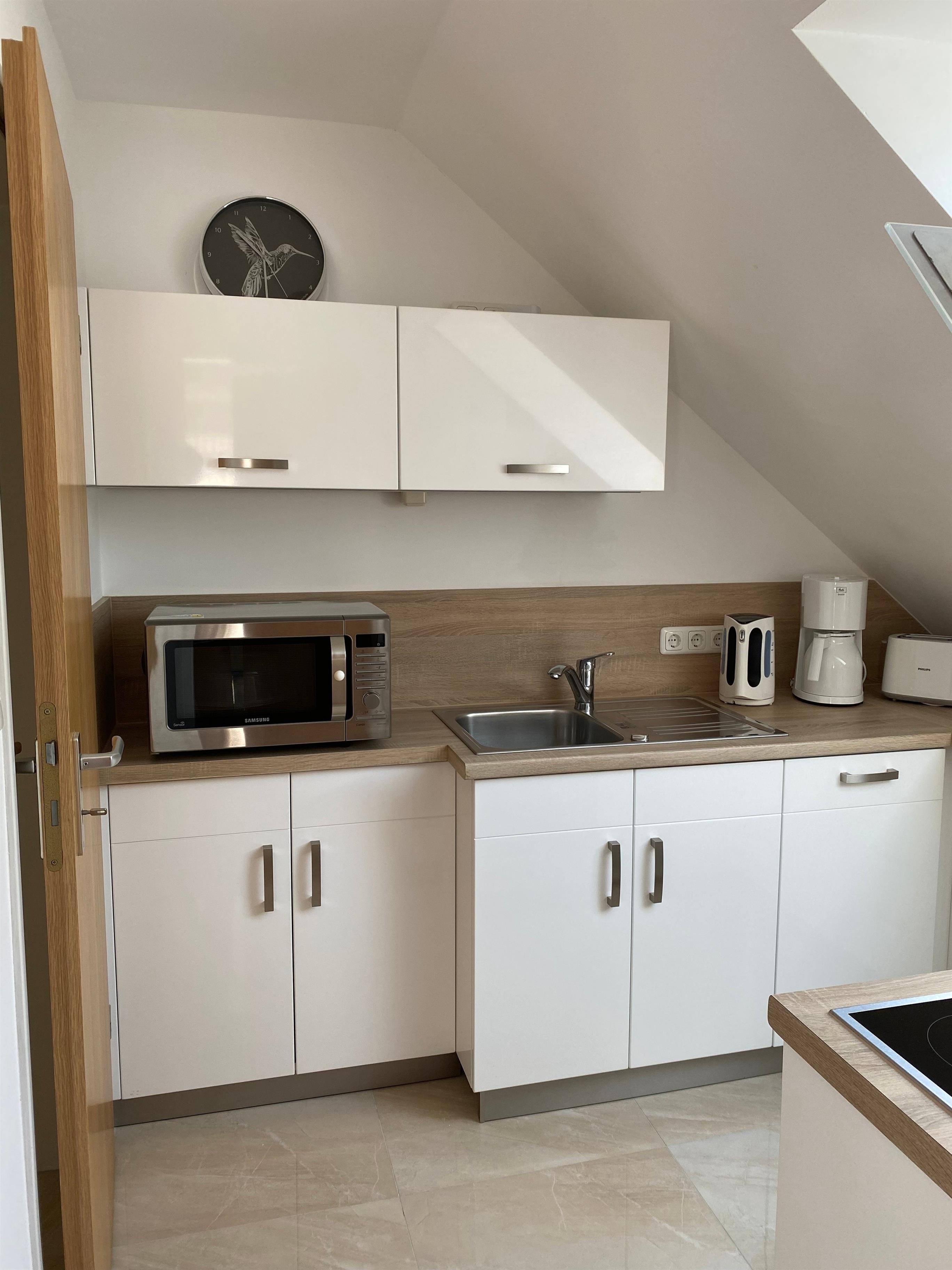 Die Küche ist vollständig ausgestattet mit Mikrowelle, Backofen, Herd, Spülmaschine, Wasserkocher, Kaffeemaschine und Toaster. Ein Kühlschrank mit Gefrierfach ist ebenfalls vorhanden. Das Badezimmer verfügt über eine Regendusche und ein Bidet, inklusive Föhn. Bettwäsche und Handtücher sind inbegriffen.