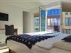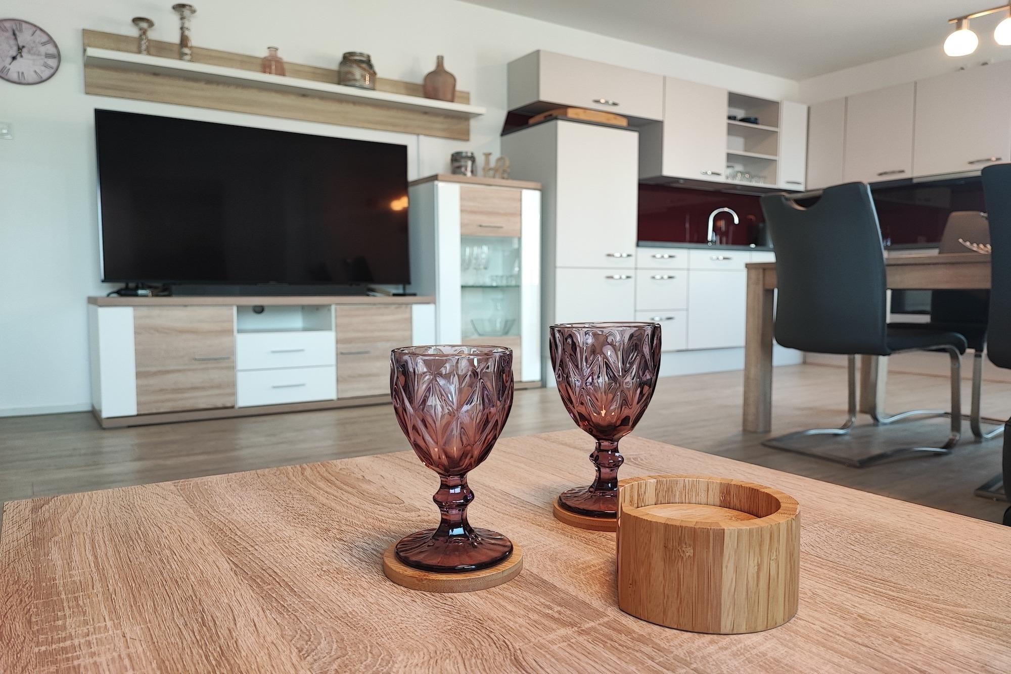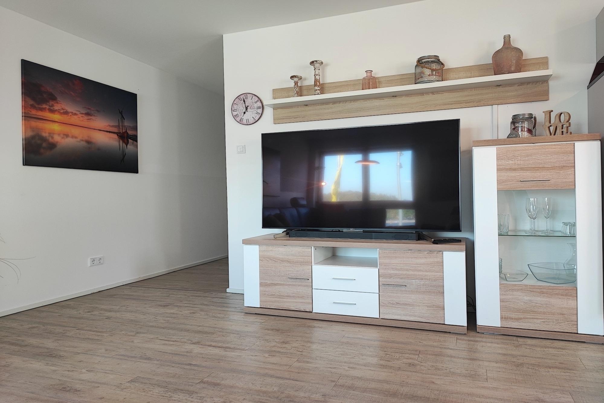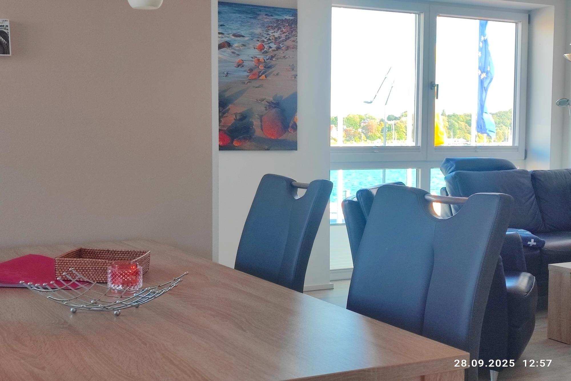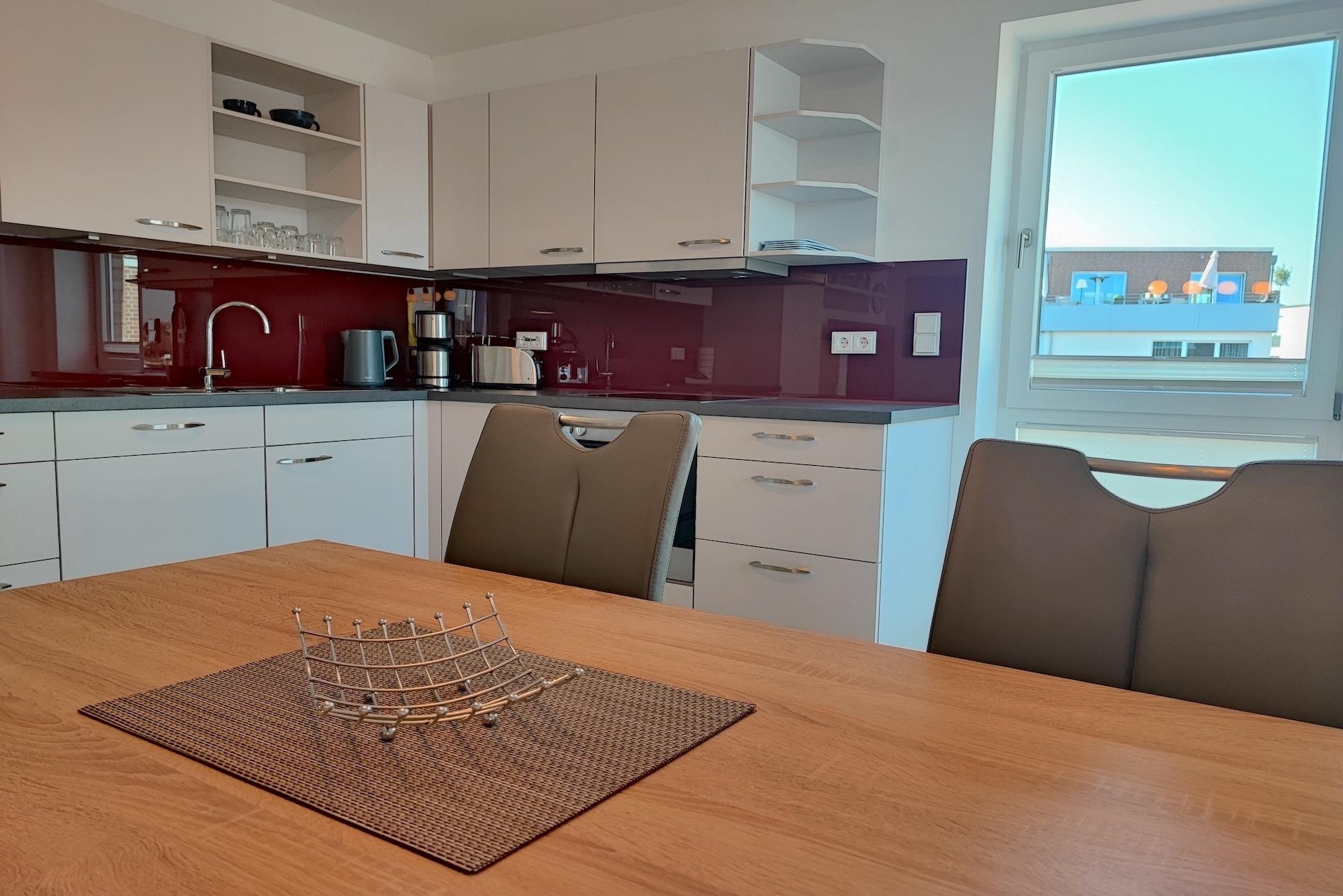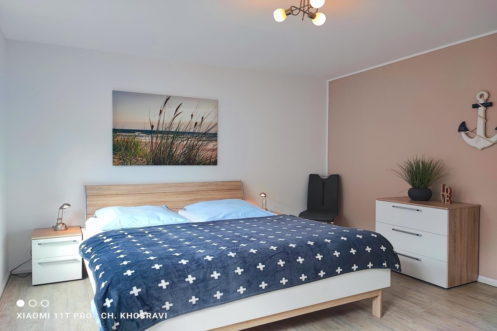 Die Wohnung ist aufgrund der Ausstattung und Einrichtung zum Wohlfühlen für Familien mit maximal 4 Personen und einem Kleinkind, als auch ideal für zwei Paare, aufgrund der zwei Schlafzimmer, zwei Bädern und zwei Balkone. Der großräumige Wohnraum bietet eine große Vielfalt an Möglichkeiten, vom großem Esstisch zum Essen oder Arbeiten über den bequemen Wohnbereich mit großem TV Bildschirm. Das Wohnzimmer verfügt über eine Lederchouch. Die im 1. Obergeschoss gelegene Ferienwohnung, mit Hauseingang im Treppenhaus, verfügt über zwei Balkone. Der eine Balkon bietet Sonne am Nachmittag durch die Südausrichtung. Der andere Balkon bietet Sonne am Vormittag mit direktem Wasserblick über zum Hafenbecken. Die hochwertige und voll ausgestattete Küche bietet alles was Sie zum Zubereiten von Mahlzeiten und zum Kochen benötigen. Der Esstisch bietet reichlich Platz zum Essen für 4 Personen oder als Arbeitsplatz. Die nächtliche Erholung finden Sie in den zwei Schlafzimmer, mit je einem modernen Doppelbett und mit je einem Kleiderschrank ausgestattet. Größe der Matratzen: 2x90x210 (Überlänge) und 2x90x200. Beide Schlafzimmer verfügen über Verdunklungsmöglichkeiten durch Plissees und blickdichte Gardinen. In einem Schlafzimmer ist zusätzlich mit einem Tv Gerät und einem Schreibtisch mit Stuhl ausgestattet. Vom Schlafzimmer haben Sie Zugang zum südausgerichteten Balkon. Die beiden Bäder sind mit einer Badewanne und einer ebenerdigen Dusche. Die Bäder sind mit Bodenfliesen und Fußbodenheizung ausgestattet und bieten viel Geräumigkeit und Abstellflächen. Alle Wohnbereiche sind hochwertig mit Echtholzboden und Fußbodenheizung ausgestattet. Die Wohnung verfügt zudem über kostenfreies WLAN / Internet. Die im 1. Stock des Appartementhauses gelegene Ferienwohnung kann ''barrierefrei'' über einen Aufzug, mit direktem Zugang aus der Tiefgarage erreicht werden. Die Symbole vom Wohngrundriss können in der Darstellung von der tatsächlichen Innen- und Außengestaltung der Wohnung abweichen!