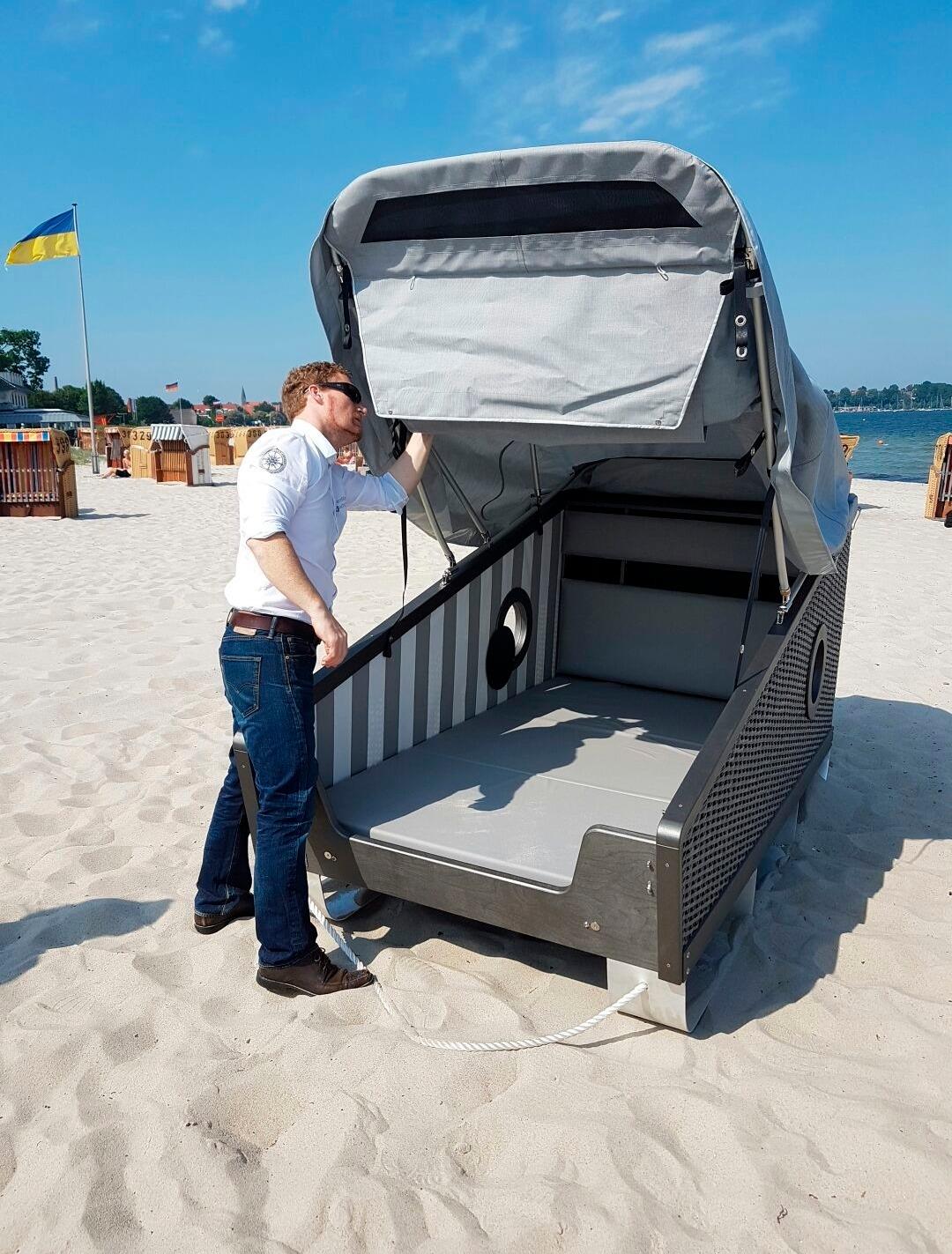 Der knapp 1,20 Meter breite und 2m lange Strandkorb ist für zwei Leute ausgelegt. Tagsüber können Paare ganz normal drin sitzen und auch ihre Utensilien dort verstauen. Scheint die Sonne zu heftig - "was ja auch bei uns Schleswig-Holstein durchaus mal passiert" - kann die Persenning ein Stück weit zugezogen werden. In der Nacht kann der Korb ganz auch von Innen geschlossen werden.