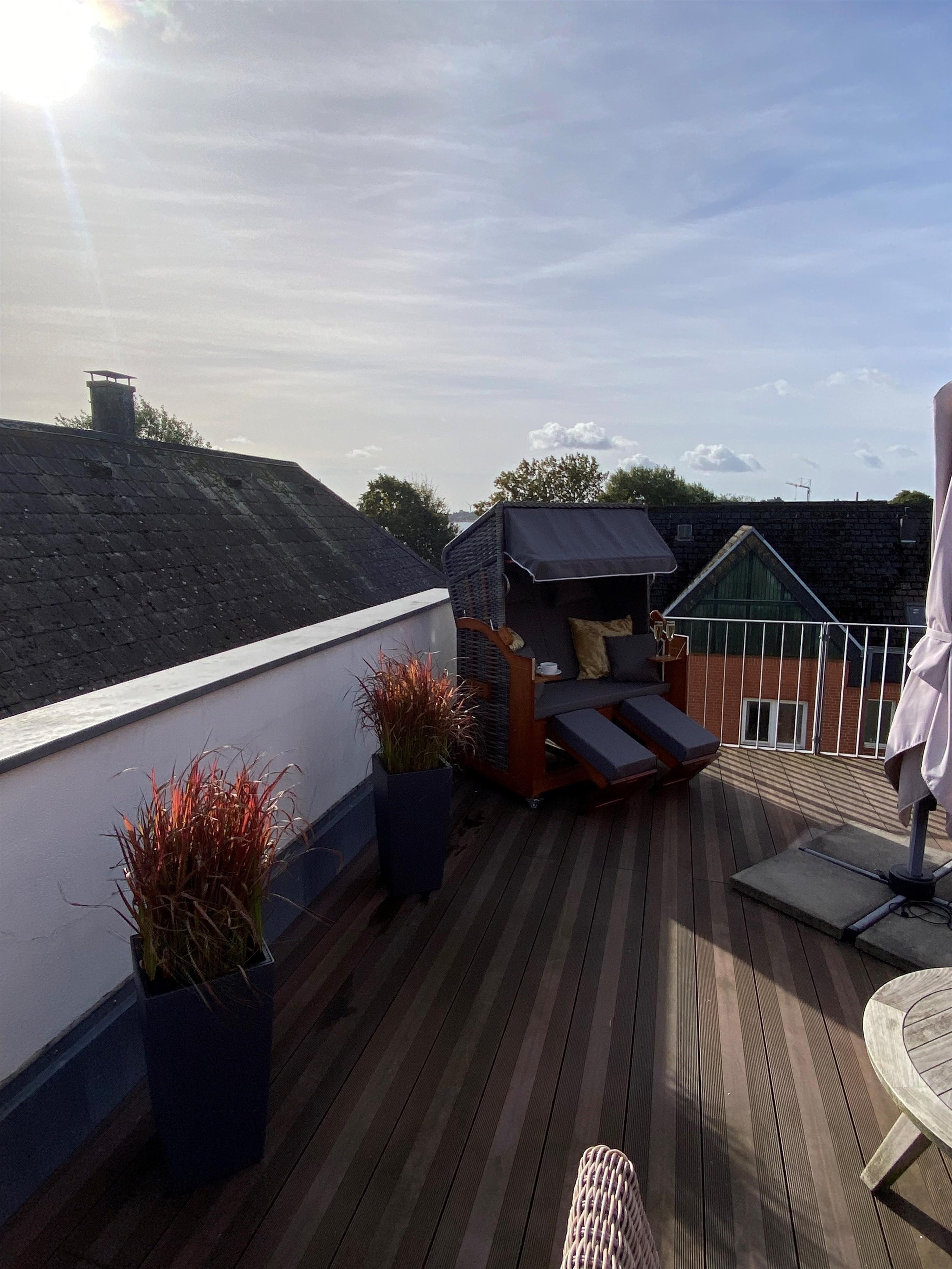 Sie befindet sich auf dem Dach eines Gebäudes an der Hafenspitze und bietet einen schönen Ostseeblick. Bis zum Strand sind es nur 50 m, 100 m zum Hafen, 200 m zur Fußgängerzone, 400 m zum Rathausmarkt und 800 m zum ZOB / Bahnhof.