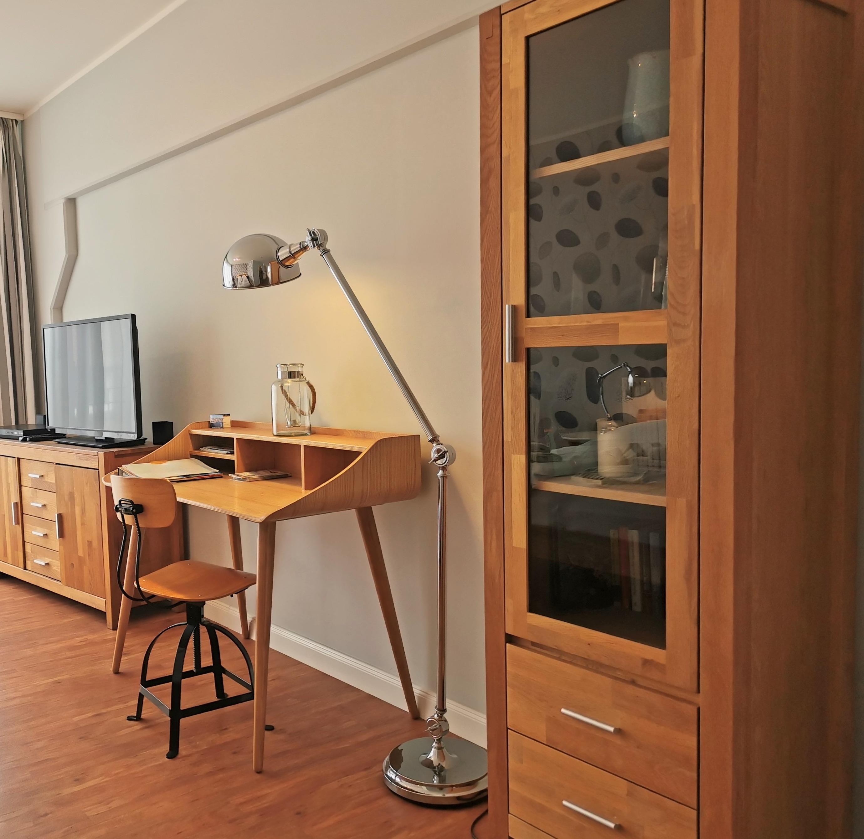 Der Wohn- und Schlafbereich verfügt über ein neues Doppelbett (180 x 200), einen Essbereich mit Teil-Blick zum Hafen, eine separate, modern ausgestattete Küche (Geschirrspüler, Ceranfeld, Backofen mit integrierter Mirkrowelle, Kaffeemaschine) und ein Duschbad mit Waschmaschine. TV, Stereoanlage, CD-Player, kostenloses WLAN für Internet. Das Apartment ist weitgehend barrierefrei. Hunde sind willkommen.