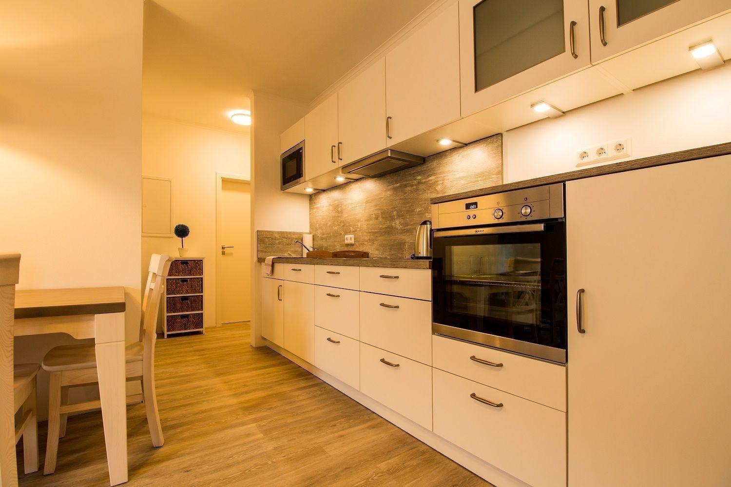 Die hochwertig eingerichtete Wohnung mit 70 m² verfügt über zwei Schlafzimmer mit jeweiligem Doppelbett. Die Küchenzeile ist mit einem Geschirrspüler, einem Backofen sowie einer Kaffeemaschine ausgestattet.