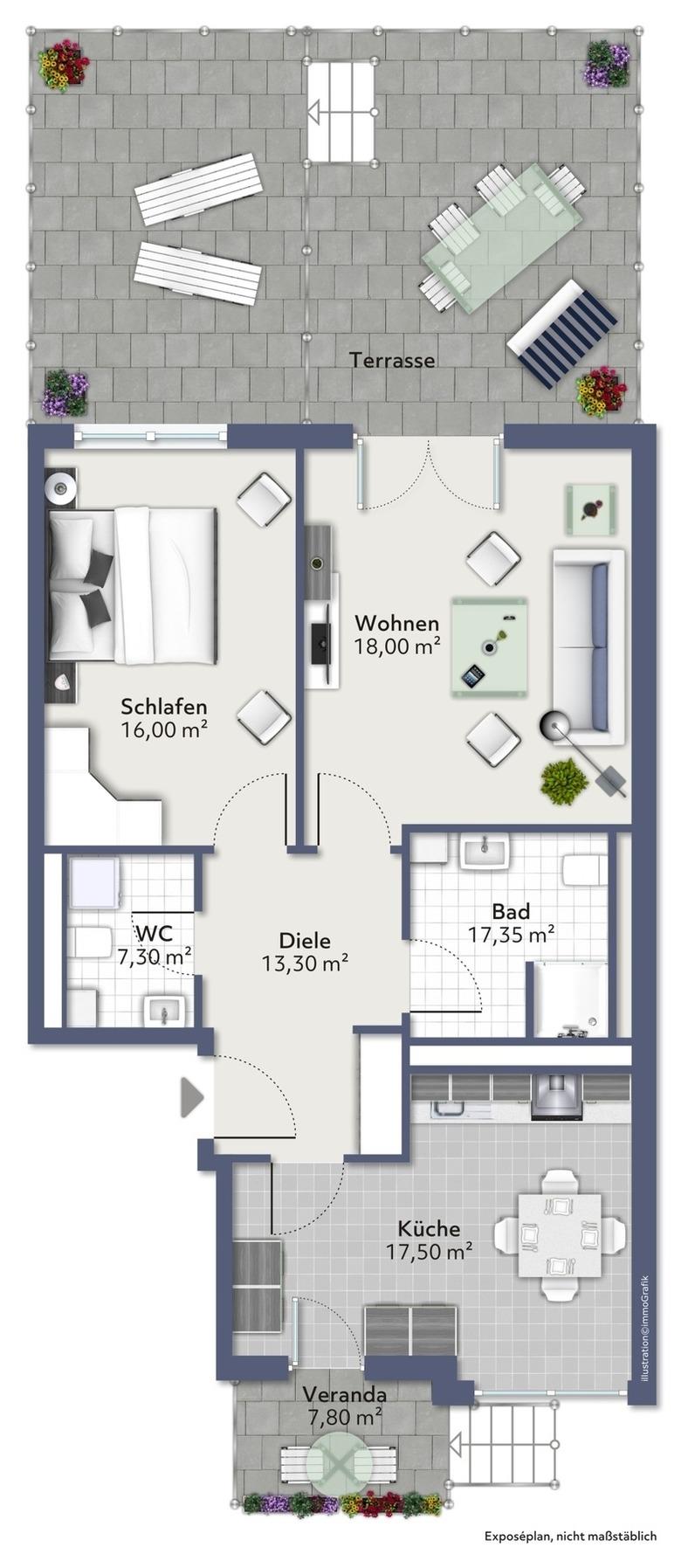Der gemütliche, hochwertig eingerichtete Wohn- und Essbereich, mit separater voll ausgestatteter Küche, la¨dt zum gemeinsamen Entspannen und Kochen ein! Die Ferienwohnung verfügt über große Terrasse und eine Veranda. Von der Hochterrasse aus können Sie stehend die Aussicht mit Wasserblick weit über den Hafen bis nach Borby genießen. Das Schlafzimmer wurde mit einem modernen Boxspringbett (180x200) und einem Kleiderschrank ausgestattet. Das Schlafzimmer bietet somit die gewünschte nächtliche Erholung! Im Wohnzimmer bietet das Schlafsofa (140x200) Platz für zwei weitere Personen. Die Dusche im Badezimmer ist ebenerdig. Die komplette Wohnung ist mit Vinylboden und Fußbodenheizung ausgestattet. Zusätzliches: Gäste-WC mit Waschmaschine. Die im Hochparterre des Appartementhauses gelegene Ferienwohnung kann ''barrierefrei'' über einen Aufzug, mit direktem Zugang aus der Tiefgarage erreicht werden. Die Symbole vom Wohngrundriss können in der Darstellung von der tatsächlichen Innen- und Außengestaltung der Wohnung abweichen!