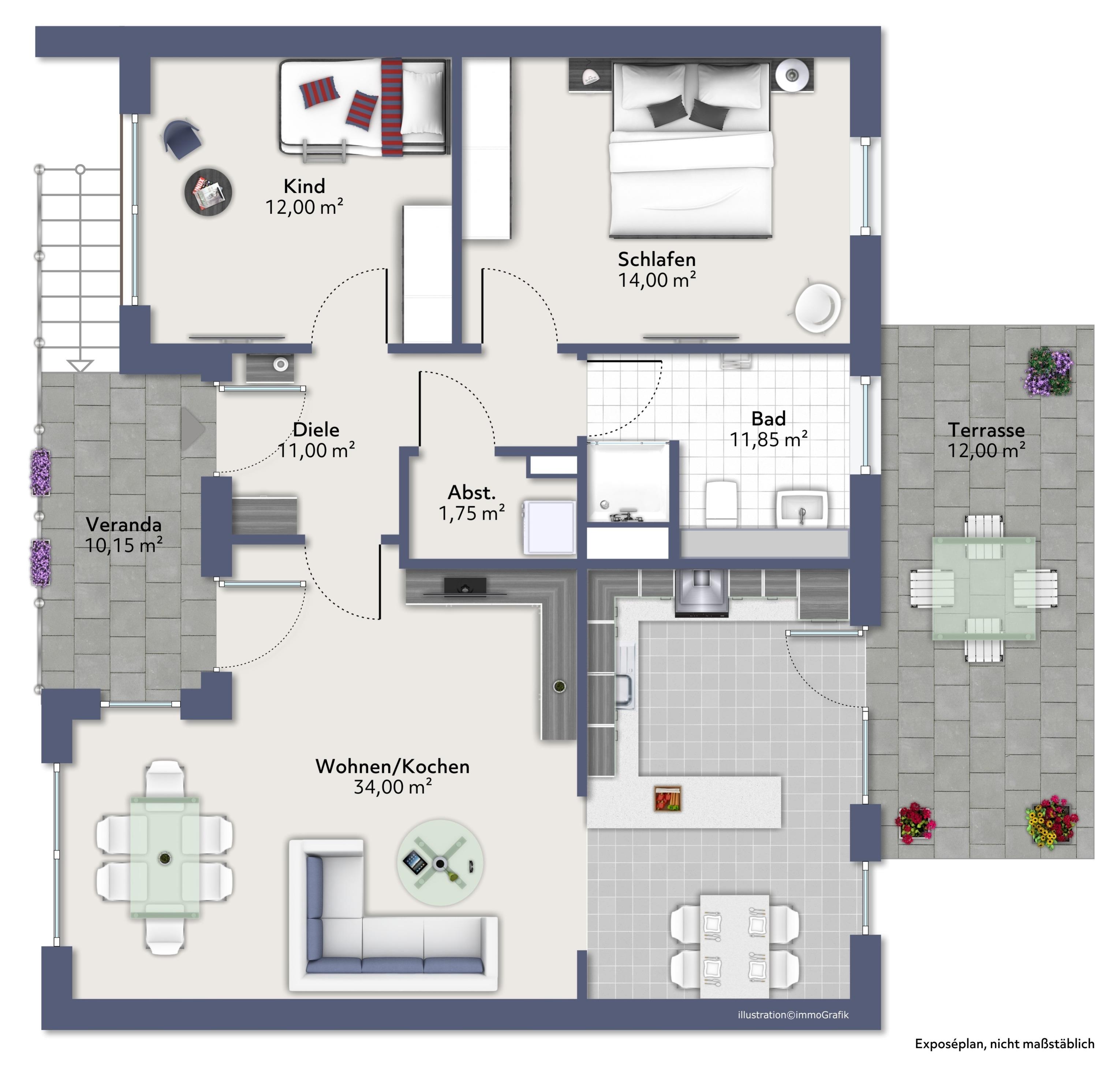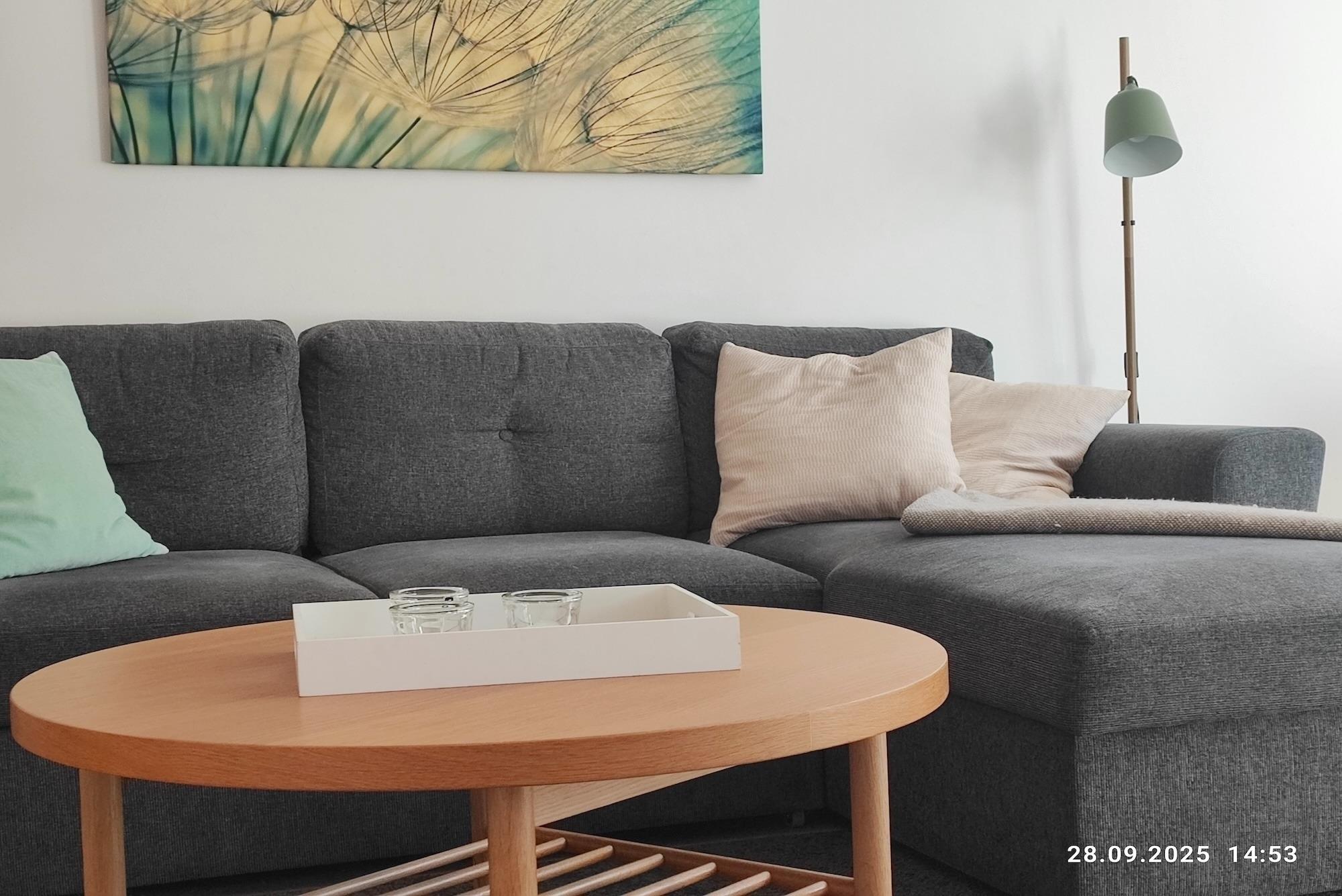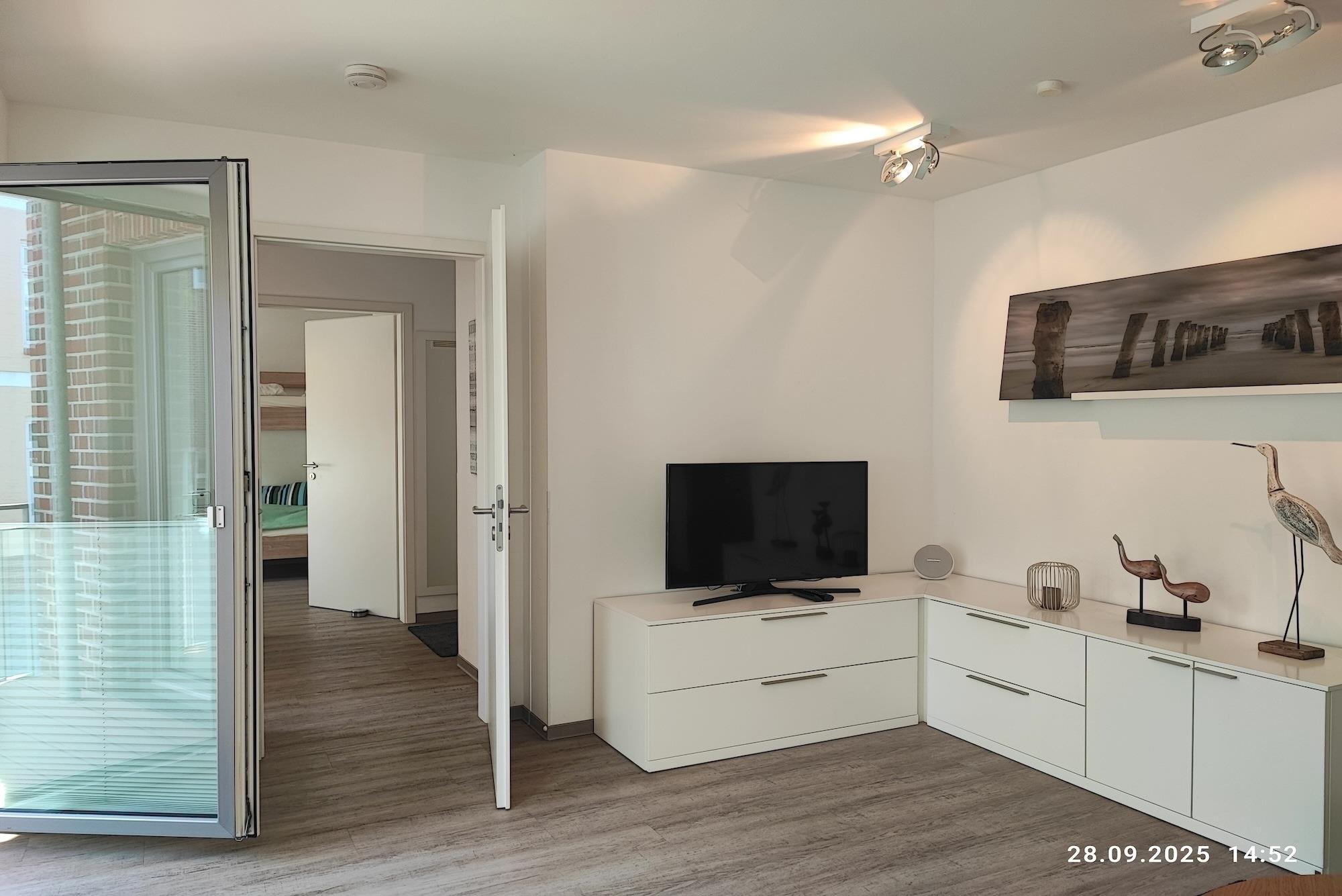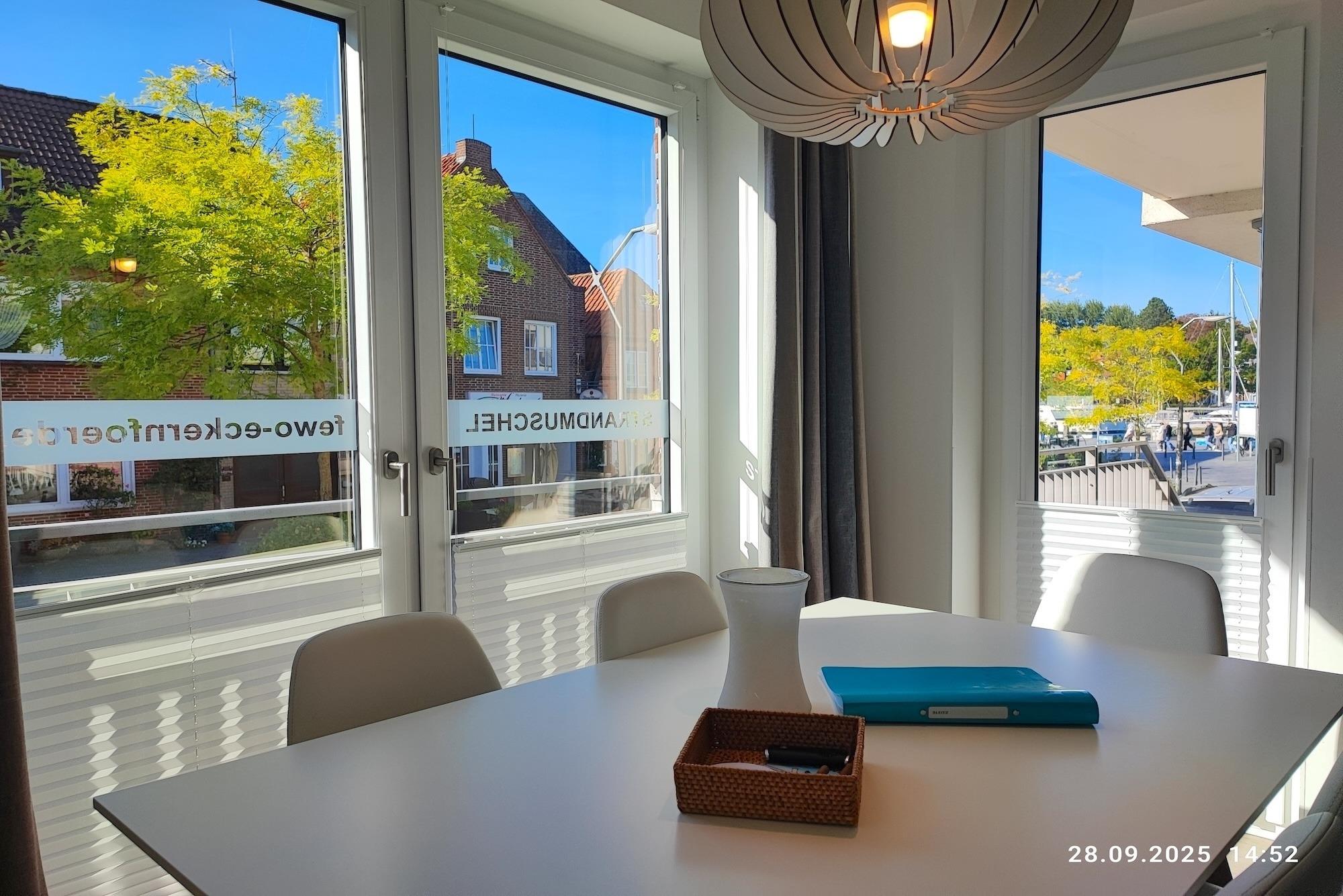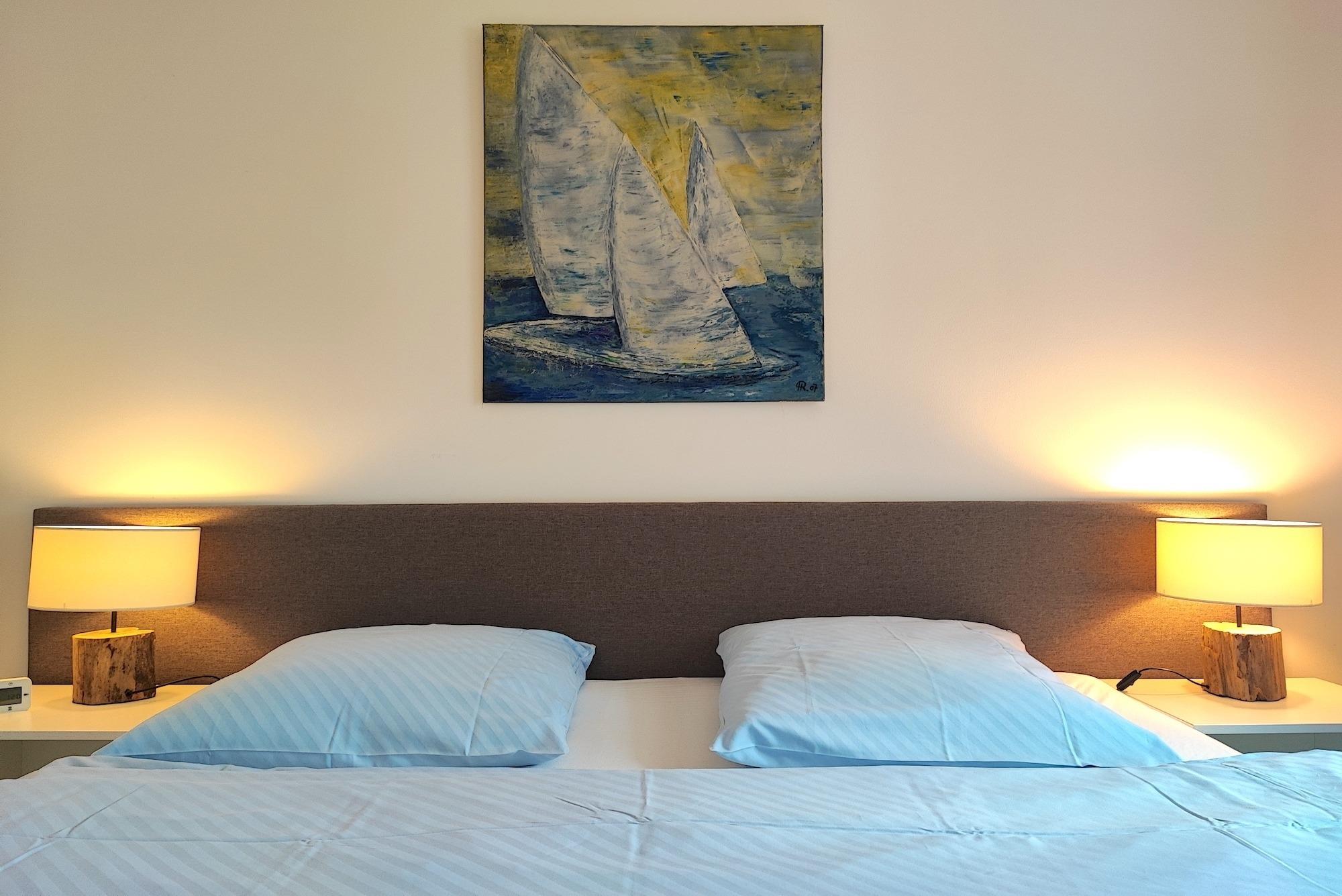 Die Wohnung ist aufgrund der Ausstattung und Einrichtung für Familien bis 5 Personen mit einem Kleinkind, als auch ideal zum Wohlfühlen für ein Paar. Der offene Wohnbereich bietet eine große Vielfalt an Möglichkeiten, vom großem Esstisch, über den bequemen Wohnbereich zum lesen und Fernsehen bis hin zur Küche mit fließendem Übergang. Das Wohnzimmer verfügt über ein Sofa mit Schlaffunktion. Die Ferienwohnung mit separatem Hauseingang verfügt über eine am Nachmittag sonnige Veranda zur Hafenseite hin und über eine geschüzte Innenhofterrasse für die besonders heißen Tage. Die hochwertige und voll ausgestattete Küche bietet alles was Sie zum Zubereiten von Mahlzeiten und zum Kochen benötigen. In der Küche gibt es einen weiteren Essbereich mit 4 Stühlen und ermöglicht den Zugang zur Innenhof-Terrasse. Die nächtliche Erholung finden Sie in den zwei Schlafzimmer mit je einem TV-Gerät und je einem Kleiderschrank ausgestattet. Das Hauptschlafzimmer hat ein modernes Doppelbett, somit kann bei Bedarf dieses als Einzelbetten auseinandergeschoben werden. Im zweiten Schlafzimmer befindet sich ein Etagenbett, ein Favorit für Kinder. Größe der vier Matratzen, jeweils 90x200. Beide Schlafzimmer verfügen über Plissees und zusätzliche Verdunklung durch blickdichte Gardinen. Das Duschbad ist mit Bodenfliesen und Fußbodenheizung ausgestattet. Die Dusche ist ebenerdig. Das Bad bietet Geräumigkeit und Abstellflächen. Die im Hochperterre des Appartementhauses gelegene Ferienwohnung kann ''barrierefrei'' über einen Aufzug, mit direktem Zugang aus der Tiefgarage erreicht werden. Die Symbole vom Wohngrundriss können in der Darstellung von der tatsächlichen Innen- und Außengestaltung der Wohnung abweichen!