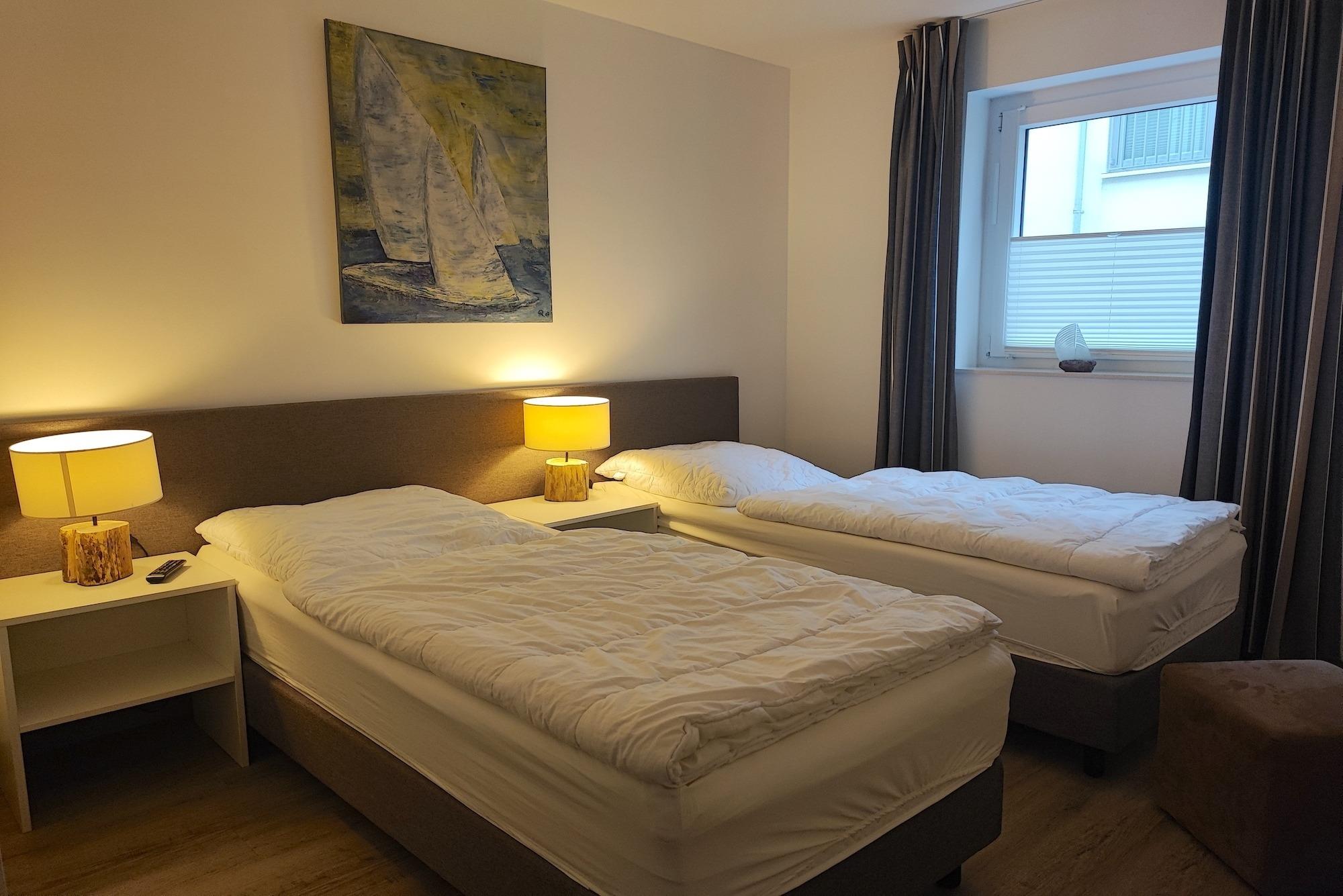 ? Wäschepakete optional wählbar gegen Gebühr: (Bettwäscheset/Handtuchset jeweils pro Aufenthalt/pro Person) können gegen eine Gebühr bestellt werden oder Selbst mitgebracht werden. Achten Sie bei Buchung an die gleiche Anzahl Wäschepakte wie gebuchten Personen. Ein Handtuchset pro Aufenthalt/pro Person ist ausgelegt für eine Woche (1 Duschtuch, 1 Handtuch), zusätzlich 1 Badvorlage pro Bad. Weitere Handtuchsets können bei längeren Aufenthalten z.B. ab dem 7. Tag gegen eine weitere Gebühr dazu bestellt werden ? 4 Einzelmatratzen á 90x200 ? Babys und Kleinkinder bis zum vollendeten 2. Lebensjahr kostenfrei (Verleih Babyreisebett gegen Gebühr, Babyhochstuhl kostenfrei) ? Haustiere nicht erlaubt ? Parkplatz Nr. 8 in der Tiefgarage (inklusive) ? Höhe Toreinfahrt in die Tiefgarage ist 2,10 m ? Fahrradabstellraum (Gemeinschaftsraum) ? Nichtraucherwohnung