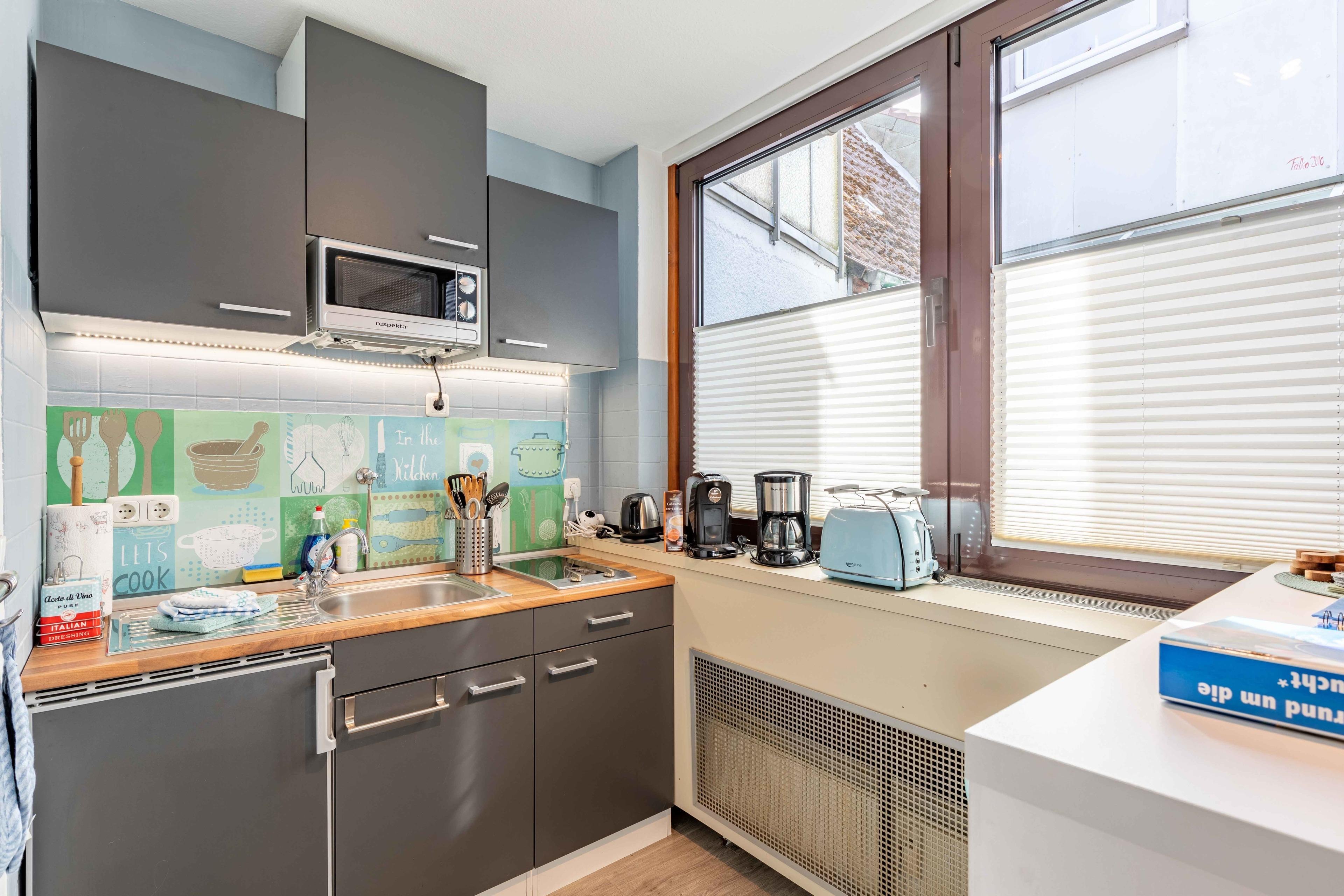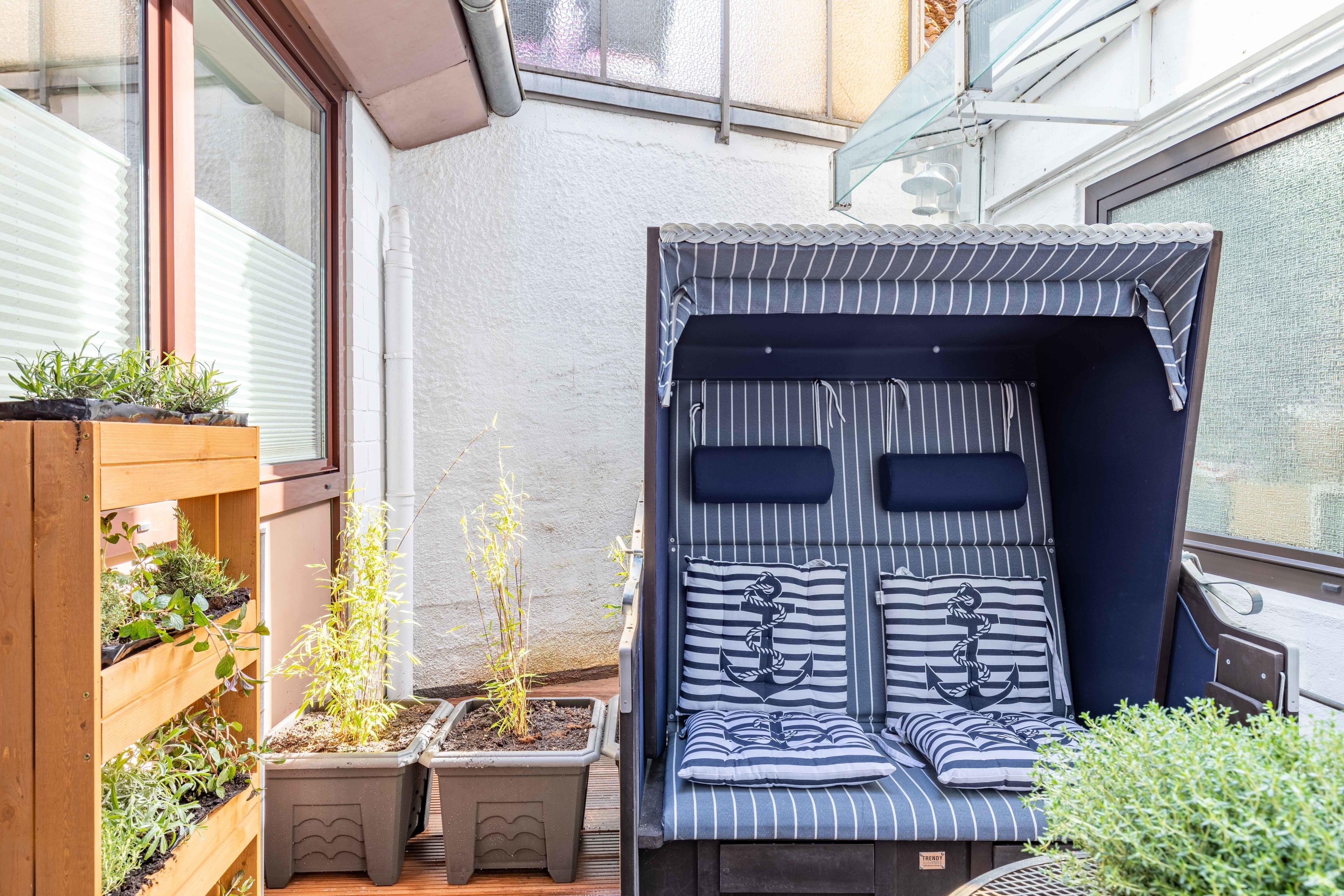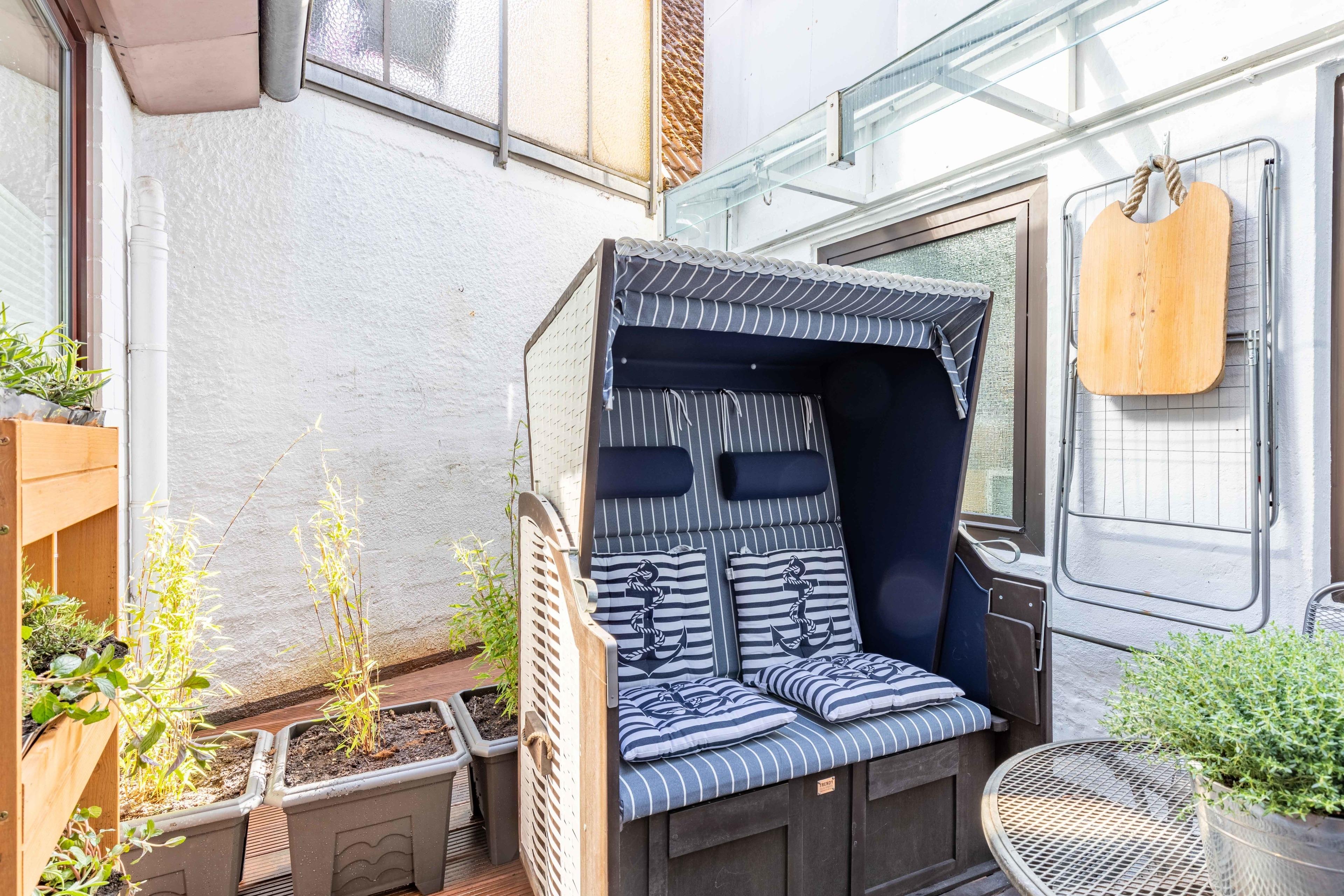 Das etwa 30 qm große Apartment gliedert sich in einen Wohn- und Schlafbereich mit Kleiderschrank und einem großen Regal. Zudem gibt es ein separates Bad mit Dusche, Waschbecken und WC. Die Pantry-Küche mit Spüle, Ceranfeld, Kühlschrank, Kaffeemaschine und allen anderen Geräten, die im Urlaub benötigt werden, ist vom Wohn- und Schlafbereich durch einen Esstresen mit zwei Barhockern getrennt. Exklusiv von den Gästen des Apartments genutzt werden darf der kleine, begrünte Patio-artige Innenhof. Hier können Sie im Strandkorb oder mit Gartenmöbeln Ihre Urlaubstage bei einem Glas Bier oder einem Schoppen Wein in stimmungsvoller Atmosphäre ausklingen lassen. Zum Apartment gehören zudem noch eine Waschmaschine und ein Wäschetrockner. Sonderarrangements auf Anfrage.