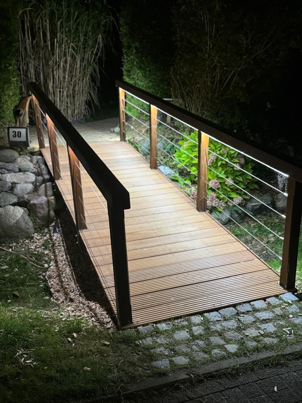 Die Wohnung befindet sich mit separatem Eingang im 1. OG unseres Einfamilienhauses. Auf das Grundstück kommen Sie direkt von der Spielstraße über die Holzbrücke und gehen dann durch den Garten zur außenliegenden Treppe. Über die schöne Loggia gelangen Sie dann in die Wohnung.
