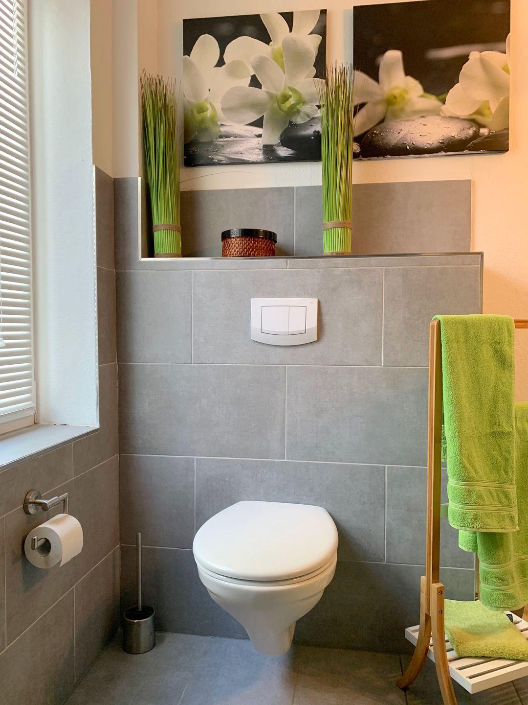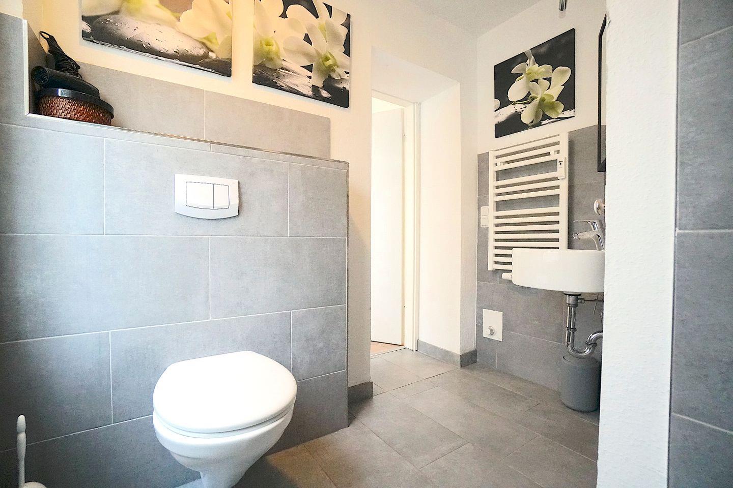 Das Badezimmer ist mit einer bodengleichen Dusche, WC und Waschbecken, Spiegel sowie einem Fenster für Tageslicht ausgestattet. Ein Haartrockner und warmes Wasser sind ebenfalls vorhanden, was den modernen Komfort unterstreicht.