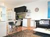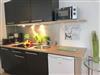 Im Hauptzimmer findest du eine gemütliche Sofaecke mit Sessel und Schreibtisch. Laminatboden sorgt für eine angenehme Wohnatmosphäre. Für entspannte Stunden stehen dir ein moderner Flachbild-TV, WLAN sowie Radio und CD-Player zur Verfügung. Am stilvoll eingerichteten Essbereich kannst du deine Mahlzeiten genießen, die du in der offenen Küche zubereitest. Die Küche ist mit Cerankochfeld, Kühlschrank, Gefrierfach, Mikrowelle, Kaffeemaschine, Toaster, Wasserkocher sowie umfangreichem Geschirr und Besteck komplett ausgestattet – alles, was du brauchst, um dich nach deinen Wünschen zu versorgen. Sichtschutz an allen Fenstern garantiert deine Privatsphäre.