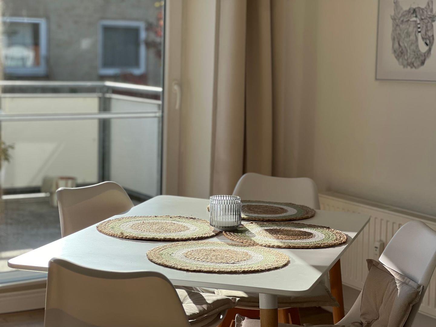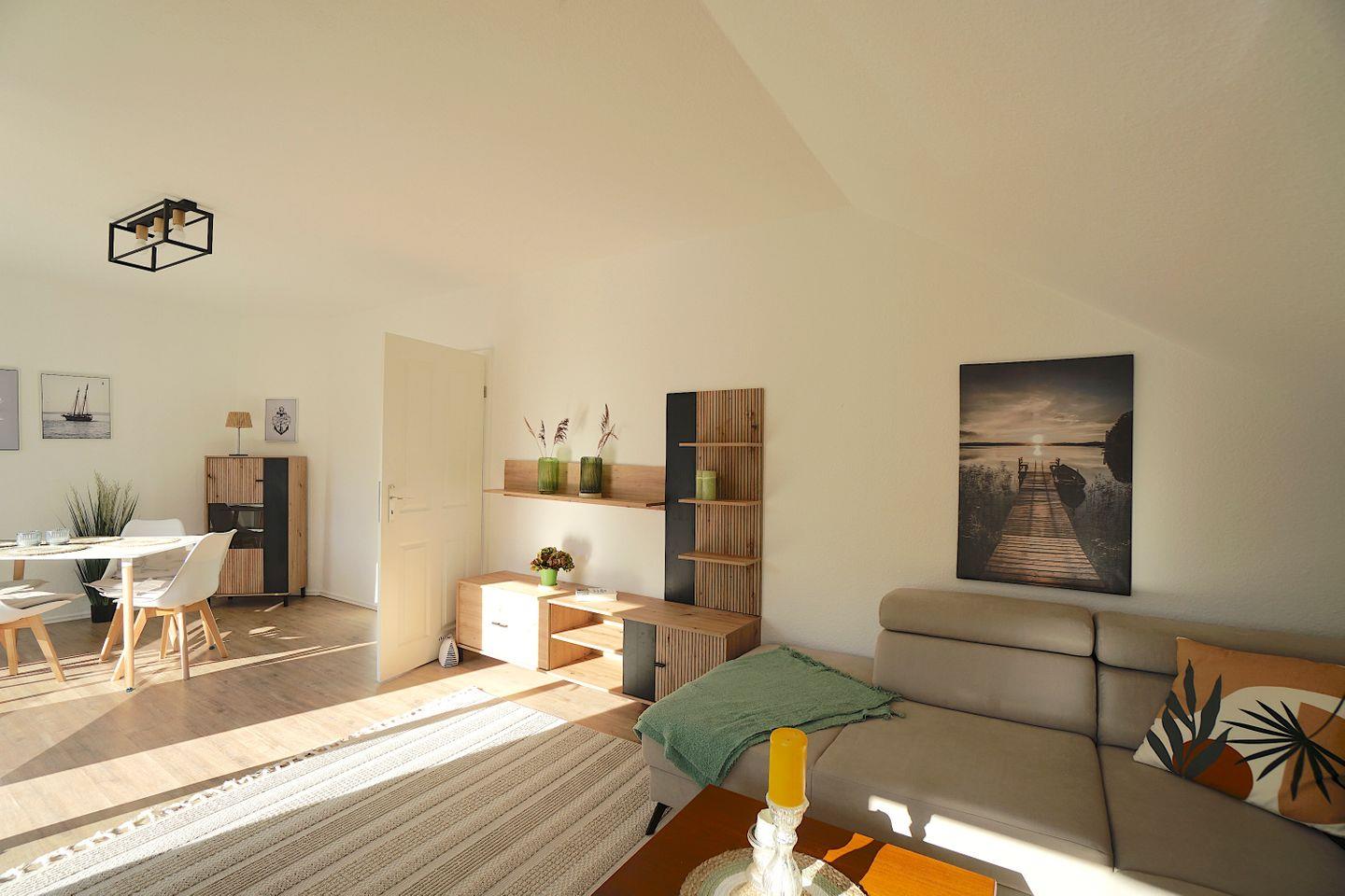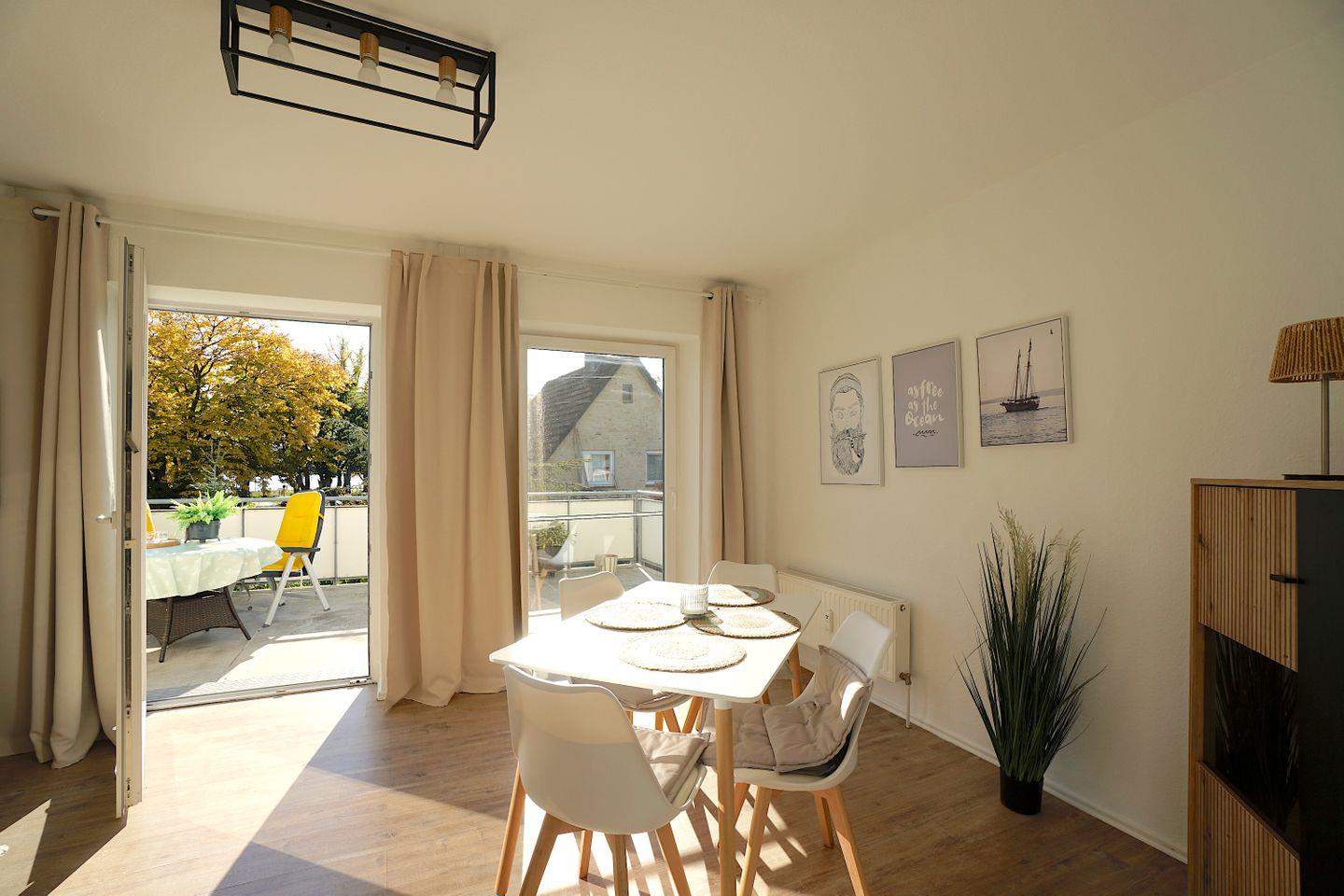 Das große Wohn- und Esszimmer ist modern und gemütlich eingerichtet, hierüber gelangt man auch auf die riesige Terrasse der Wohnung auf der man seinen Urlaub wirklich genießen kann. Nur wenige Meter von der Ostsee entfernt, liegt das Haus etwas zurück gelegen vom sommerlichen Trubel der Stadt und bietet dennoch zwischen den Bäumen hindurch den Blick auf die Ostsee. Dank der Südausrichtung der Terrasse, kann man hier wunderbar sonnenbaden. Die Terrasse ist groß genug für einen Tisch mit Stühlen und Liegen.