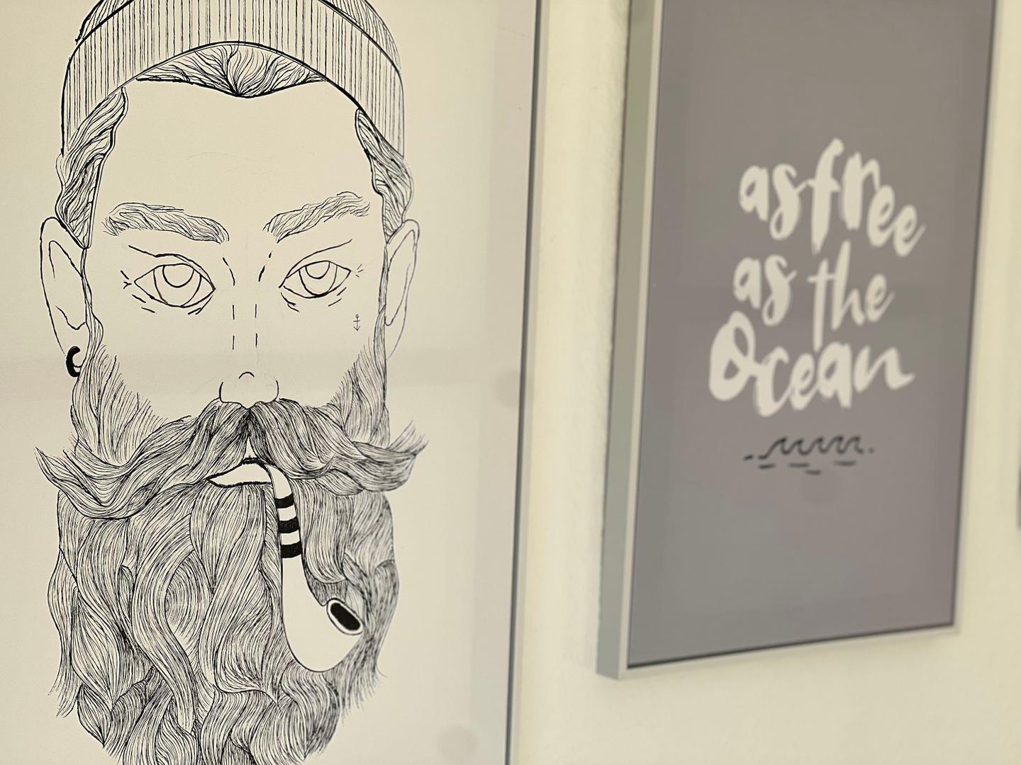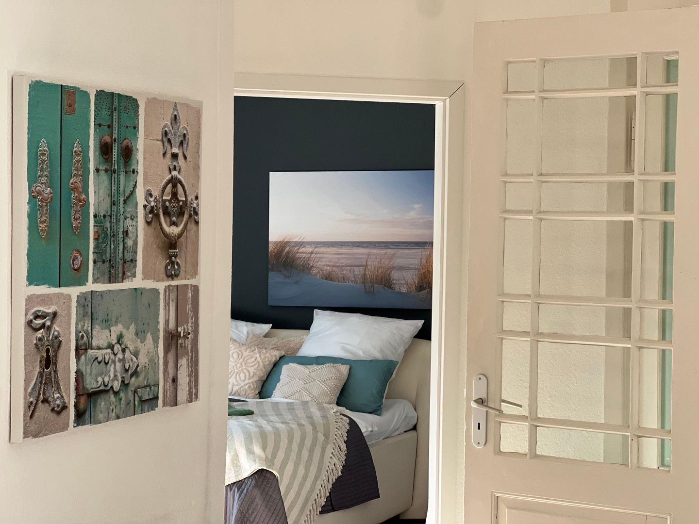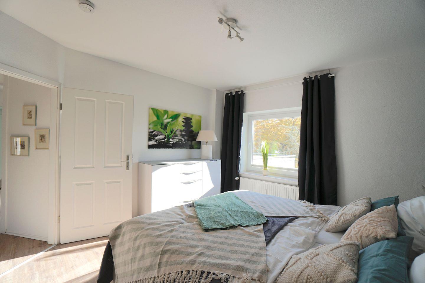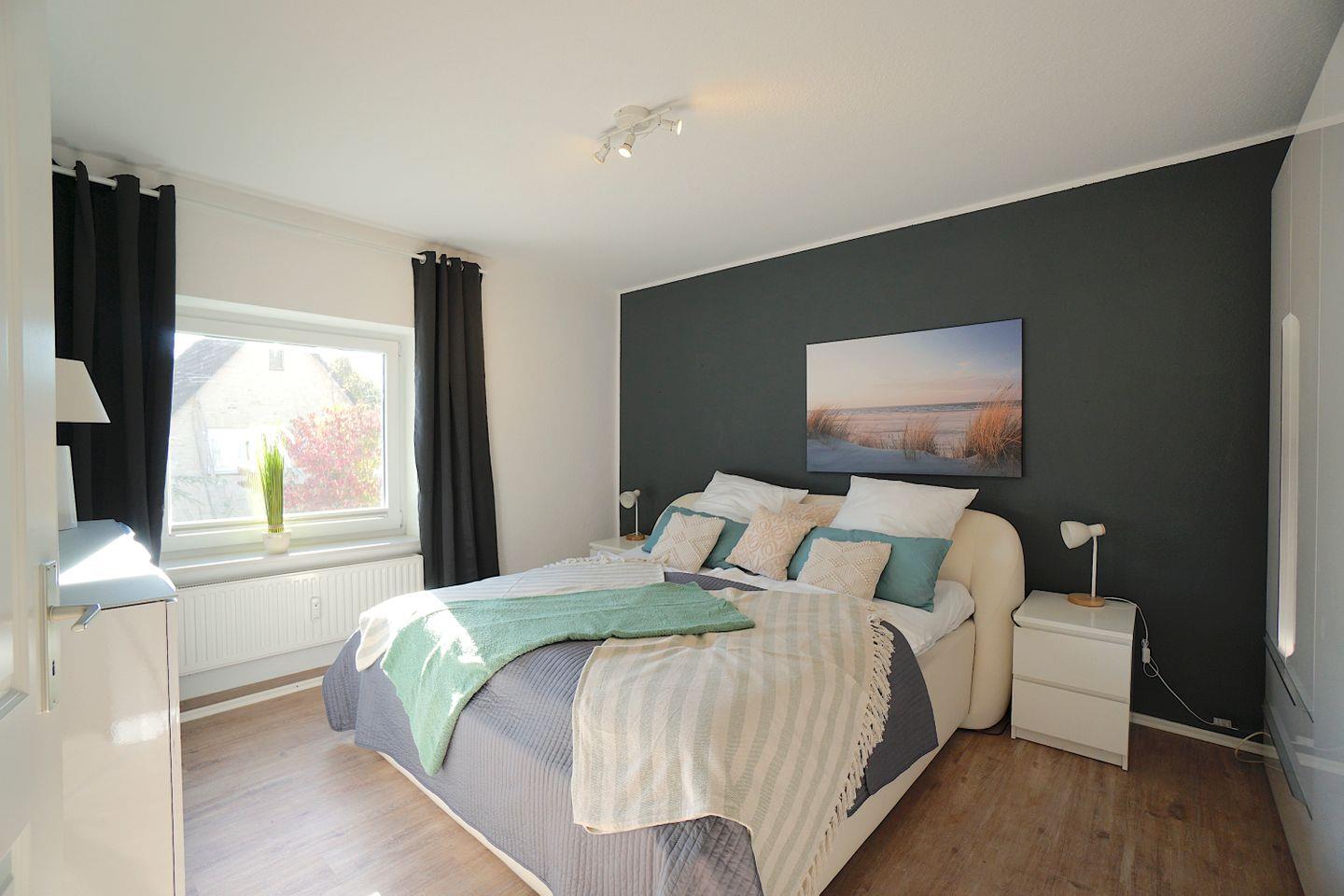 Über eine wunderschöne Treppe gelangt man in die hübsche Wohnung. Oben angekommen, befindet sich rechts das komfortable Schlafzimmer mit einem gemütlichen Doppelbett und einem geräumigen Kleiderschrank. Hier erwacht man mit dem Blick auf die Eckernförder Bucht.