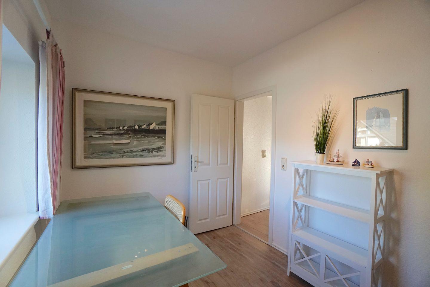 Gegenüber dem Wohnzimmer liegt das moderne Vollbad, mit Badewanne und Tageslicht und die vollausgestattete Küche mit einem weiteren Esstisch. Die Küche liegt zur Straßenseite und bietet alles was man für einen Ferienaufenthalt gebrauchen kann.