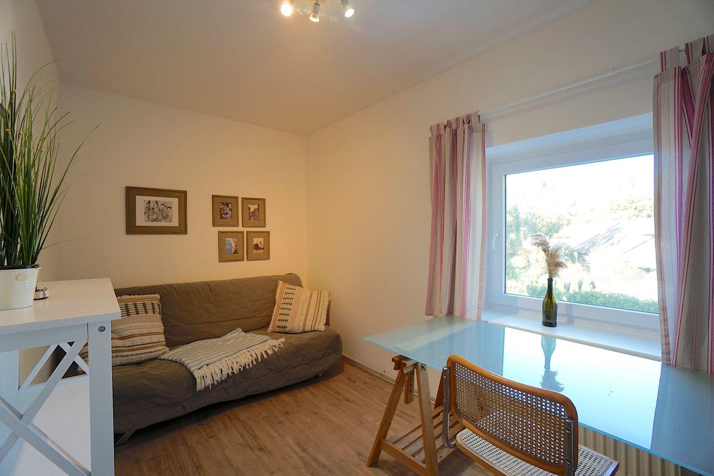 Auch zur Straße gelegen liegt ein weiteres kleines Zimmer mit einem Schreibtisch und einem Schlafsofa. Hier können problemlos zwei weitere Personen untergebracht werden.