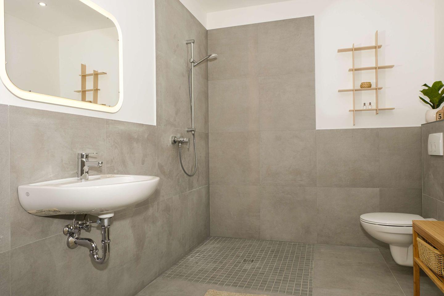 Die Wohnung befindet sich im Erdgeschoss. Die Türen im Eingangsbereich sowie in der Wohnung wurden in einem breiterem Format gestaltet. Hier kannst Du zum Beispiel auch mit einem Rollstuhl in die Wohnung gelangen.