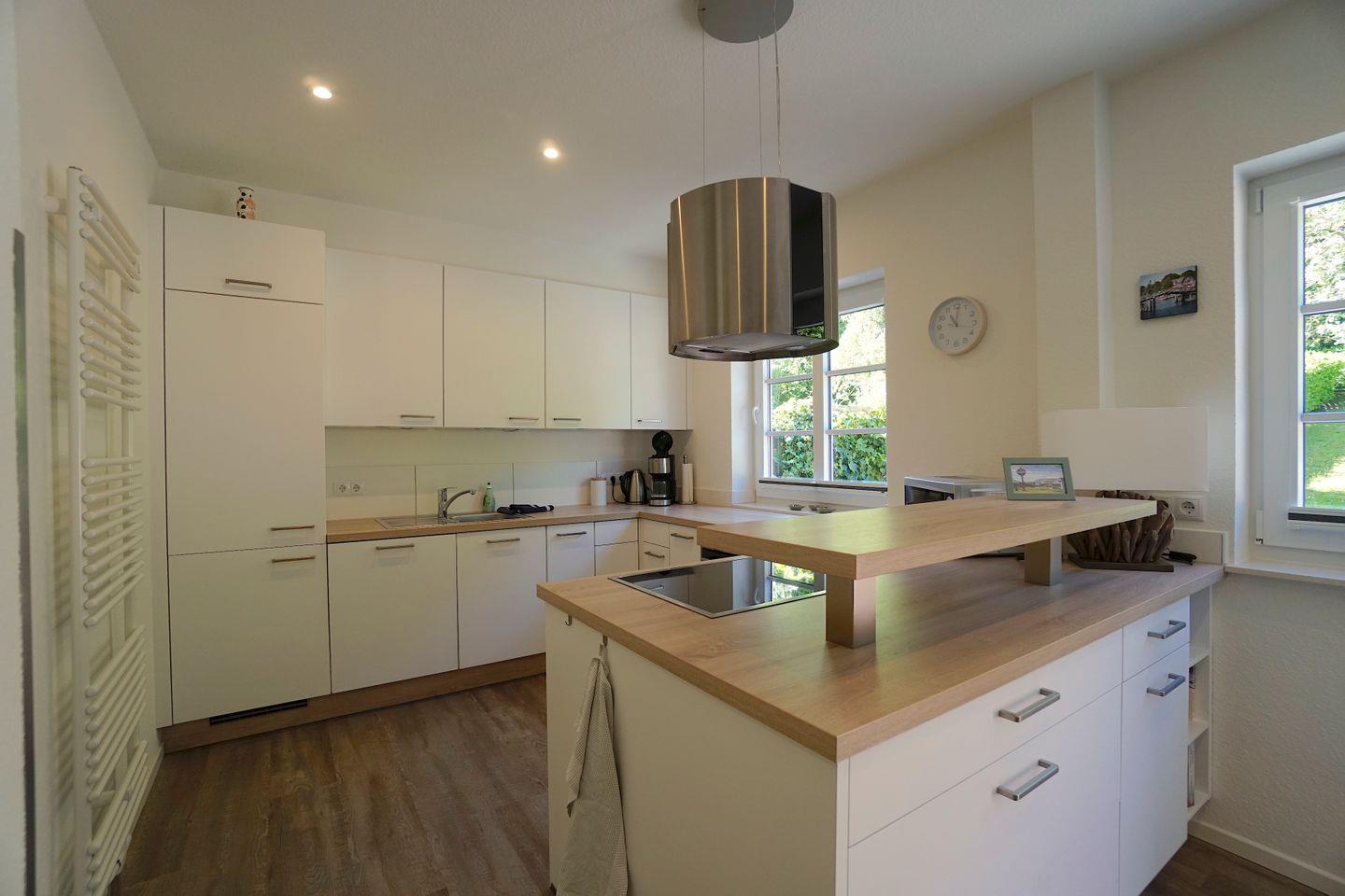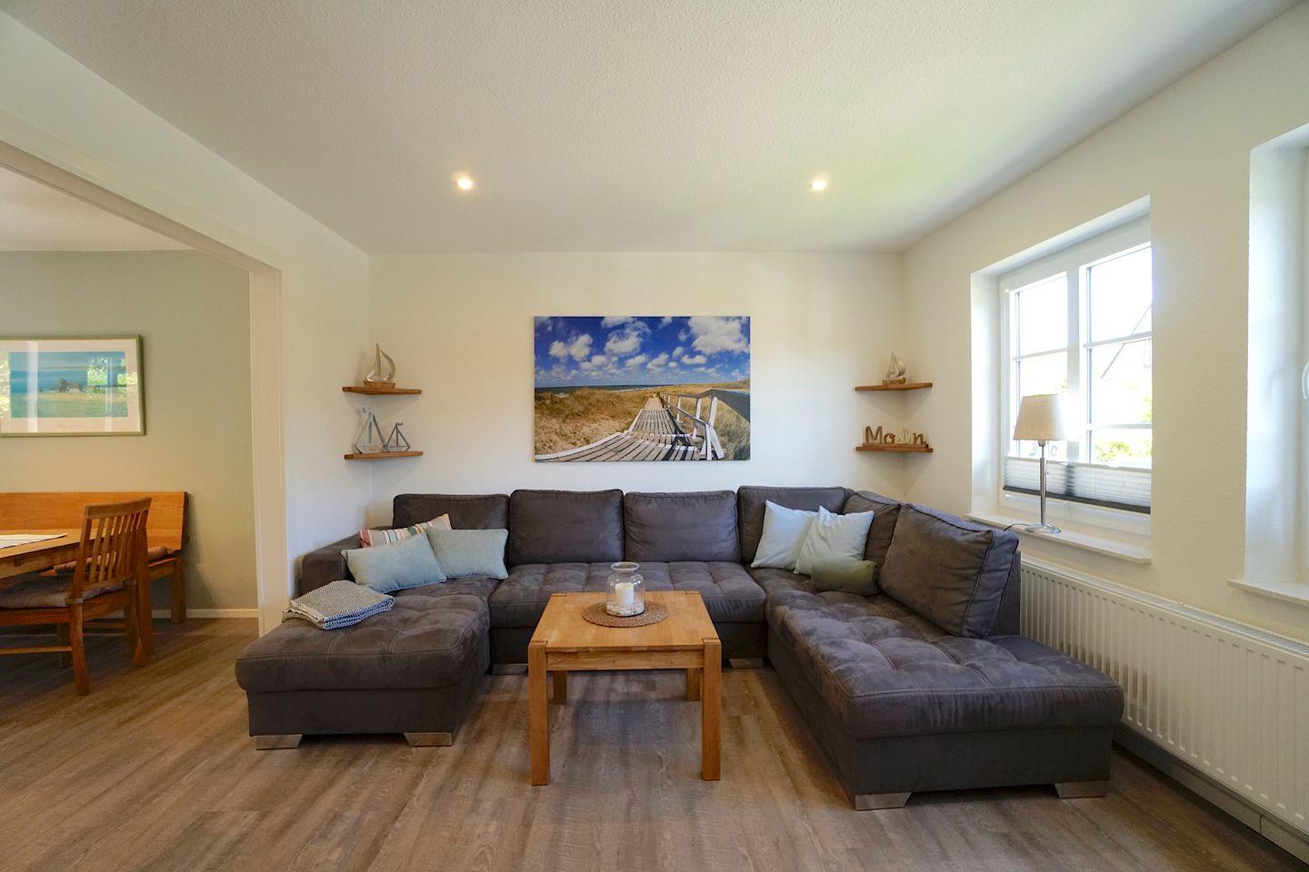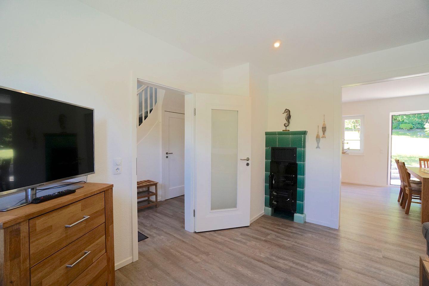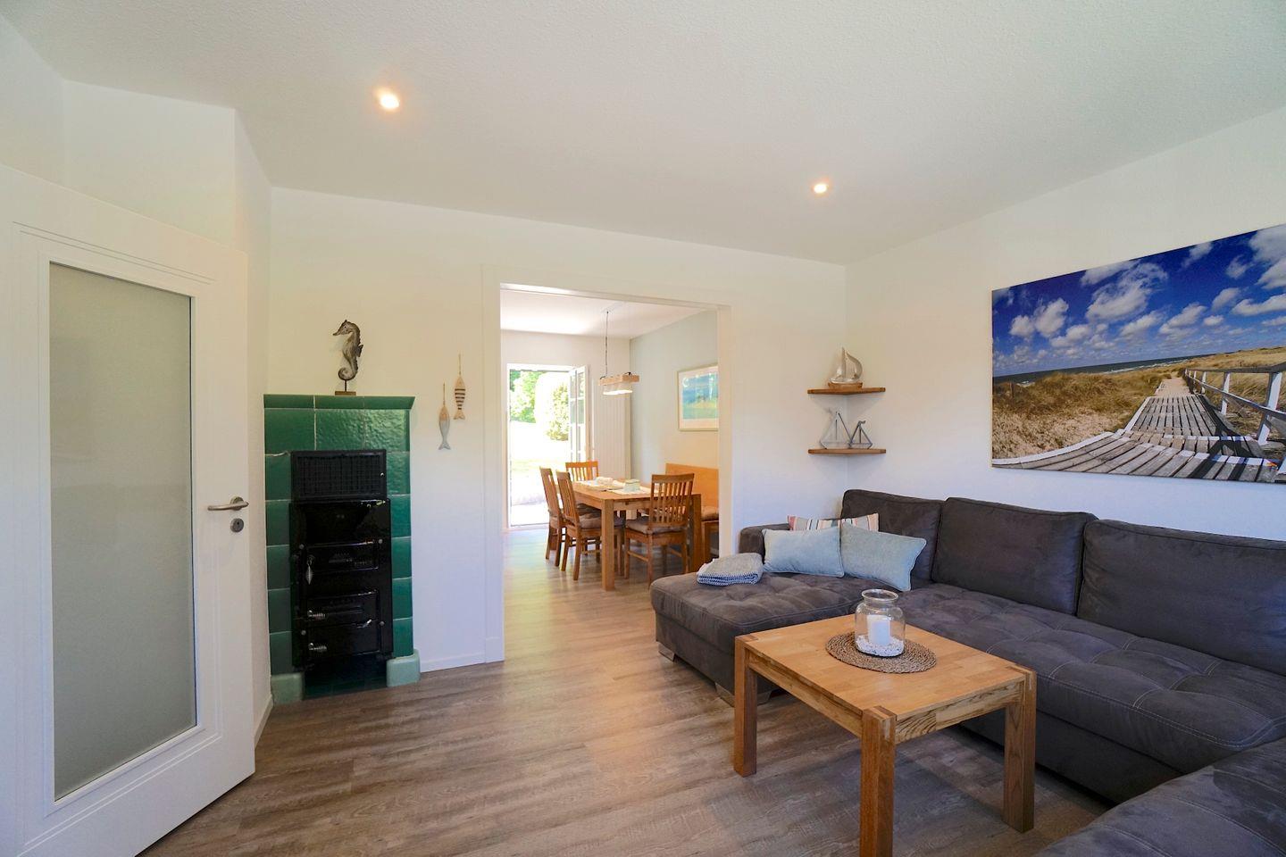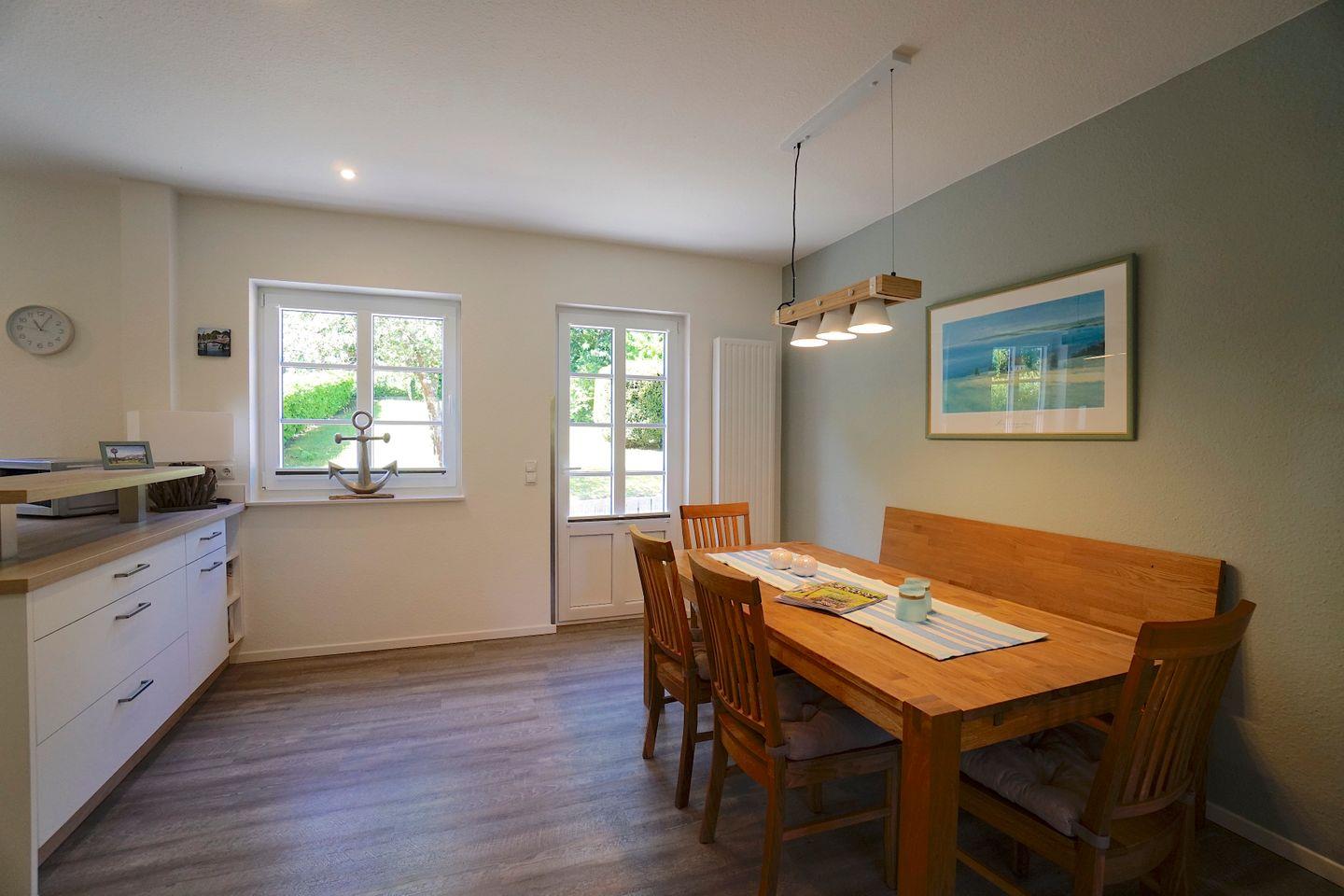 Das Ferienhaus besticht durch seine Kombination aus traditionellem Charme und modernem Komfort. Im Jahr 2019 renoviert, bietet es alles, was ihr für einen entspannten Aufenthalt benötigt. Die offene Küche, die direkt zum Wohnzimmer führt, ist mit sämtlichen Annehmlichkeiten ausgestattet, darunter ein Herd, eine Spülmaschine, ein Kühlschrank und ein Elektrogrill. Perfekt für gesellige Kochabende oder ein gemütliches Frühstück im Essbereich. Der Wohnzimmerbereich lädt mit einer Sofaecke und einem Fernseher zum Relaxen ein, während eine Auswahl an Büchern und Spielen die Freizeitgestaltung für Groß und Klein bereichert.