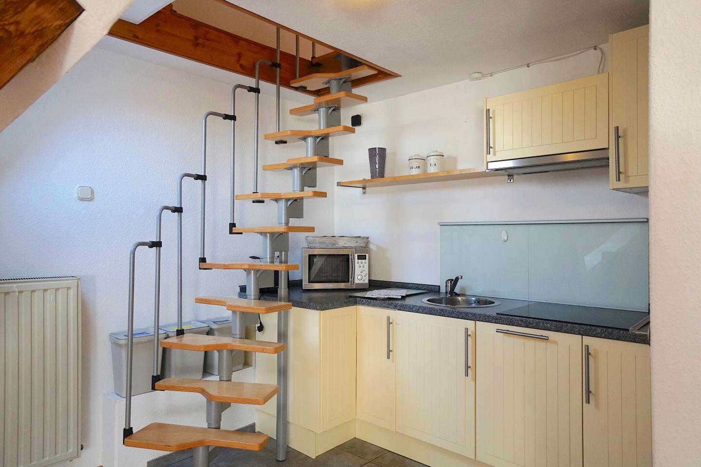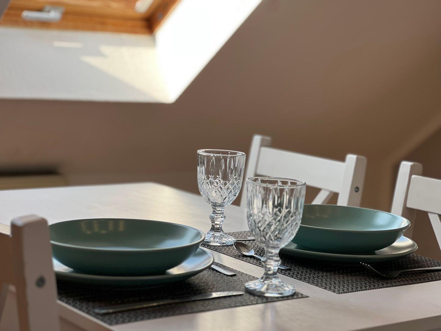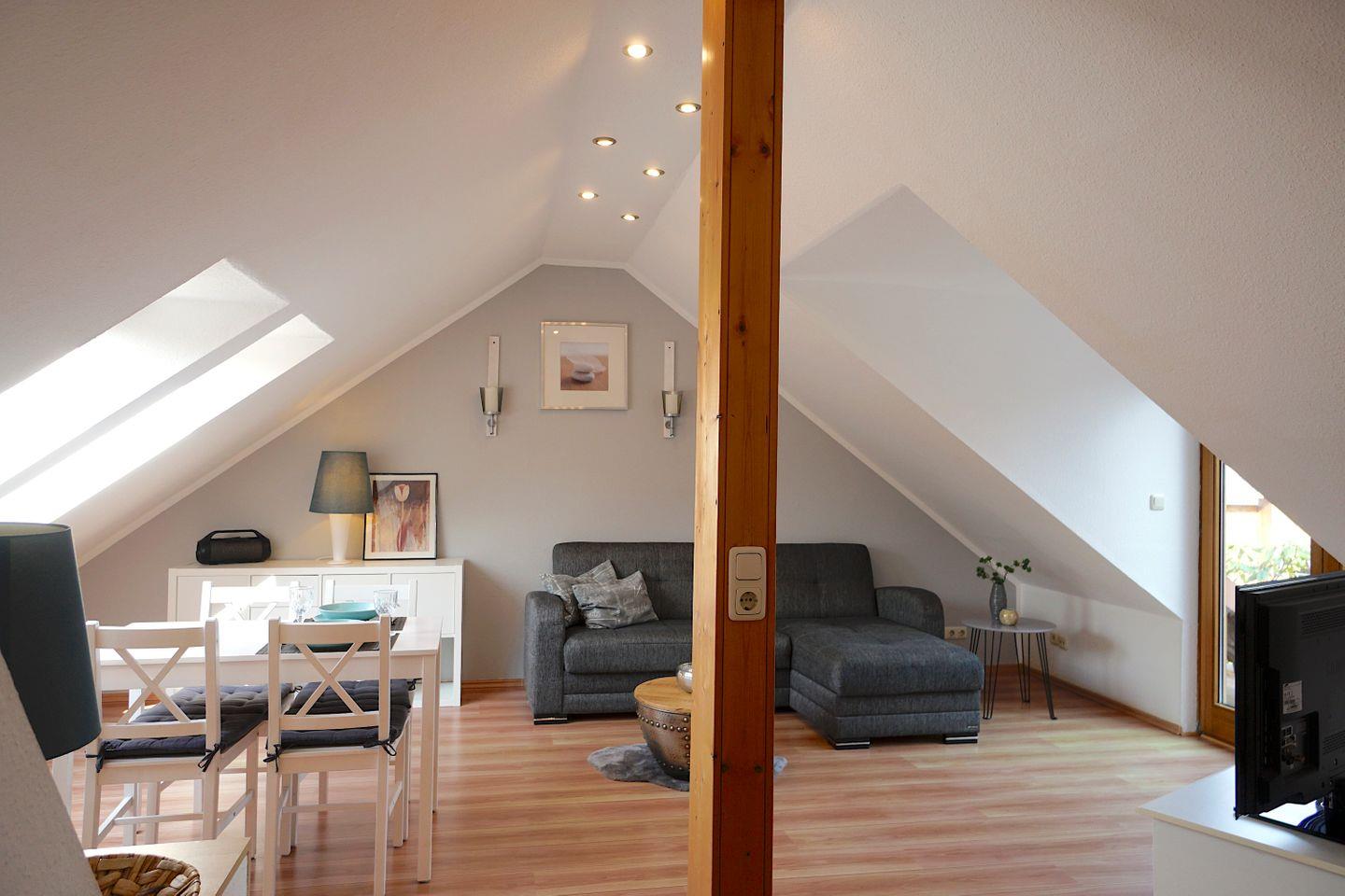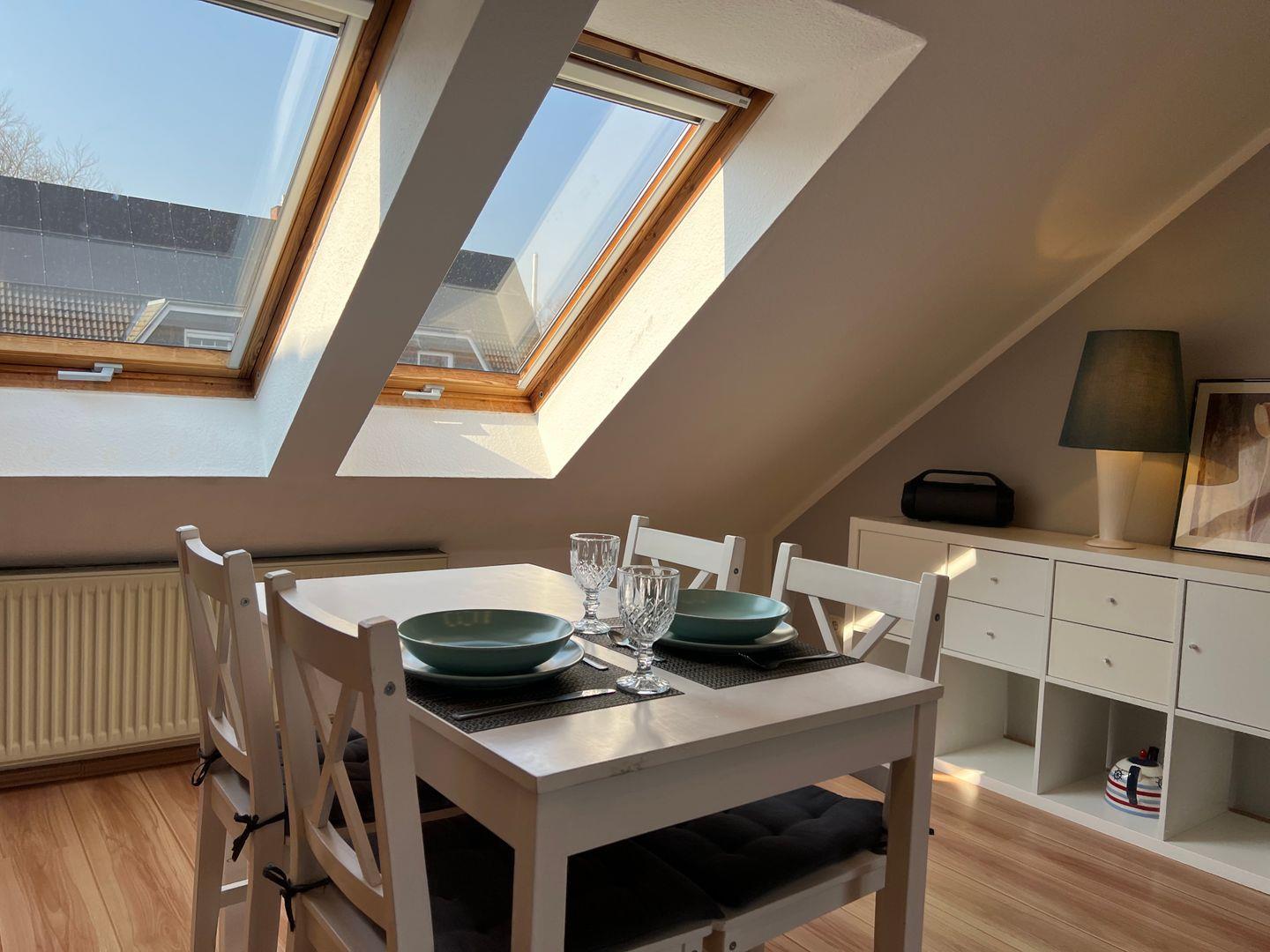 Die offene Küche ist voll ausgestattet und bietet alles, was ihr benötigt, um eure Lieblingsgerichte zuzubereiten. Hier findet ihr einen Herd mit 4 Platten, einen Backofen, einen Kühlschrank mit Gefrierfach, eine Mikrowelle, eine Kaffeemaschine sowie weitere Küchenutensilien und Geschirr. Der Essbereich in der Küche lädt dazu ein, gemeinsame Mahlzeiten mit Ihren Liebsten zu genießen. Das Wohnzimmer ist hervorragend gestaltet und bietet eine Sofaecke, einen Esstisch und einen Fernseher, an dem Sie entspannte Abende verbringen können. WLAN ist selbstverständlich vorhanden und sorgt dafür, dass ihr auch im Urlaub internetfähig bleibt.