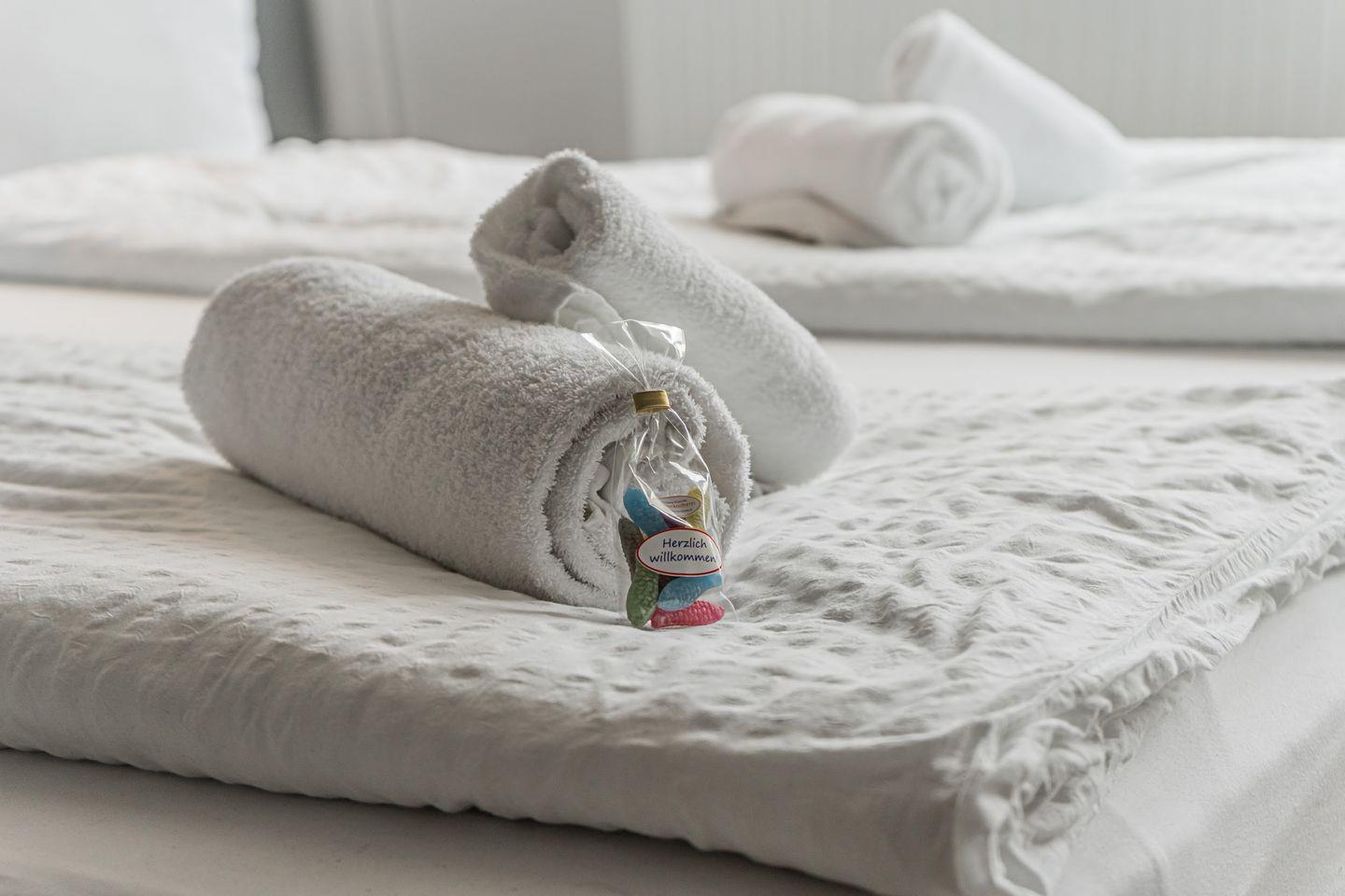 Das Badezimmer ist mit einer Dusche mit Wanne ausgestattet und verfügt über ein Waschbecken, WC, Spiegel, Kosmetikspiegel sowie Fenster für Tageslicht. Handtücher, Badetücher, Seife und Shampoo stehen als Erstausstattung bereit, ebenso wie Bettwäsche.