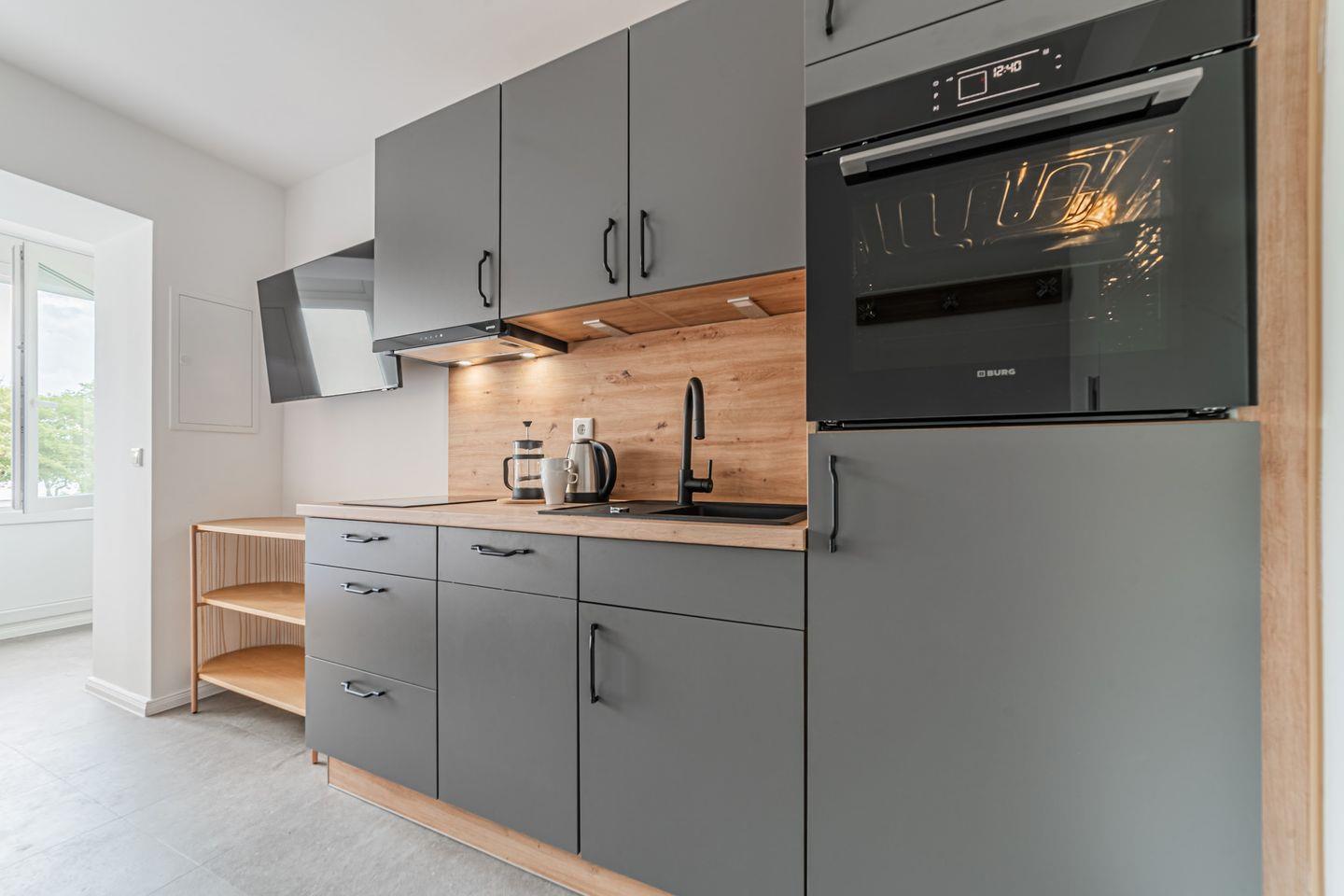 In der praktischen Kochnische finden Sie umfangreiche Ausstattung für eine komfortable Selbstverpflegung: Ein Elektro-Backofen, ein 2-Platten-Herd, Kühlschrank mit Gefrierfach, Spülmaschine, Wasserkocher, Toaster sowie eine Kaffeemaschine und umfangreiche Küchenutensilien stehen Ihnen zur Verfügung. Der Essbereich mit Esstisch bietet einen angenehmen Platz für gemeinsame Mahlzeiten.
