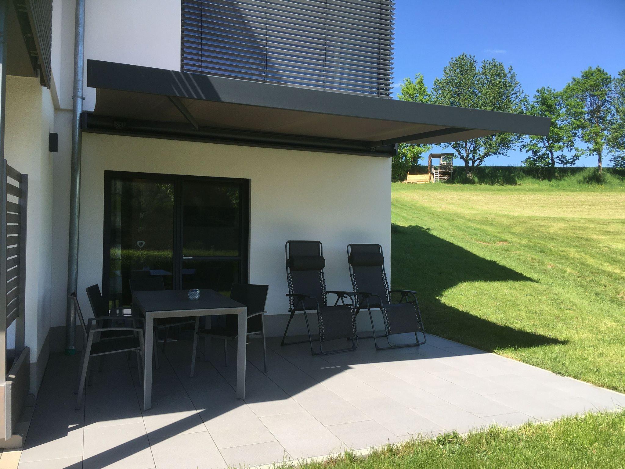 Vom nach Süd-Osten ausgerichteten Wohnzimmer geht es hinaus zur großzügigen Sonnentrasse