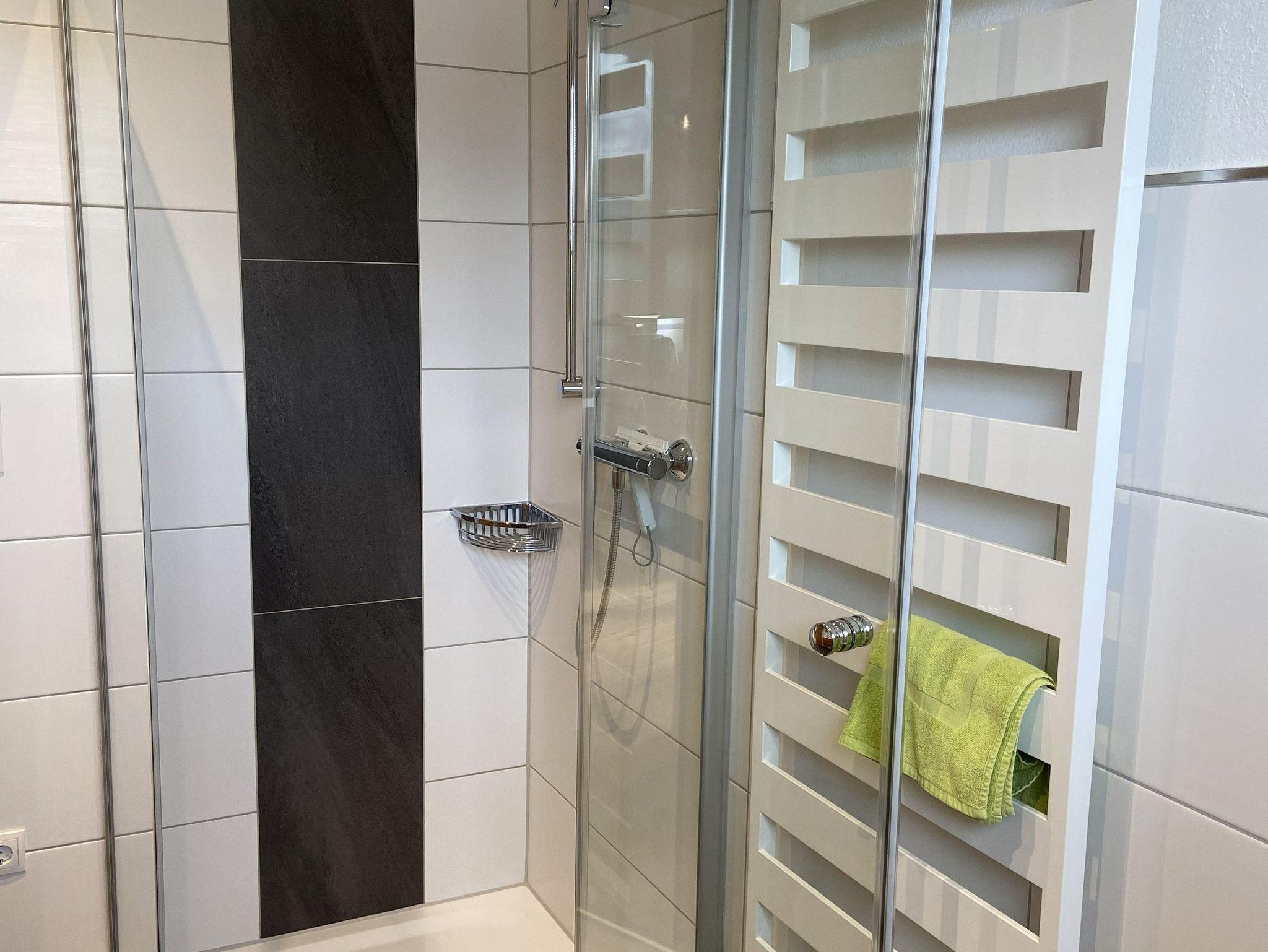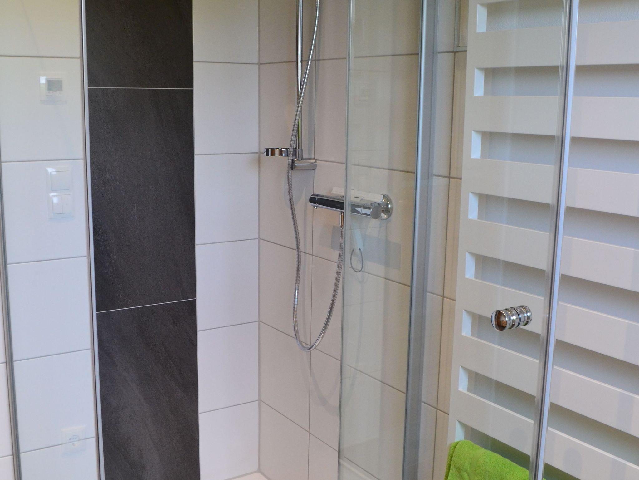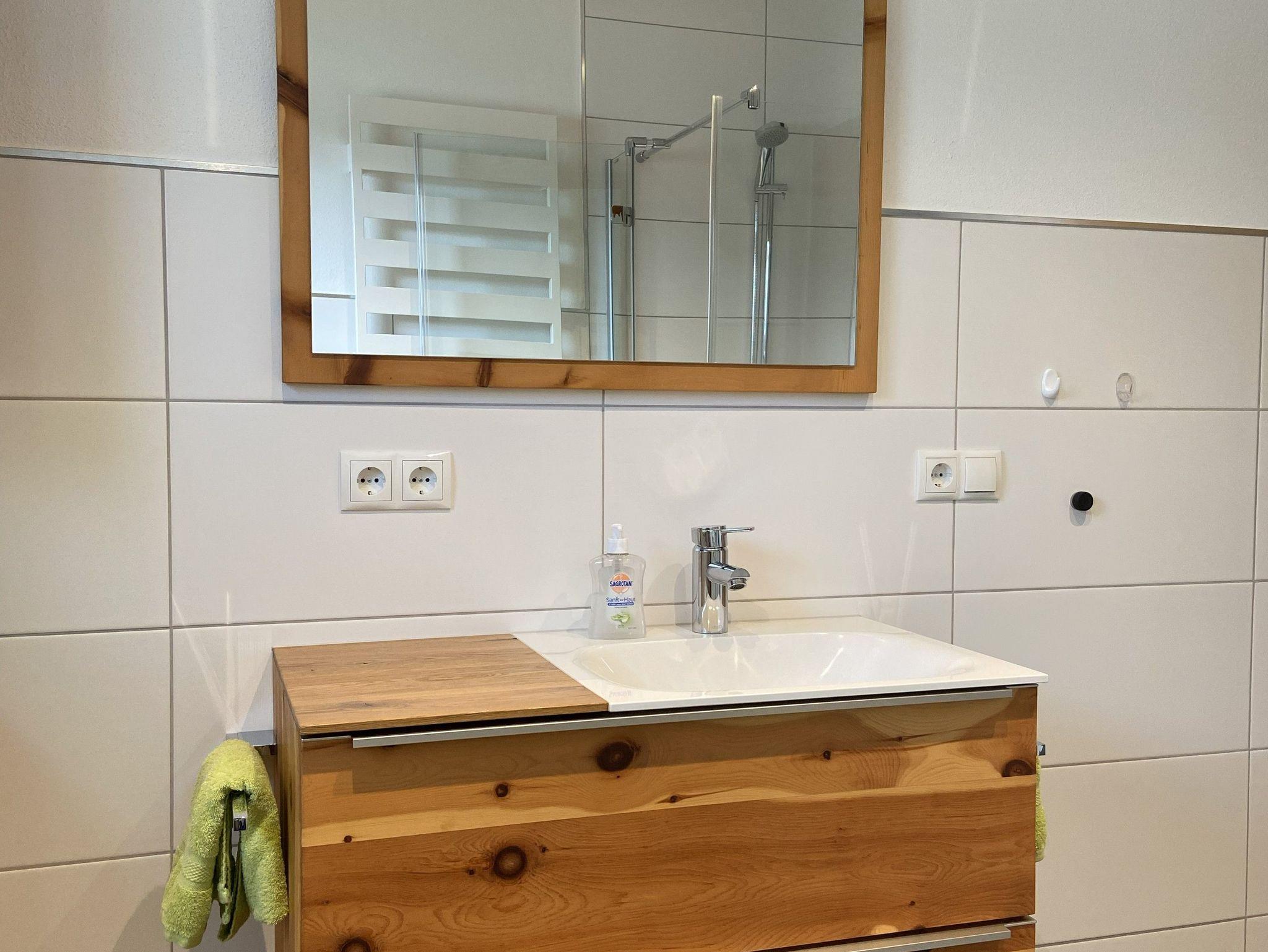 Das Bad ist mit DU/WC, Föhn, Handtuchtrockner und mit genügend Ablagemöglichkeiten eingerichtet.