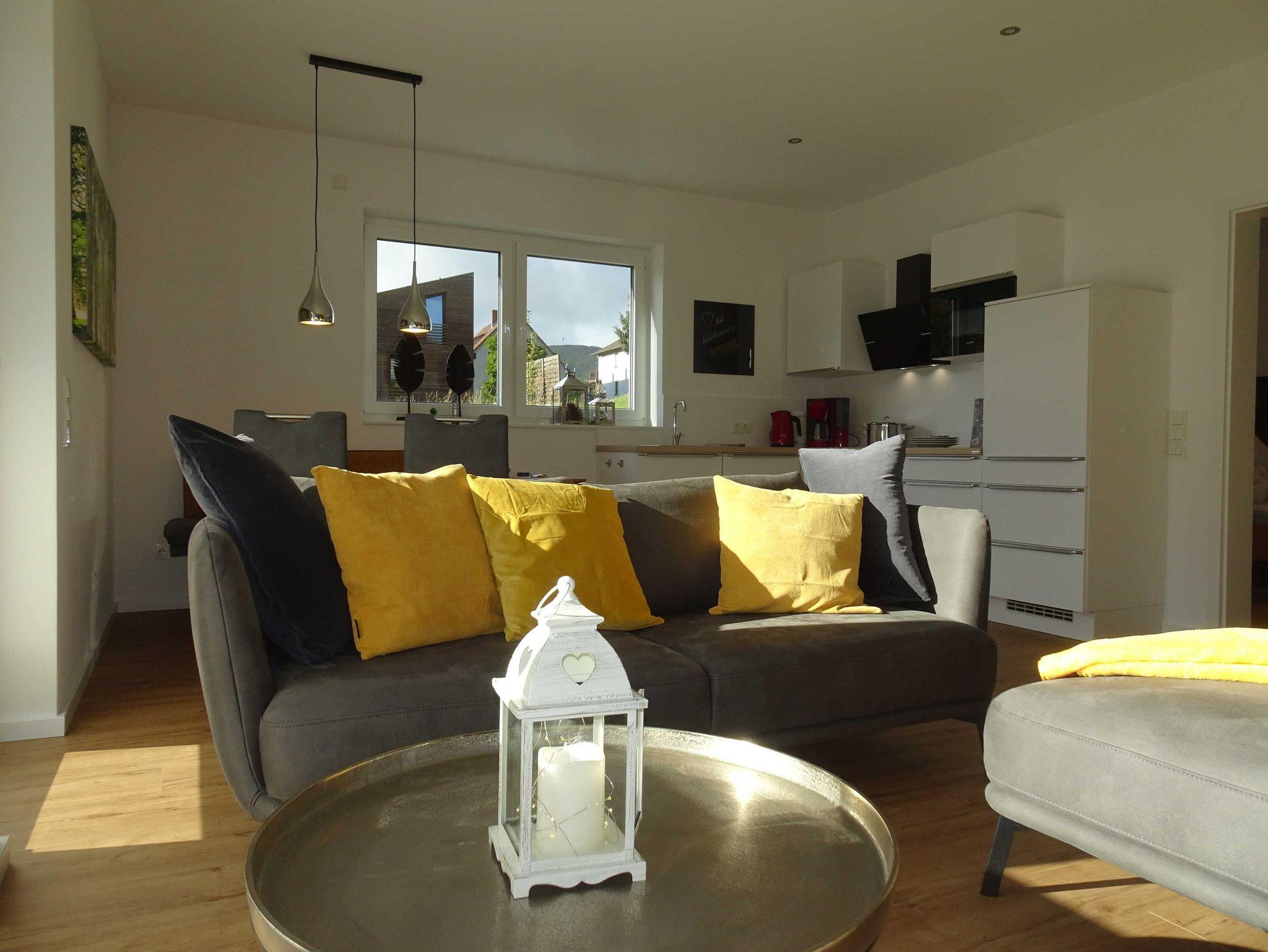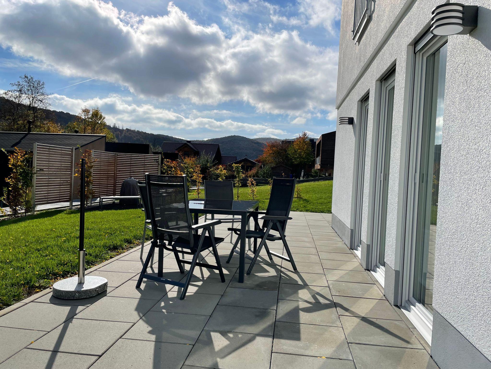 Die offene und liebevolle Gestaltung des Wohn - Essbereichs mit 55 Zoll Smart TV lädt nach einem ereignisreichen Tag zum Entspannen oder zu geselligen Abenden ein. Nur ein Schritt durch die Terrassentür und du bist auf der großen Terrasse mit Blick auf die umliegenden Wälder. Hier kannst du ungestört bei einem Gläschen Wein den Sternenhimmel beobachten und den Tag ausklingen lassen oder als erster in aller Ruhe den Morgenkaffee genießen.