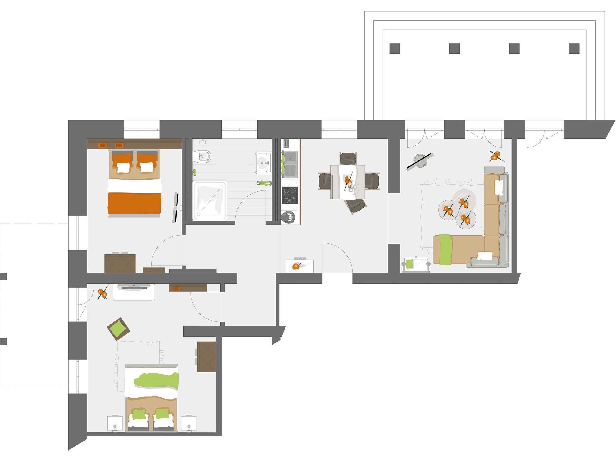 Die Dreiraum-Ferienwohnung liegt im Parterre unseres charmanten Haupthauses. Auf 65 qm ist eine Wohlfühloase für bis zu vier Personen entstanden, in der Sie den Alltag hinter sich lassen können.