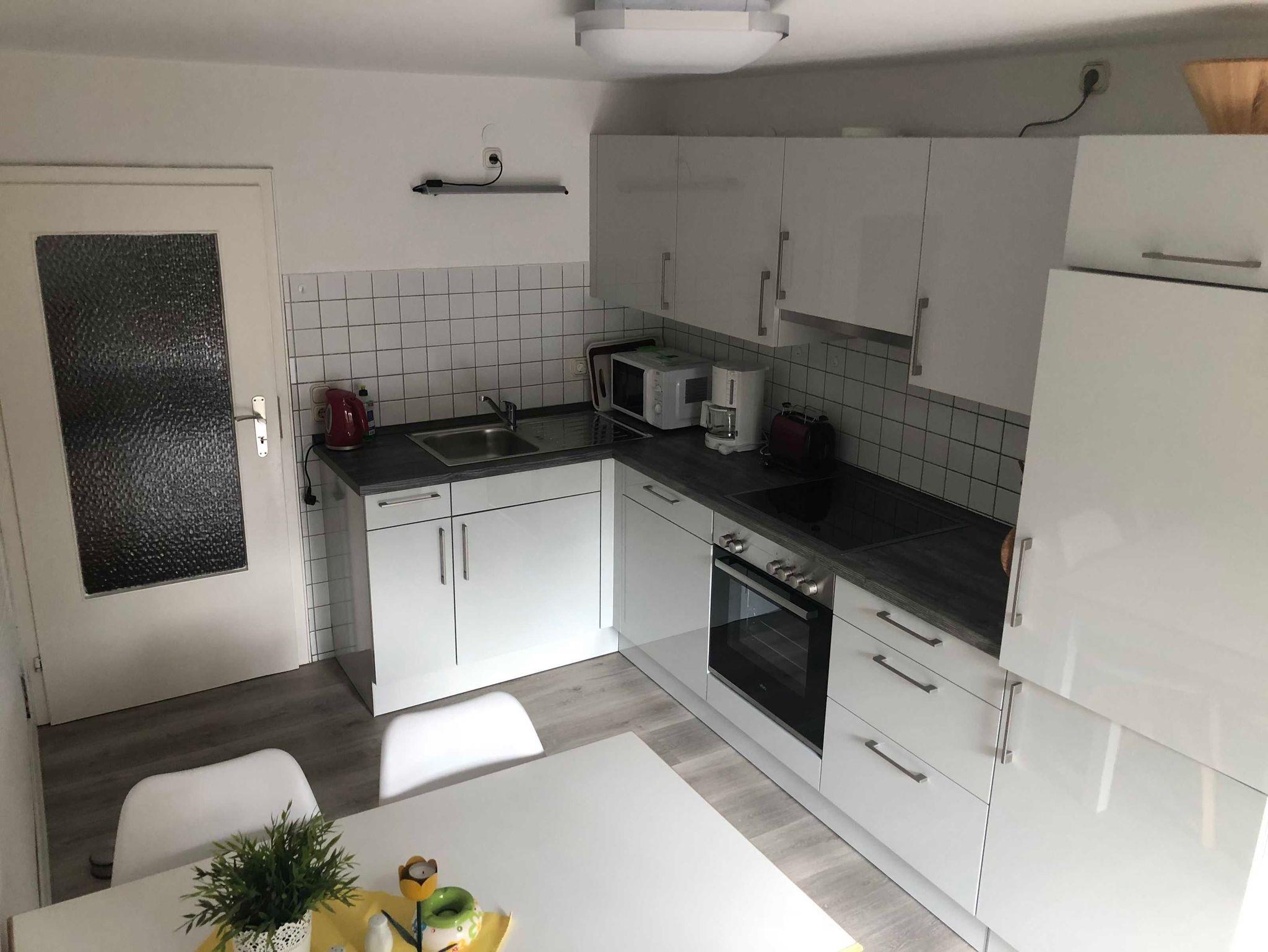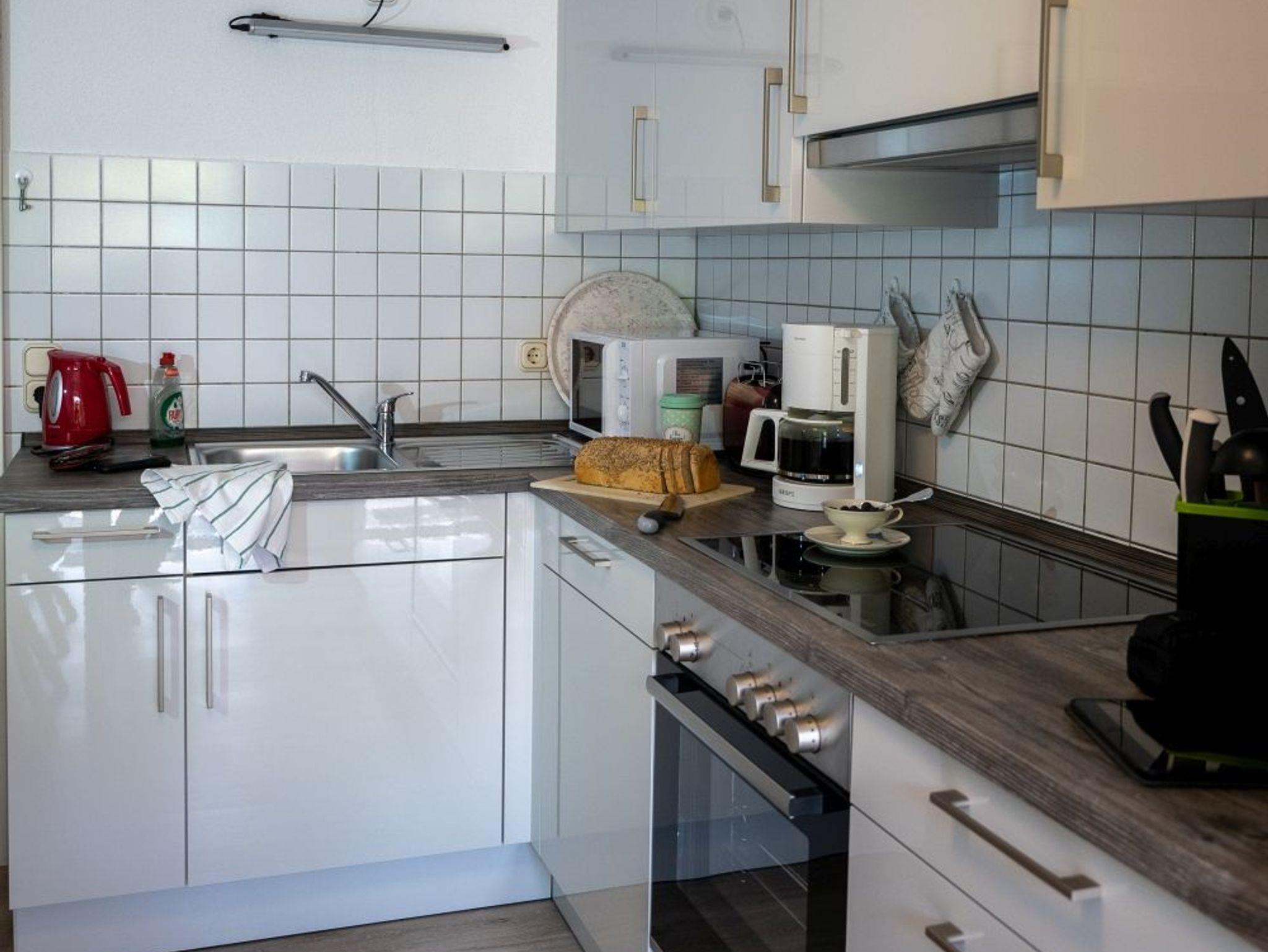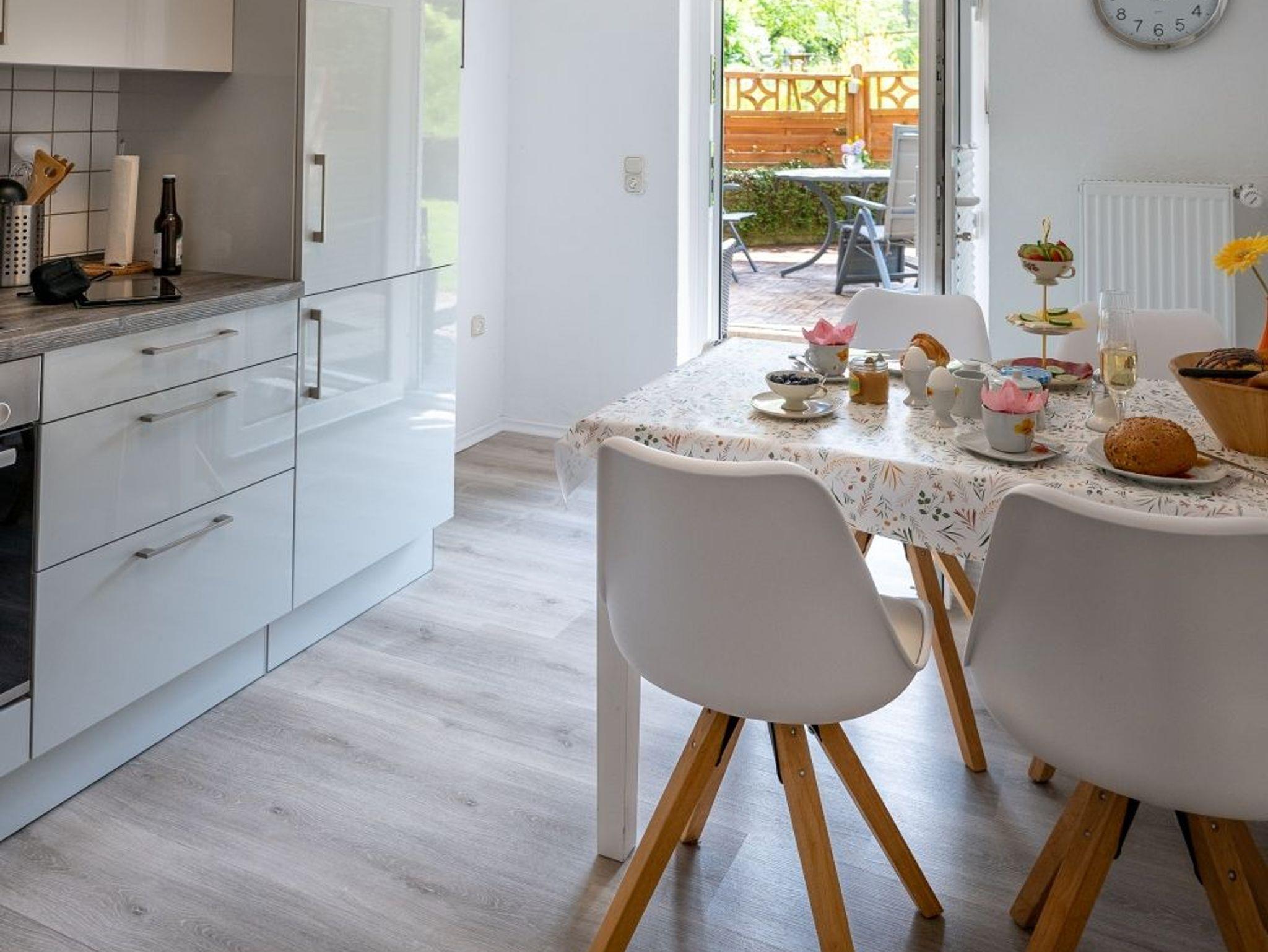 Die Küche mit Anrichte und Essbereich ist zusätzlich mit einem Ceranfeld, einem Backofen, einem Kühlschrank und einer Spüle sowie einer Spülmaschine ausgestattet. Mit Toaster, Kaffeemaschine, Wasserkocher und einem umfangreichen Teller-, Tassen-, Besteck- und Service-Set fehlt es Ihnen an nichts. Durch eine Terrassen-Tür besteht über die Küche ein Zugang in den Gartenbereich.