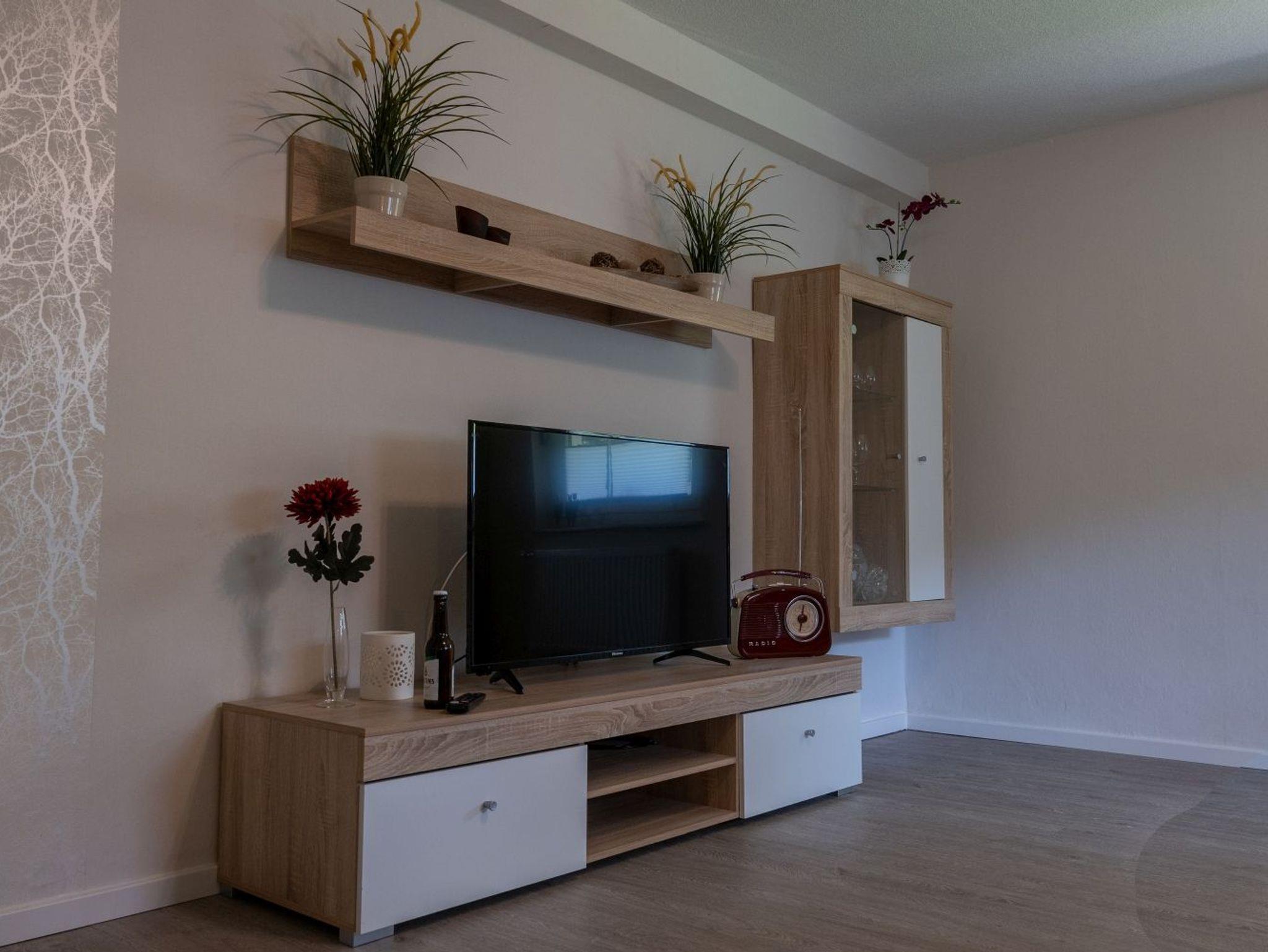 Im geräumigen Wohnzimmer mit Fernseher, Sat-Anschluss, Couch und Tisch stehen gemütlichen Spiele-Abenden nichts mehr im Wege. Auch eine große Brettspiele-Sammlung ist Teil der Einrichtung. Die große Couch kann zu dem noch als zusätzlicher Schlafplatz genutzt werden.