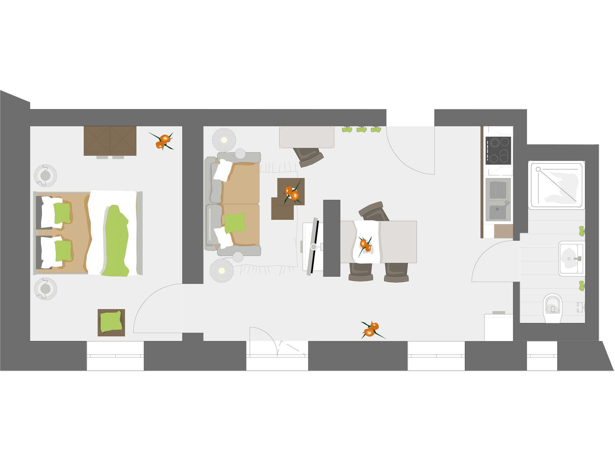 Die Zweiraum-Ferienwohnung mit 40 qm liegt im Erdgeschoss des freistehenden Haupthauses. Mit dem Lift gelangt man ganz ohne Treppensteigen zu seinem ganz persönlichen Ferientraum.