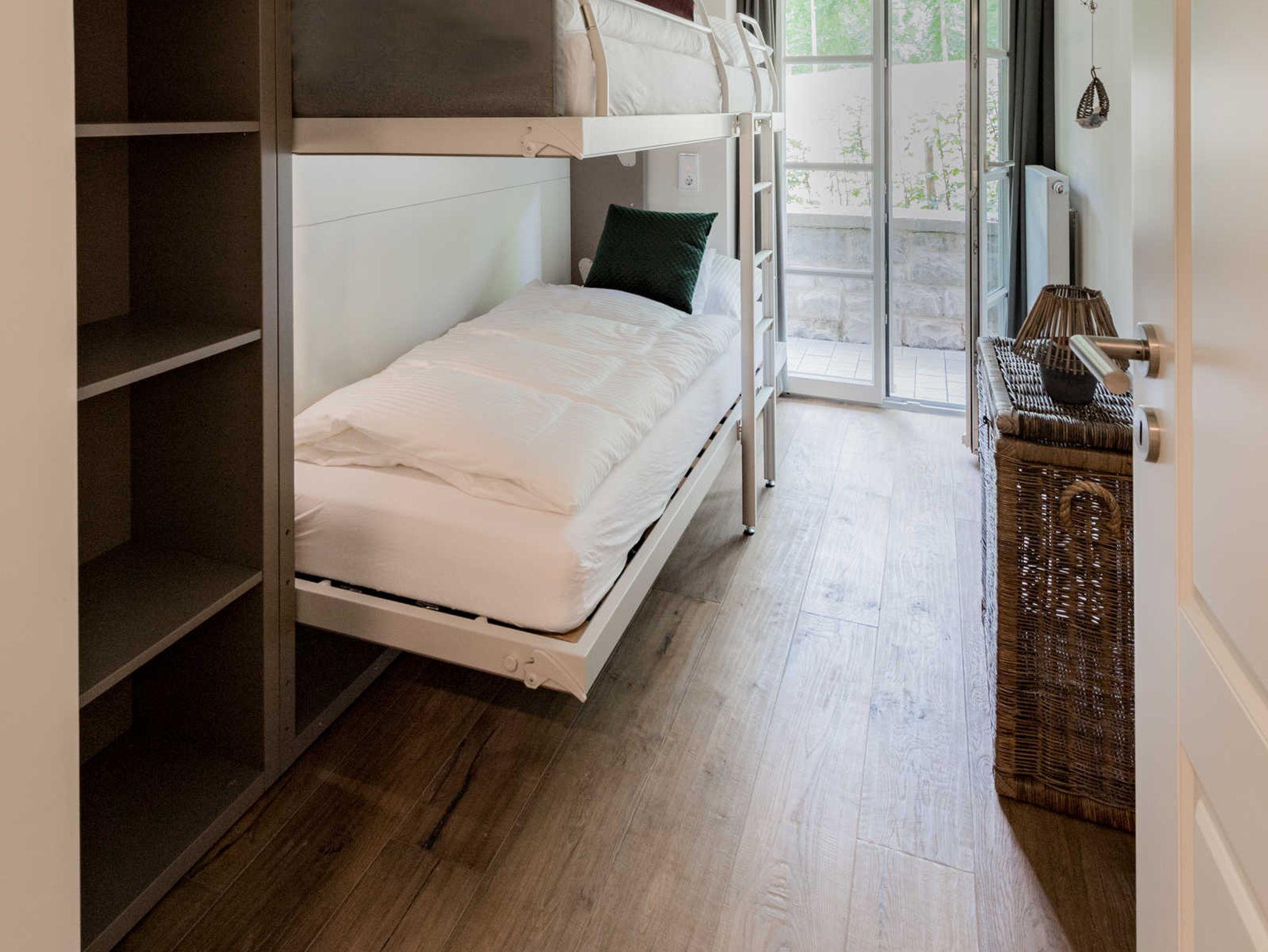 Von der Mikrowellen-/Ofenkombination ist über Ceranfeld und Spülmaschine bis zur Kaffeemaschine in der sehr gut ausgestatteten Küche alles vorhanden. Es erwarten Sie zwei separate Schlafzimmer für insgesamt vier Personen. Das große Schlafzimmer ist mit einem Boxspringbett ausgestattet, das zweite Schlafzimmer können Sie flexibel nutzen, denn dort finden Sie zwei einzeln klappbare, komfortable Einzelbetten, die wie ein Etagenbett übereinander liegen. So haben Sie Platz für zwei Kinder oder eine zusätzliche Spielmöglichkeit. Wenn Sie eines oder auch beide Betten nicht benötigen, dann klappen Sie sie einfach hoch.