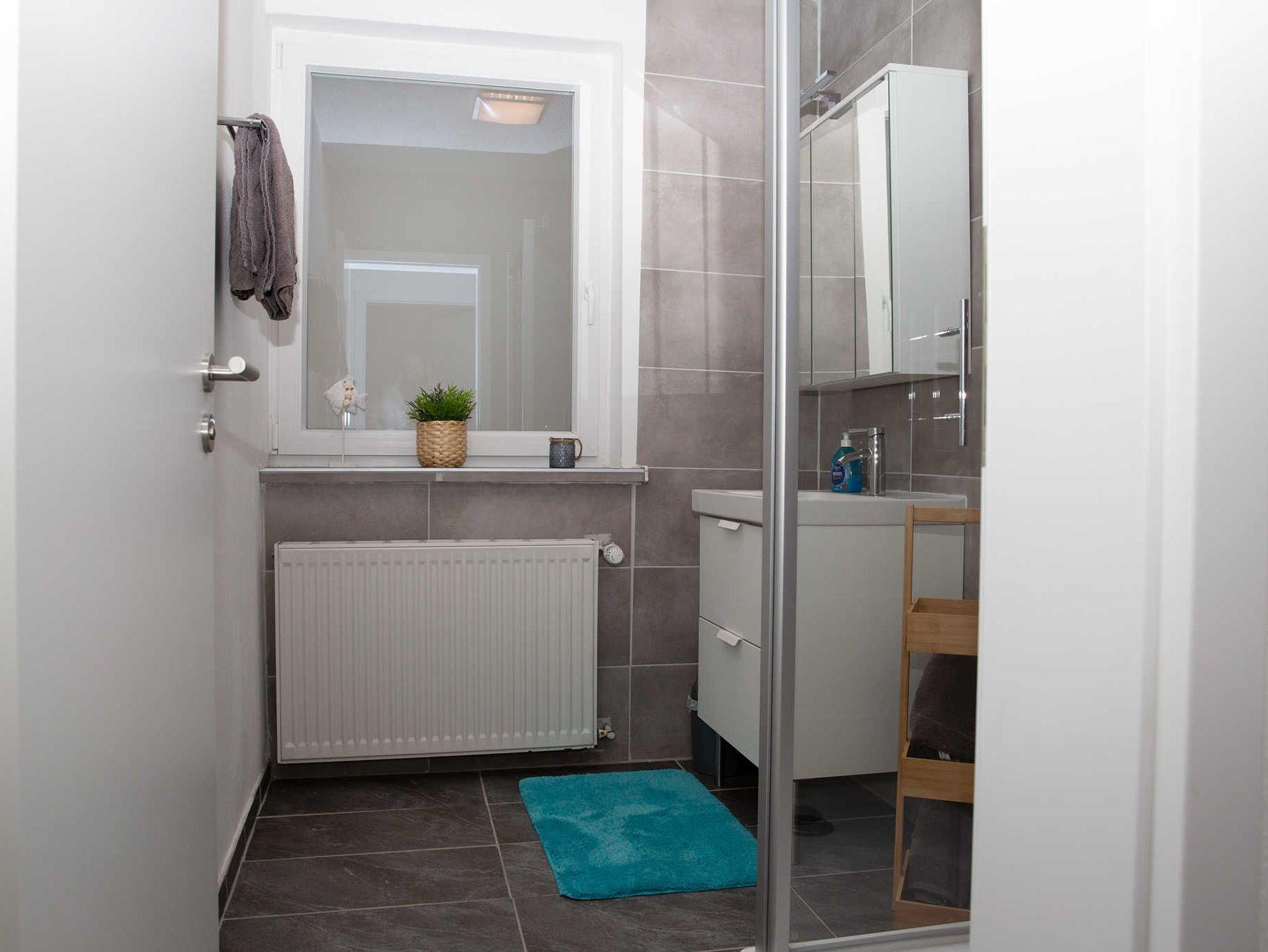 ? Das Dusch-Bad verfügt über Dusche, Waschbecken mit Ablagemöglichkeiten und Föhn.
