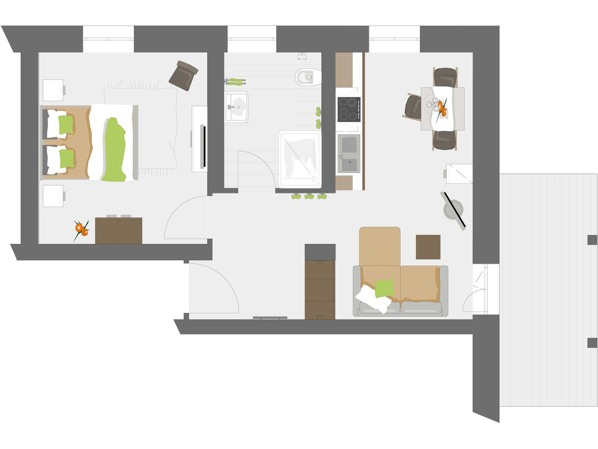 Die komplett ausgestattete Küche bietet vom Ceranfeld und Spülmaschine über Mikrowellen/Backofen-Kombination, alles was das Urlauberherz benötigt. Vom Wohn-/Esszimmer aus erreicht man bequem den eigenen großen Holzbalkon. Das gemütliche Sofa lädt ein zum Träumen und Relaxen.