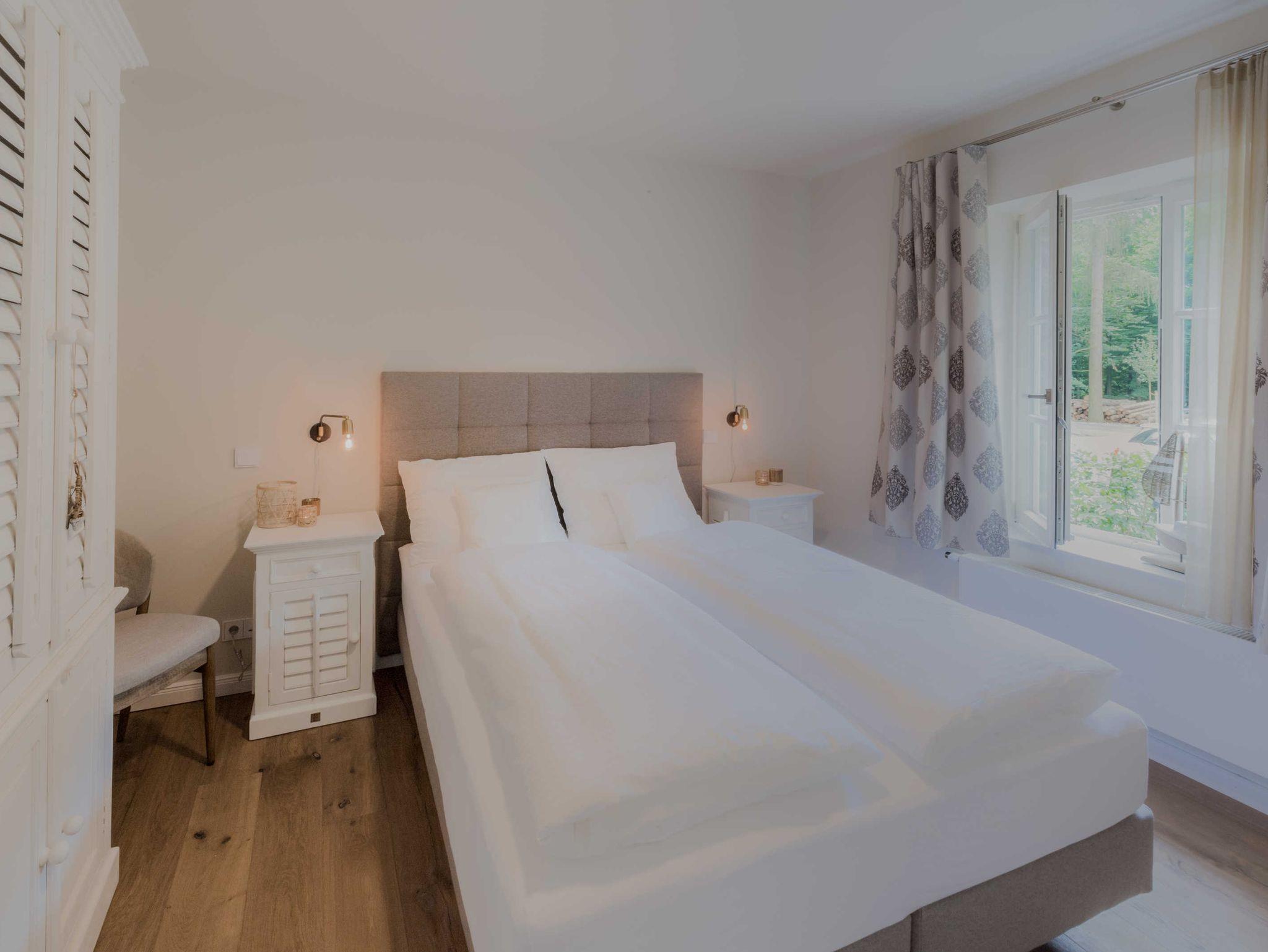 Im separaten Schlafzimmer erwartet den Urlauber ein komfortables Boxspringbett – hier sind süße Träume garantiert. Das Bad ist ausgestattet mit einem WC, Waschbecken sowie einer Glasdusche mit Regenschauerbrause und Fenster.