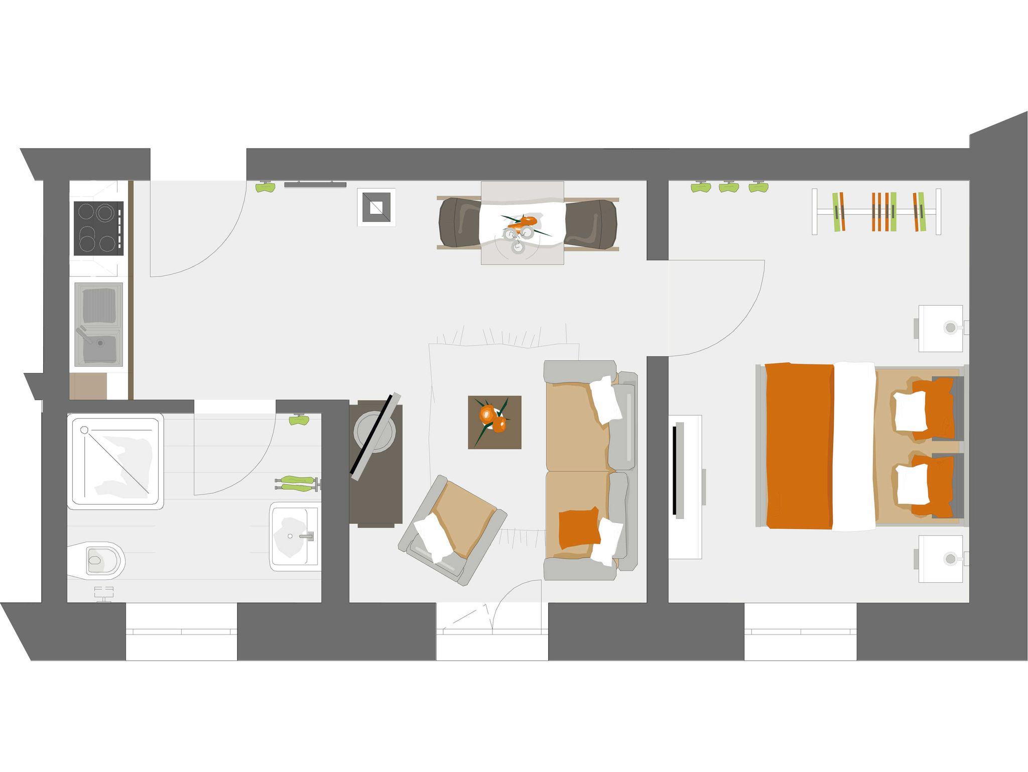 Die 35 qm große Zweiraum-Ferienwohnung für zwei Personen liegt im Erdgeschoss des freistehenden Haupthauses. Mit dem Lift gelangt man ohne Treppensteigen zu seinem ganz persönlichen Ferientraum.