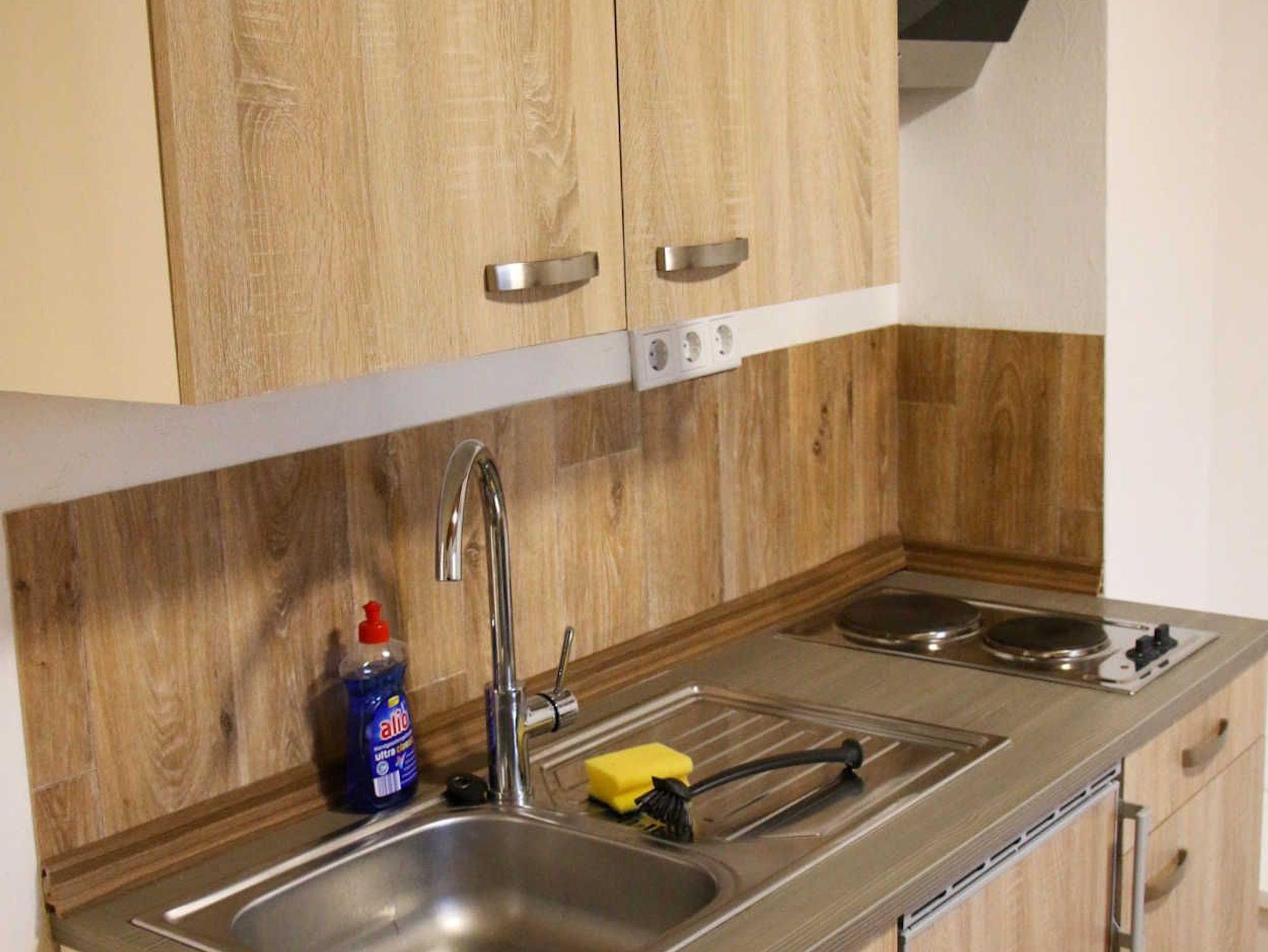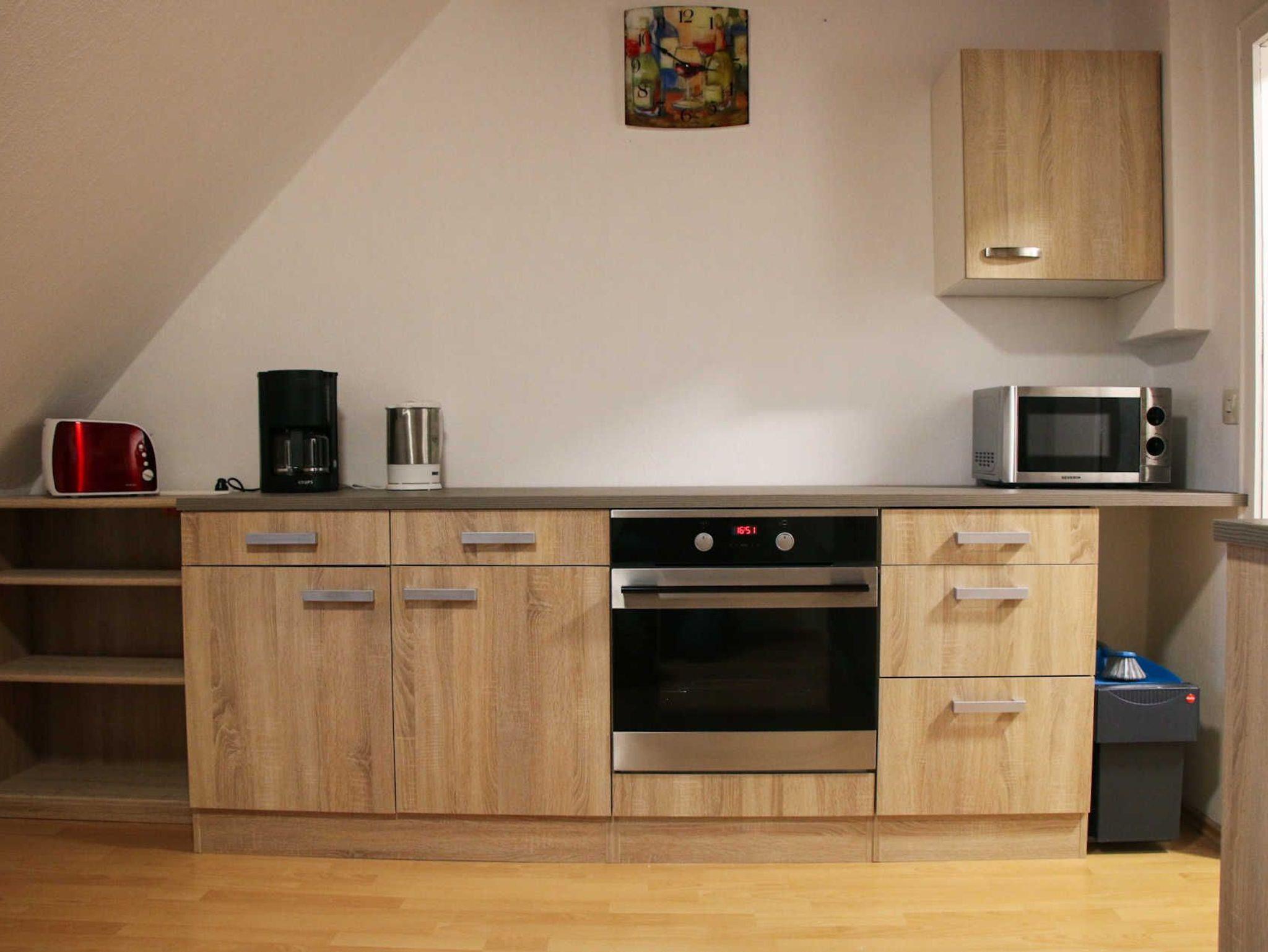 Die Küche ist ausgestattet mit einem Backofen, Kochfeld, einer Microwelle, Kaffeemaschine (Filter), Wasserkocher, Toaster, Kühlschrank mit Eisfach.