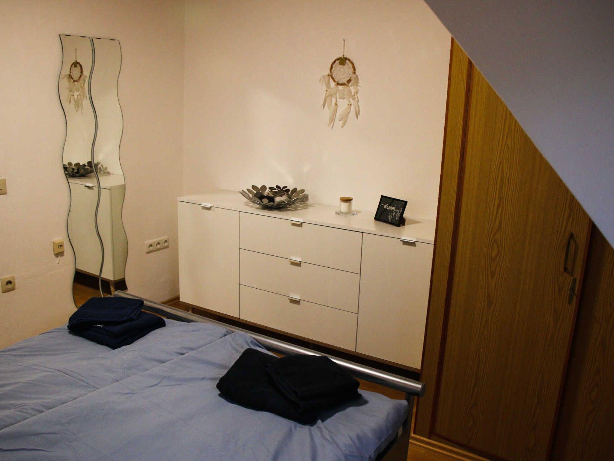 In Schlafzimmer 1 befindet sich ein französisches Doppelbett (1,40x2m), Kommode und Kleiderschrank.