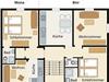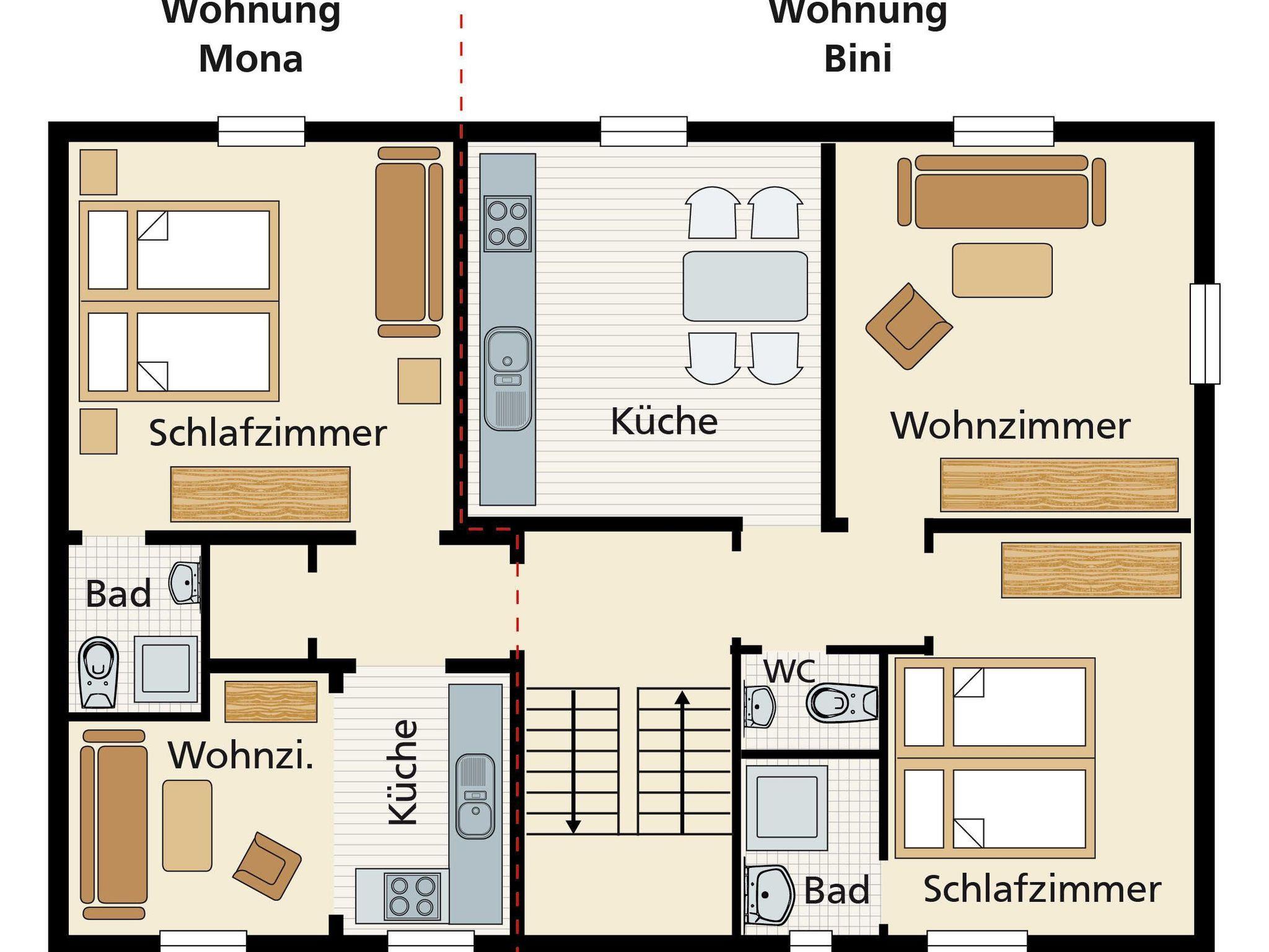 Die Ferienwohnung Bini 1. OG , Größe 53 qm, besteht aus 1 Wohnzimmer mit Schlafcouch für 2 Personen, 1 grosse, geräumige Küche, 1 Schlafzimmer mit Doppelbett, 1 Bad mit ebenerdiger Dusche und separatem WC.